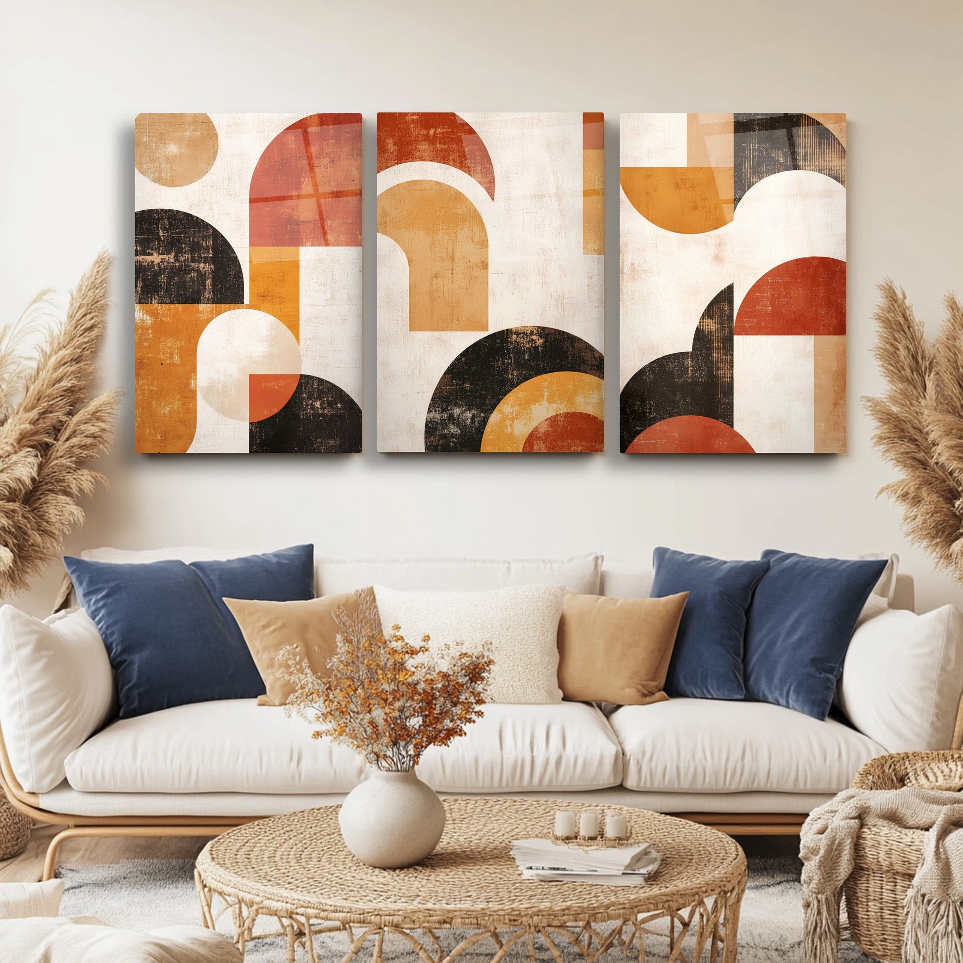Kahverengi ve sarı tonların geometrik uyumuyla tasarlanan bu büyük boy kırılmaz cam tablo seti, modern boho tarzını yansıtarak salonlara sıcak ve şık bir dokunuş katar. Soyut desenleriyle sade ama dikkat çekici bir atmosfer oluşturur. Temperli cam yüzeyi uzun ömürlü kullanım sağlar. Minimalist çizgilerle estetik denge kurmak isteyenler için ideal bir dekorasyon tamamlayıcısıdır.