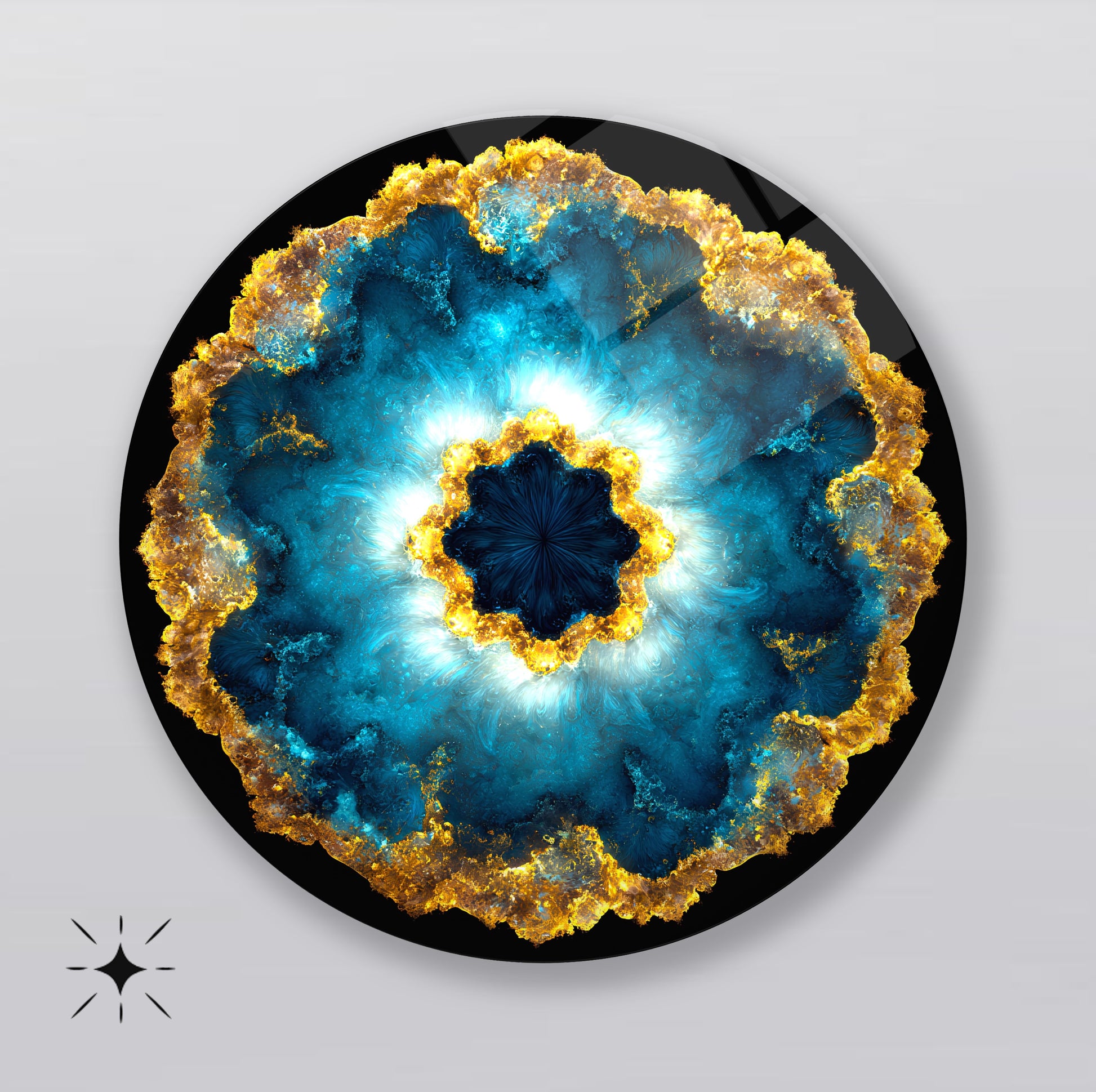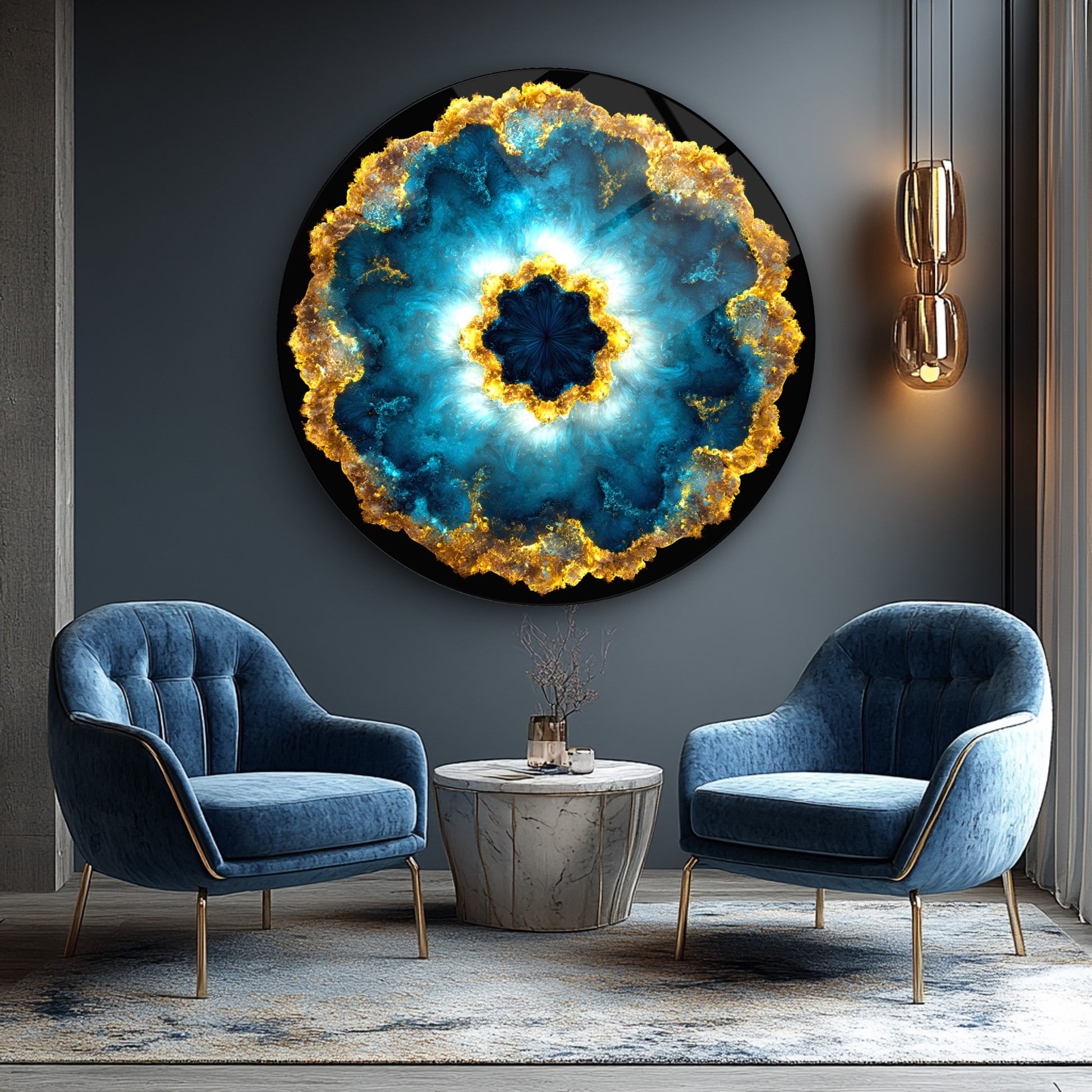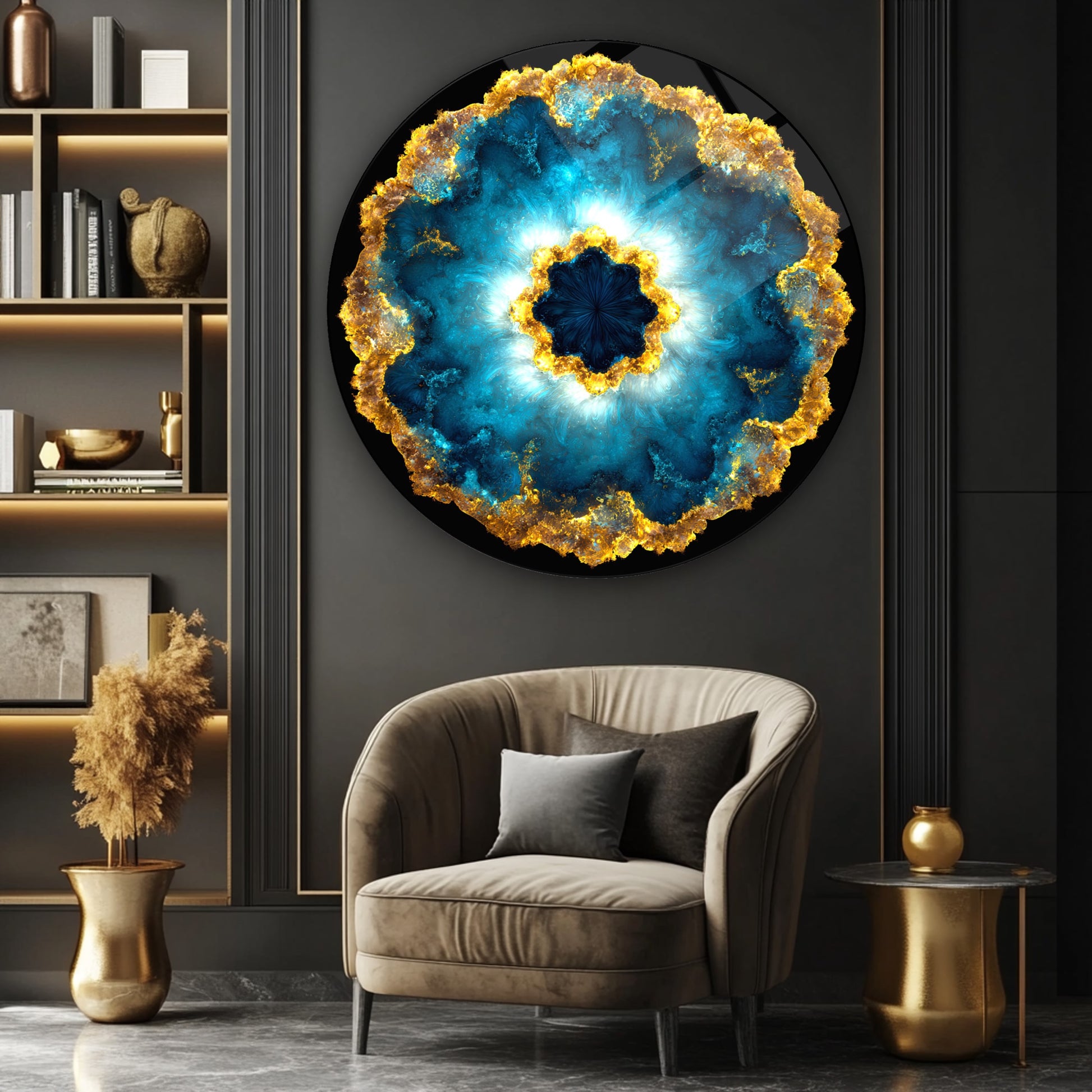 Soyut Gold Mavi Yuvarlak Cam Tablo