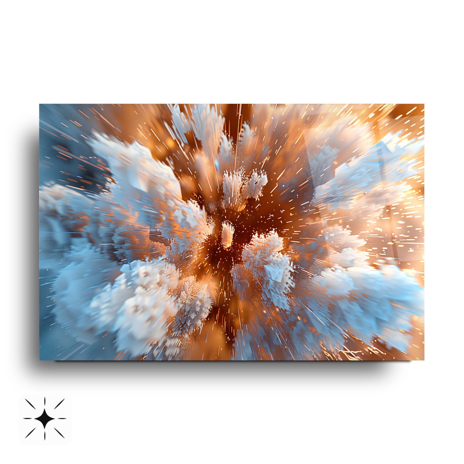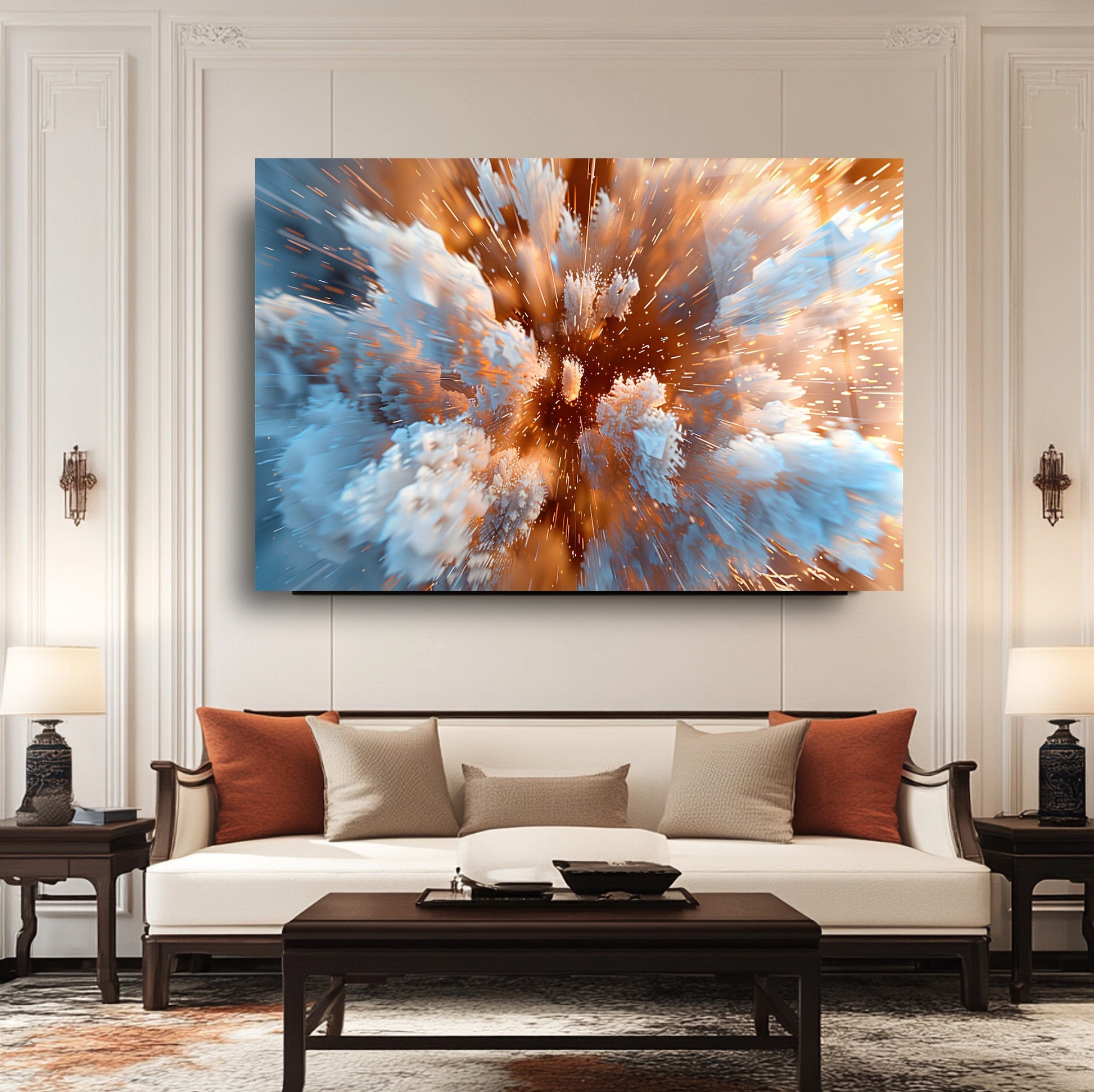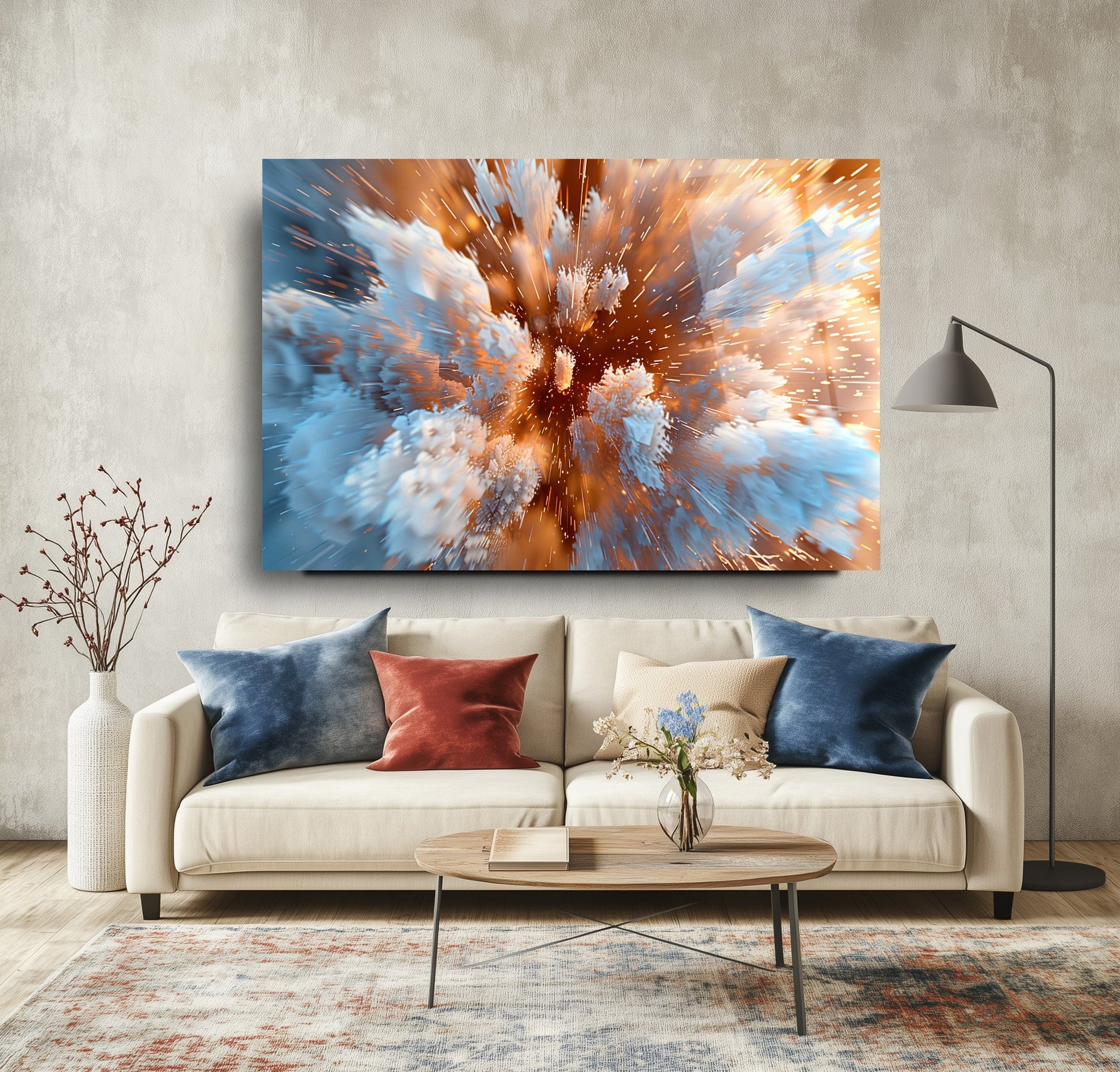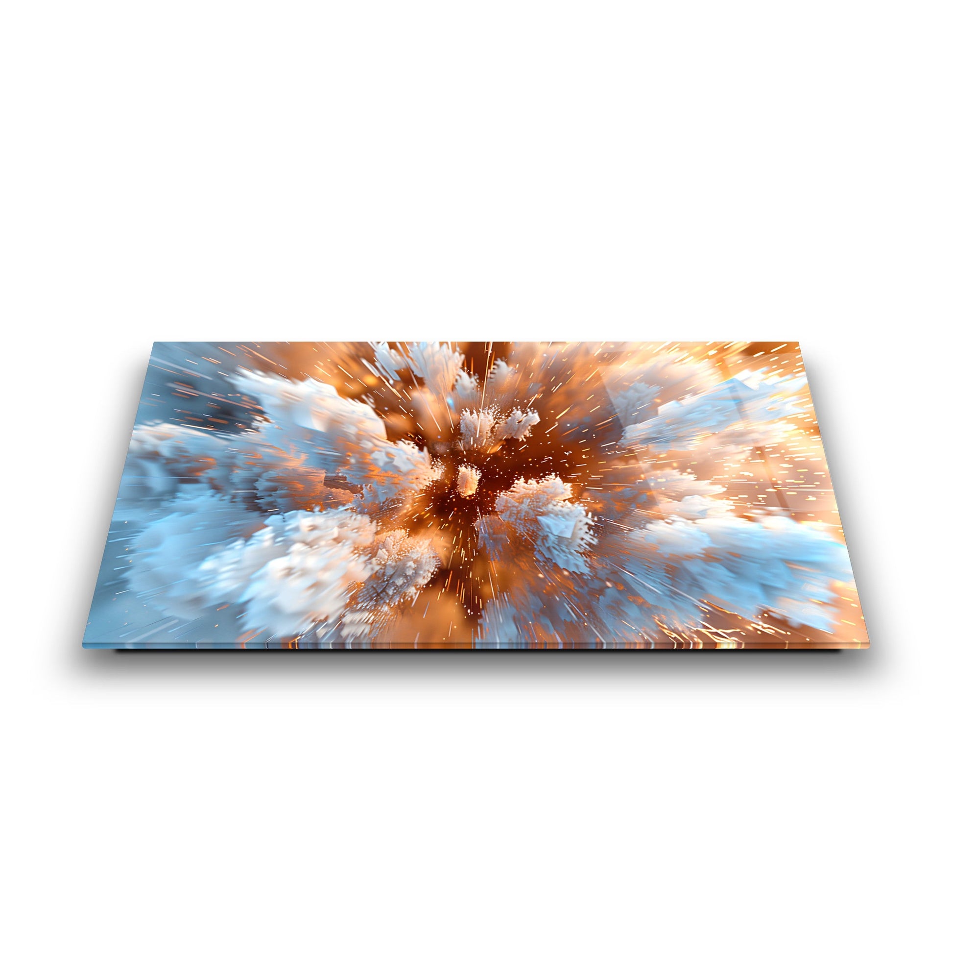 Bu etkileyici cam tabloda; mavinin soğuk yansımalarıyla karşıtlık oluşturan altın patlama deseni, bir enerji ve hareket patlamasını andırıyor. Duman gibi yayılan soyut formlar, mekânınıza çağdaş bir sanat esintisi getirirken duvarlarda güçlü bir odak noktası oluşturuyor. Minimalist çerçevesiz tasarımı, canlı UV baskıyla birleşince uzun ömürlü ve solmayan bir görsel sunuyor. Modern salon, ofis veya antre gibi alanlarda dikkat çekici bir dekoratif vurgu arayanlar için ideal seçimdir.