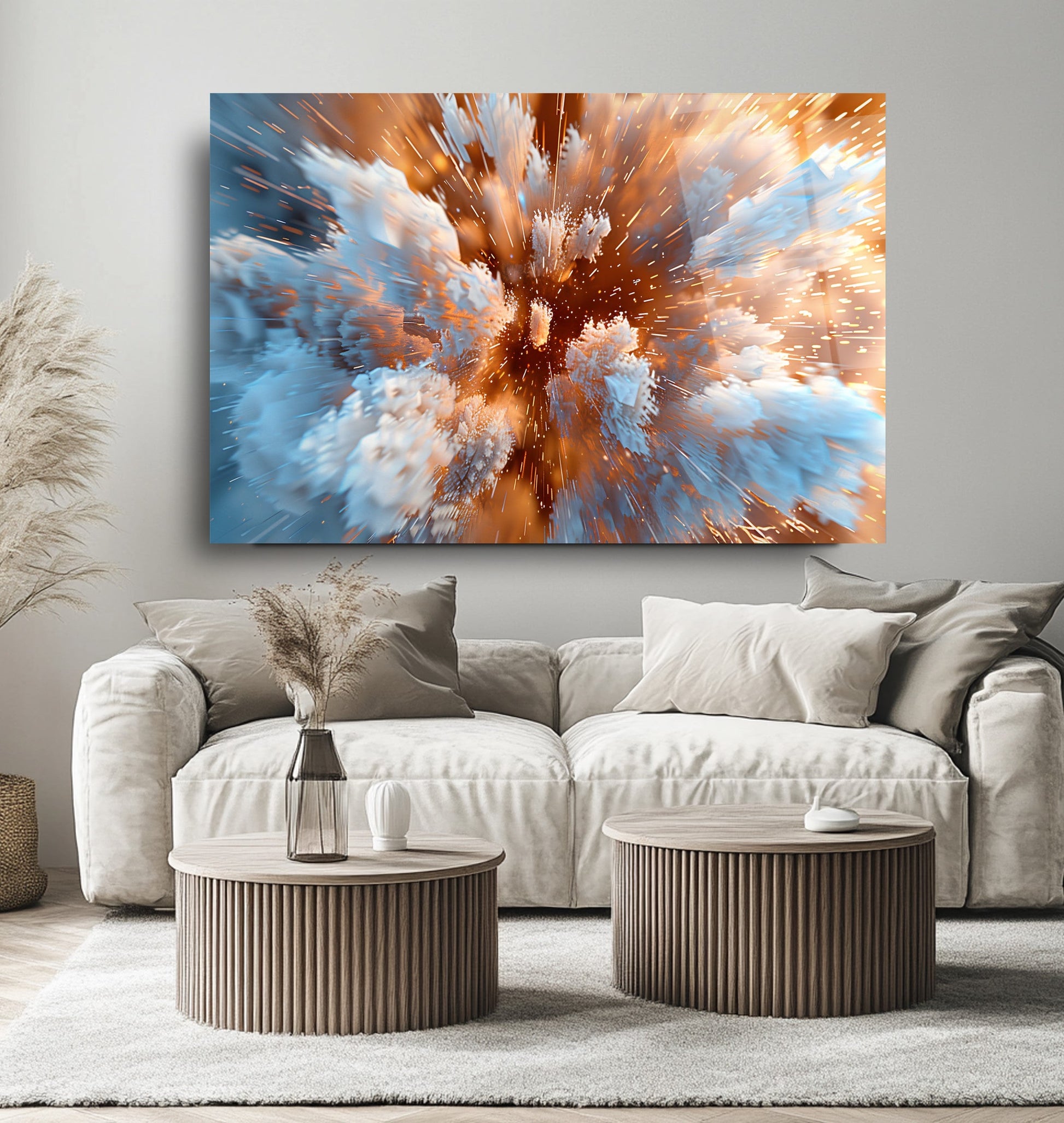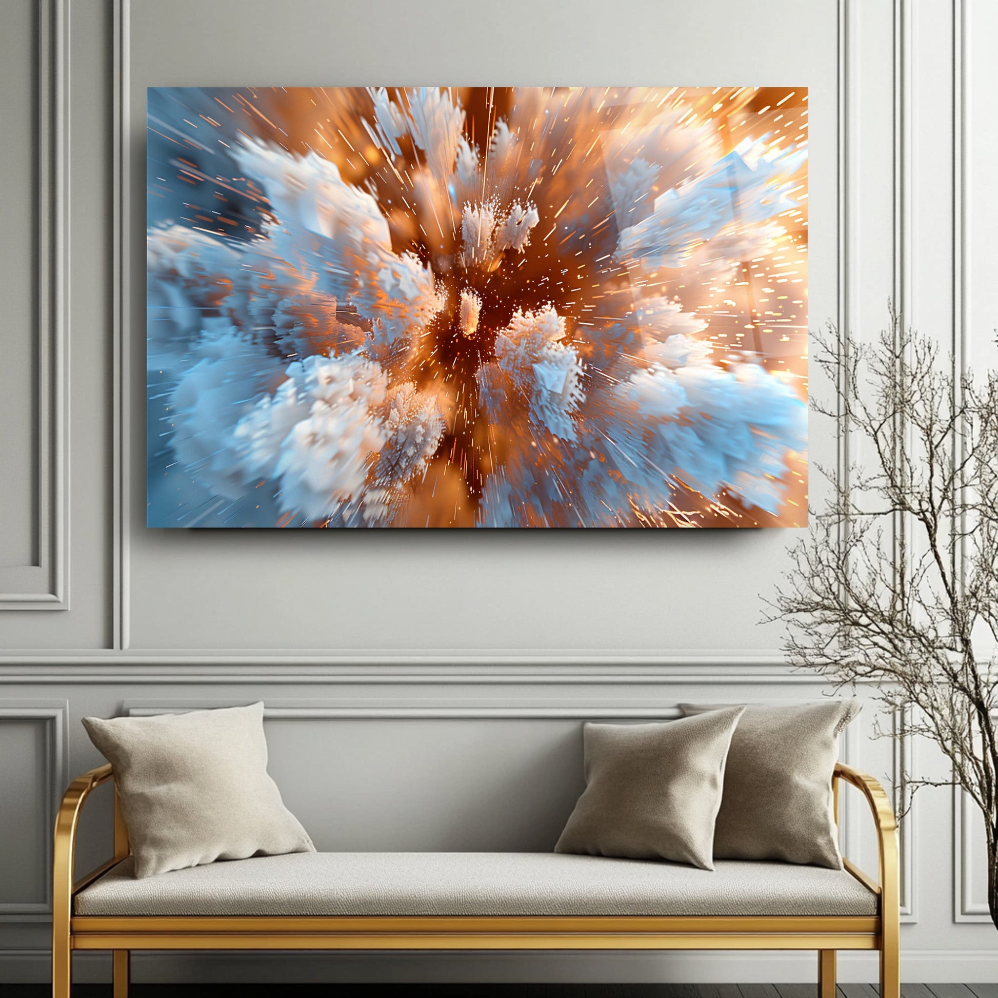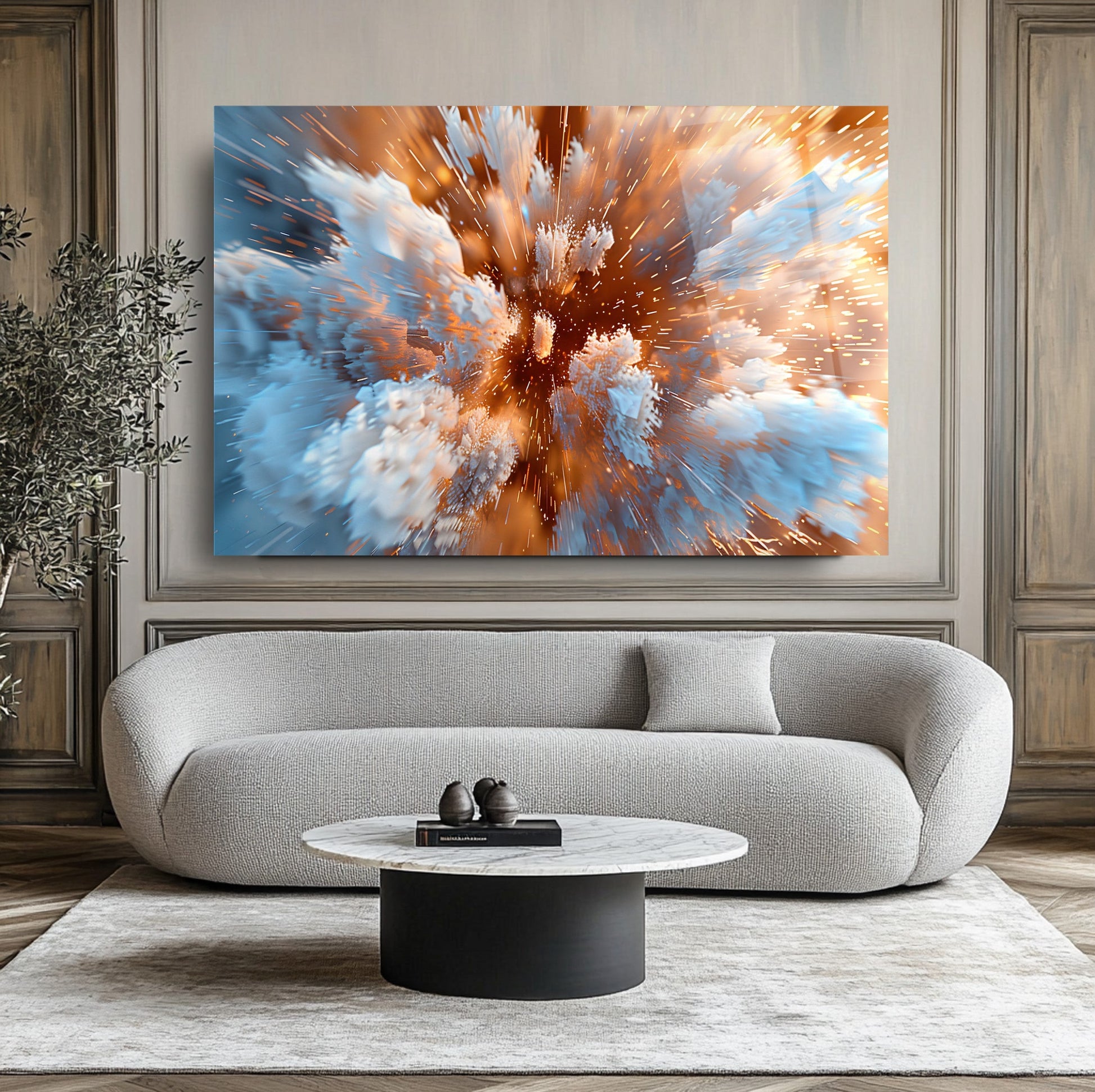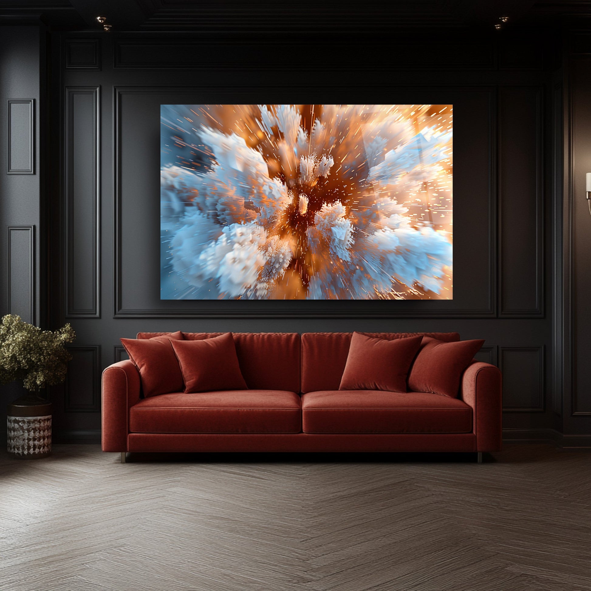 Bu etkileyici cam tabloda; mavinin soğuk yansımalarıyla karşıtlık oluşturan altın patlama deseni, bir enerji ve hareket patlamasını andırıyor. Duman gibi yayılan soyut formlar, mekânınıza çağdaş bir sanat esintisi getirirken duvarlarda güçlü bir odak noktası oluşturuyor. Minimalist çerçevesiz tasarımı, canlı UV baskıyla birleşince uzun ömürlü ve solmayan bir görsel sunuyor. Modern salon, ofis veya antre gibi alanlarda dikkat çekici bir dekoratif vurgu arayanlar için ideal seçimdir.