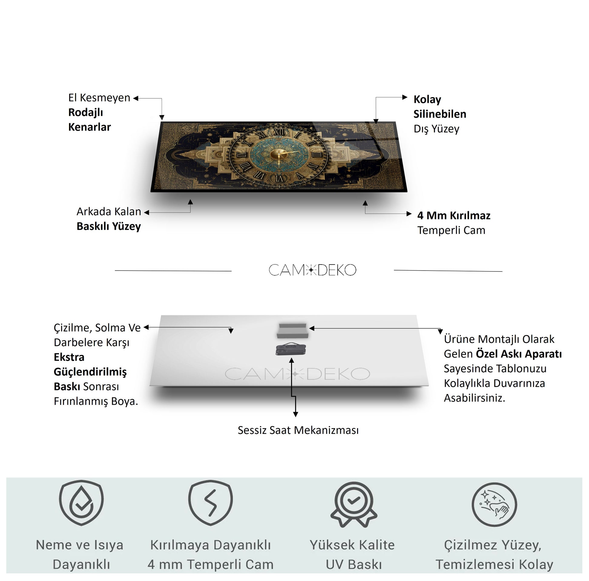 Cam saatlerimiz, son teknoloji UV baskı makineleriyle doğrudan cama uygulanır. Kağıt veya folyo yapıştırma kullanılmaz; baskılar camın arka yüzeyine işlenerek uzun ömürlü ve dayanıklı hale getirilir. Ek olarak, fırınlama boya işlemi ile güçlendirilerek solmaya ve deformasyona karşı ekstra koruma sağlanır.