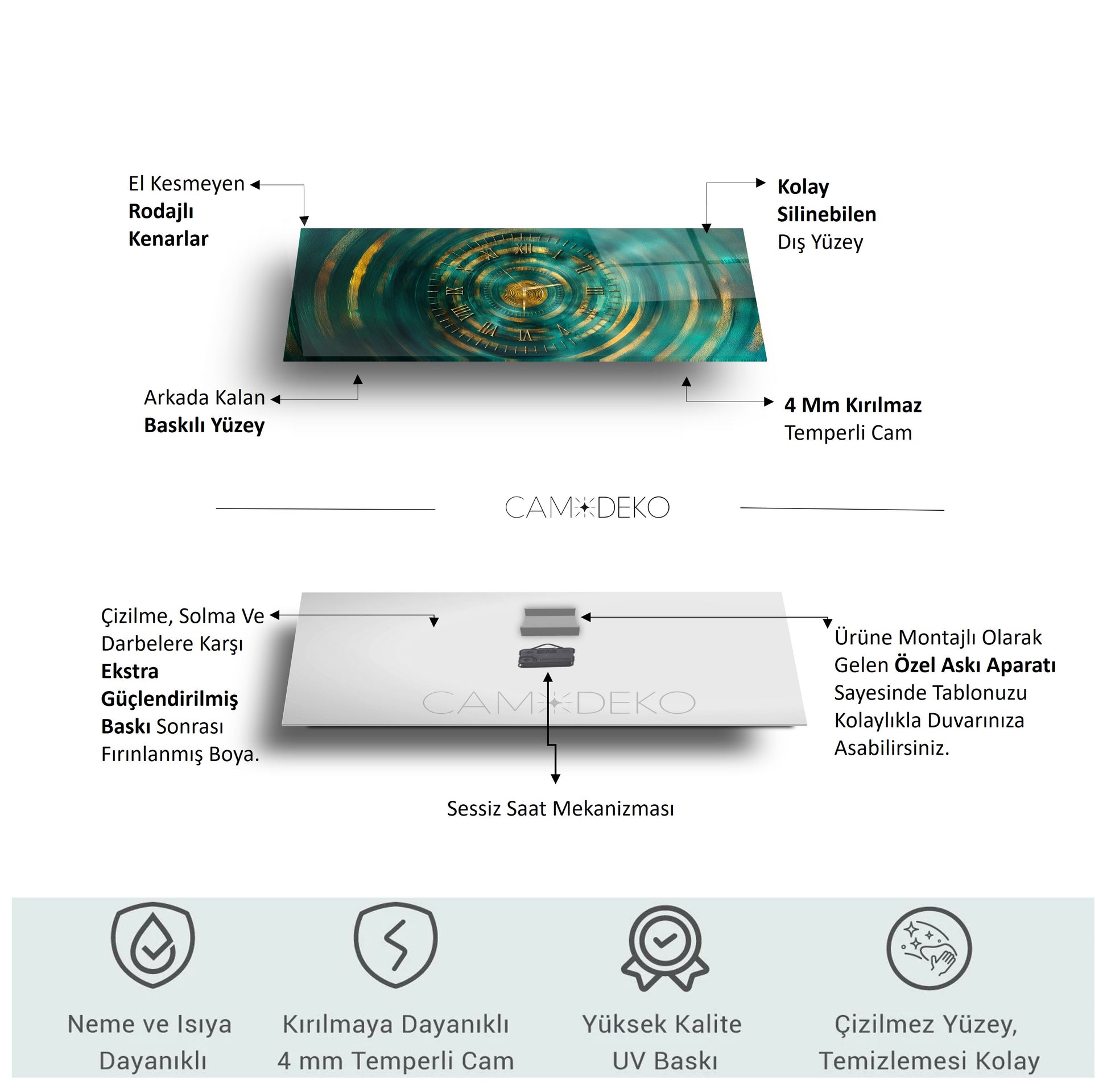 Cam saatlerimiz, son teknoloji UV baskı makineleriyle doğrudan cama uygulanır. Kağıt veya folyo yapıştırma kullanılmaz; baskılar camın arka yüzeyine işlenerek uzun ömürlü ve dayanıklı hale getirilir. Ek olarak, fırınlama boya işlemi ile güçlendirilerek solmaya ve deformasyona karşı ekstra koruma sağlanır.
