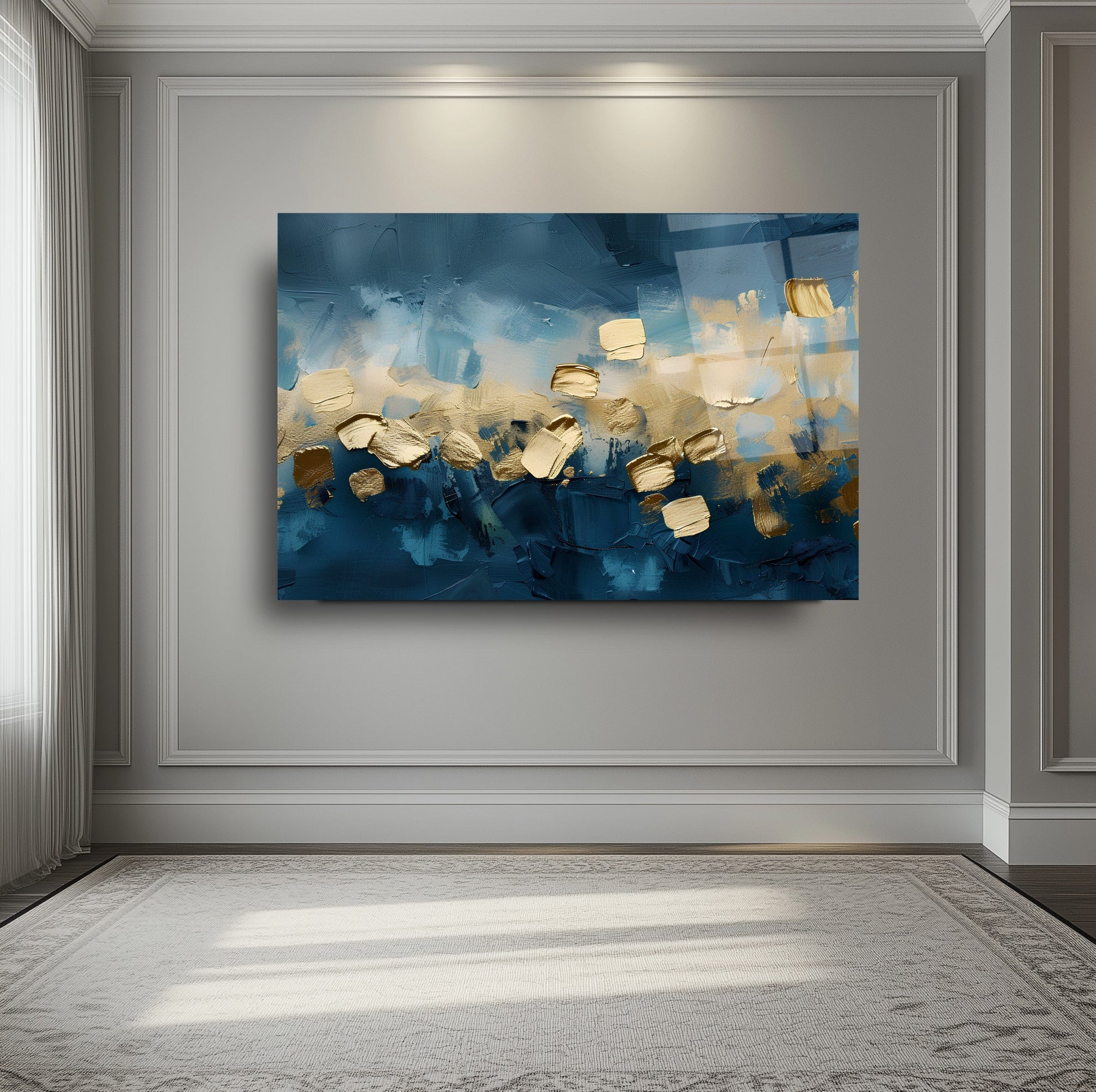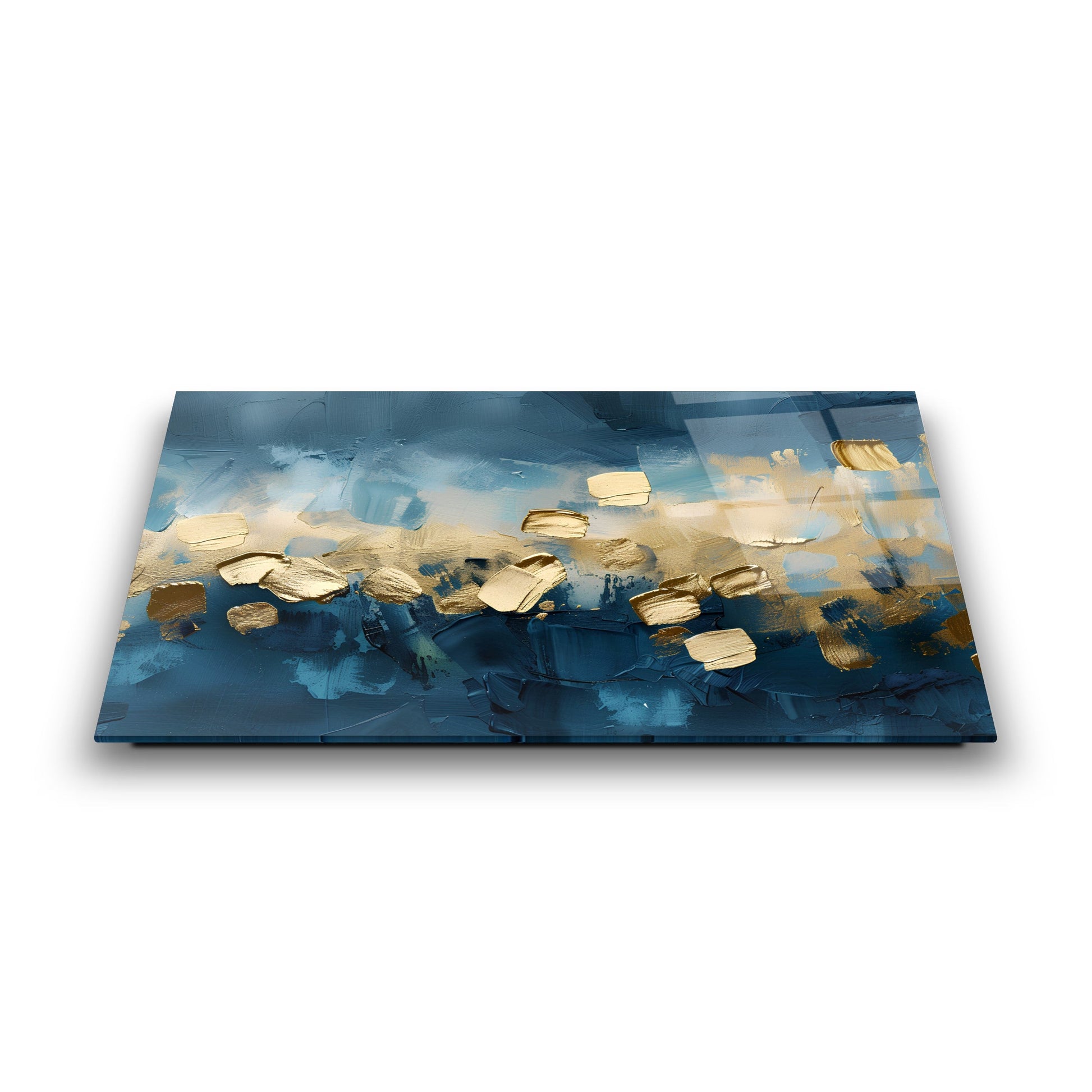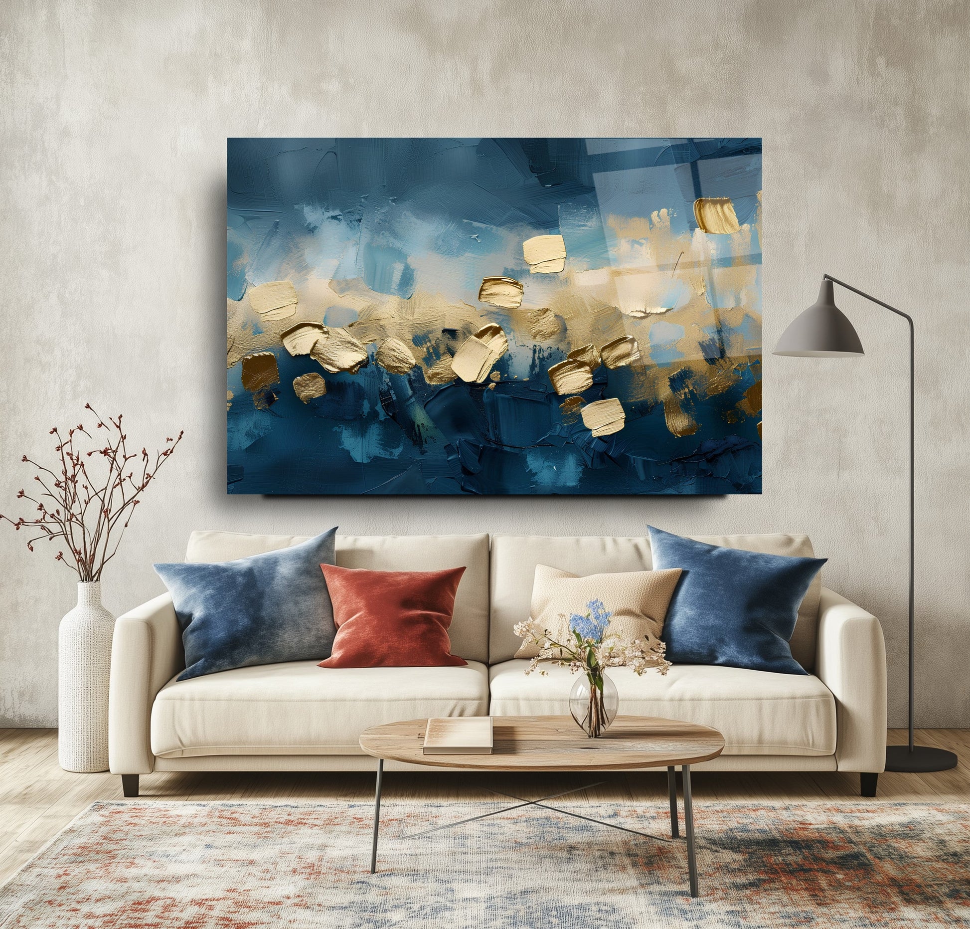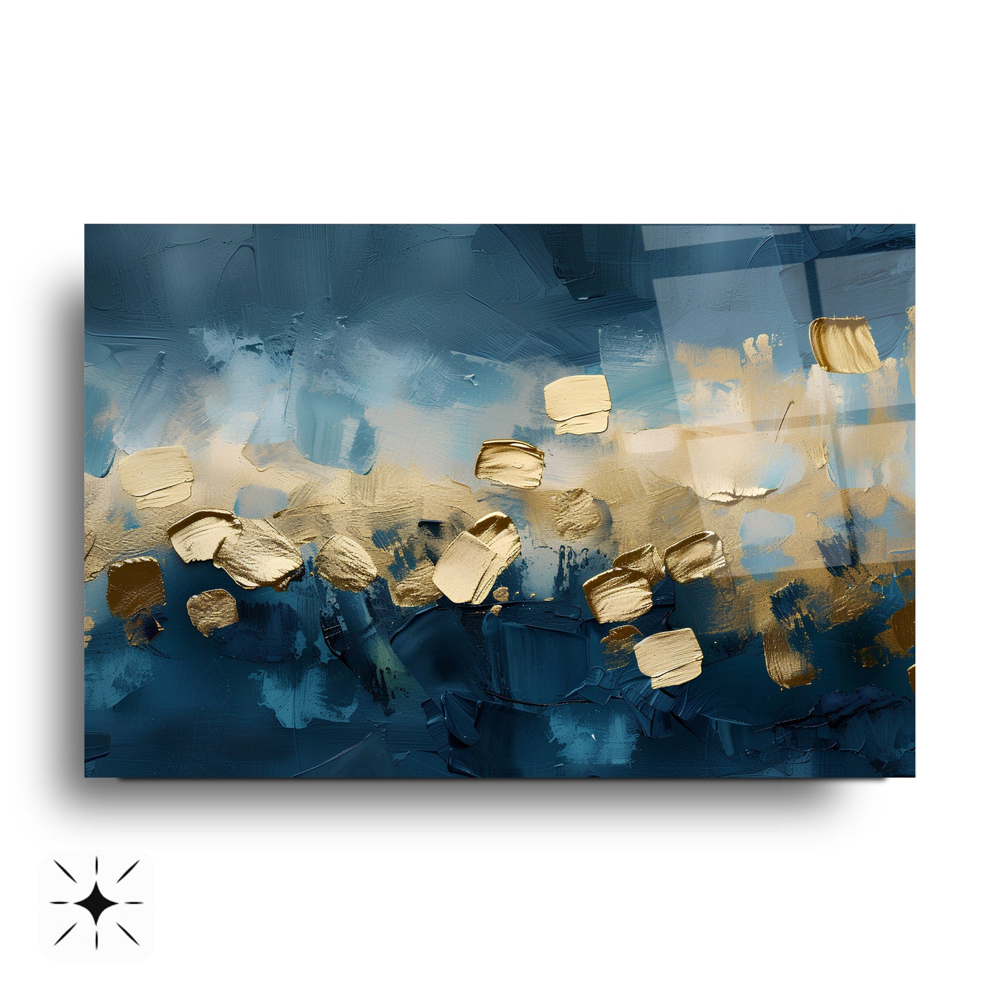 Derin mavi zemin üzerinde altın dokunuşlarla şekillenmiş soyut desenler, bu cam tabloyu modern mekanlar için güçlü bir görsel vurgu haline getiriyor. Temperli cam yüzeyi ve HD UV baskı teknolojisi sayesinde renkler solmadan uzun süre canlı kalır. Minimal çerçevesiz tasarımıyla salon, ofis veya antre gibi yaşam alanlarına zarafet ve stil katar. Modern duvar dekoru, soyut cam baskı arayanlar için ideal bir tercih.