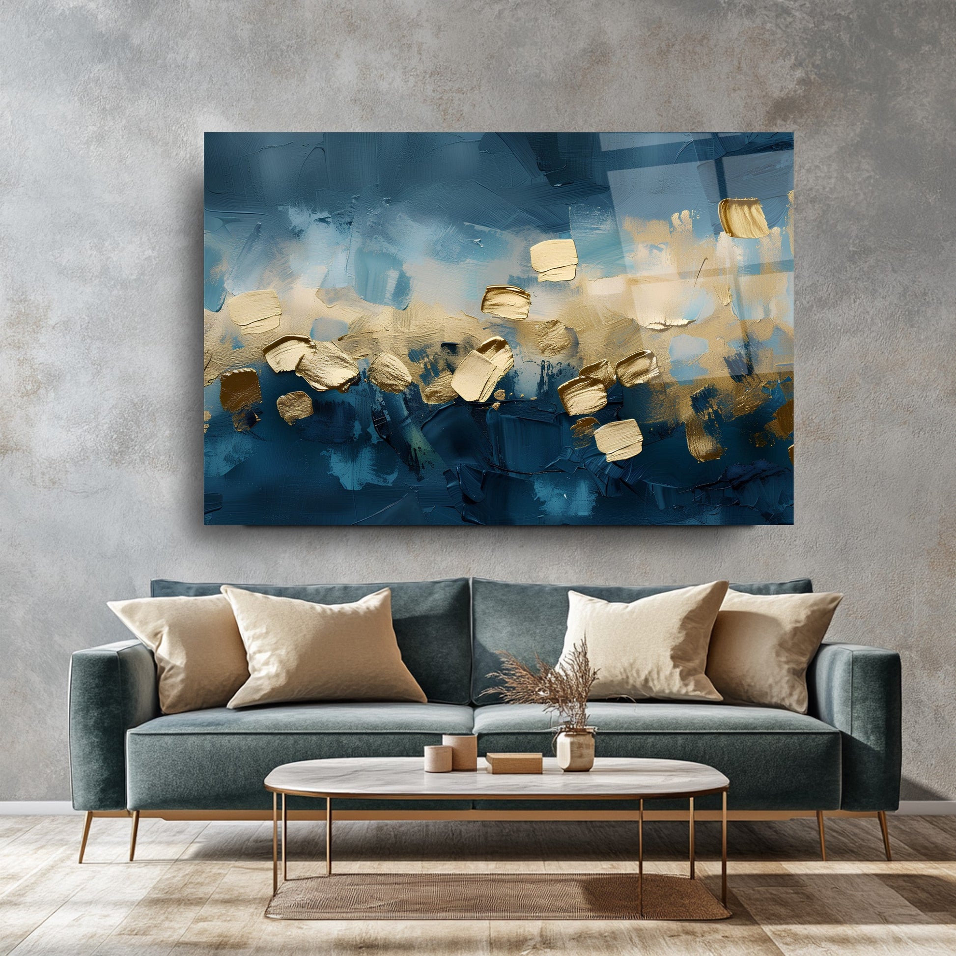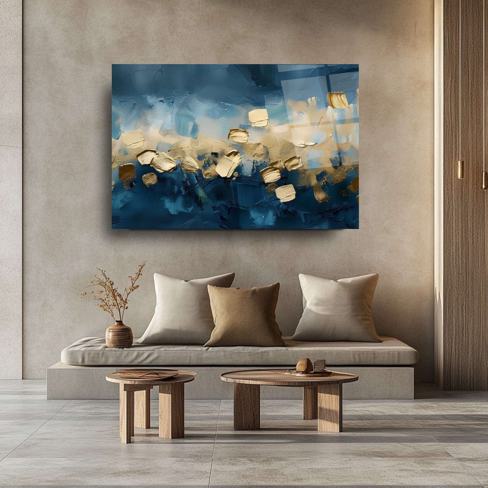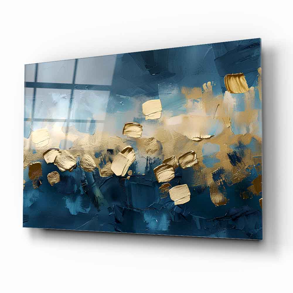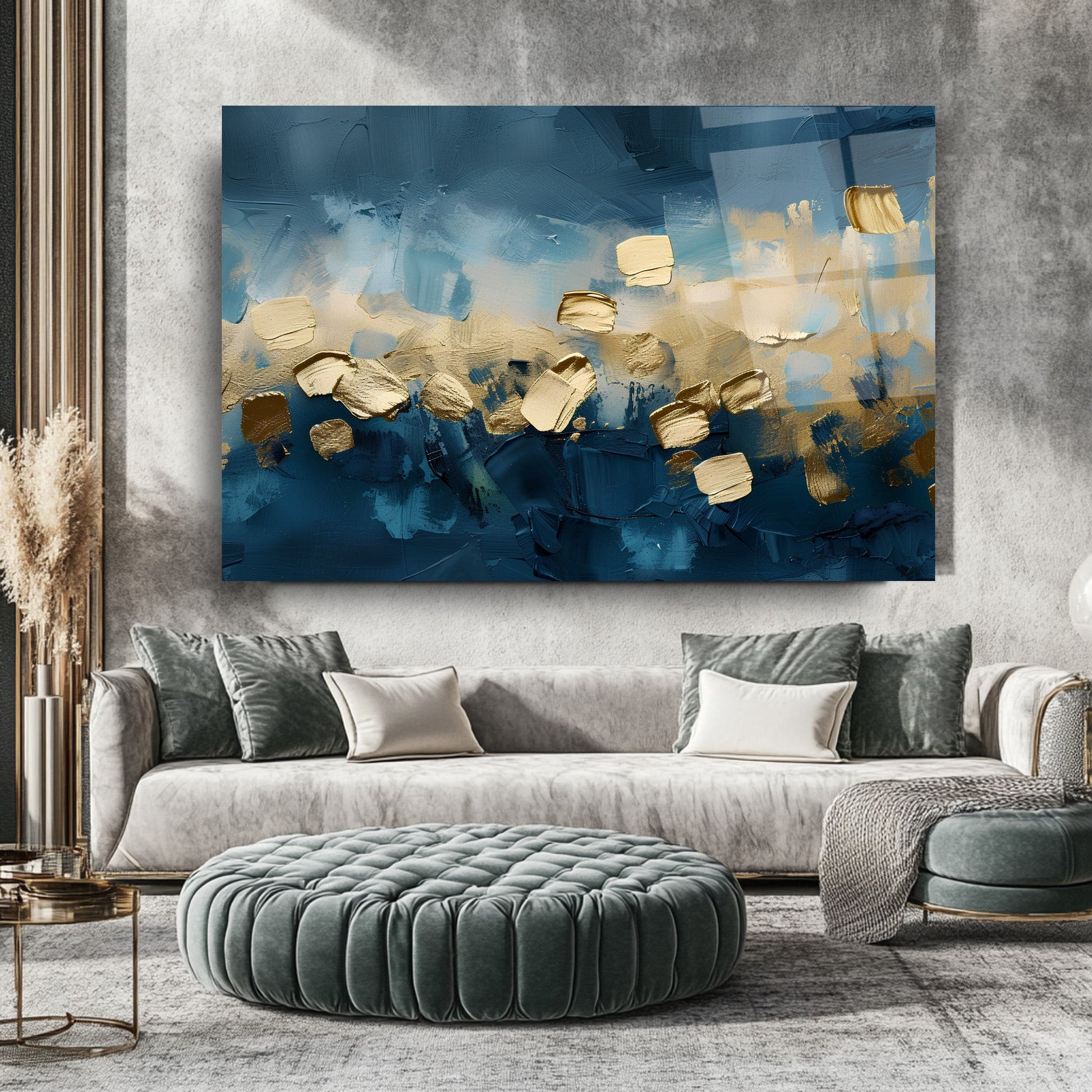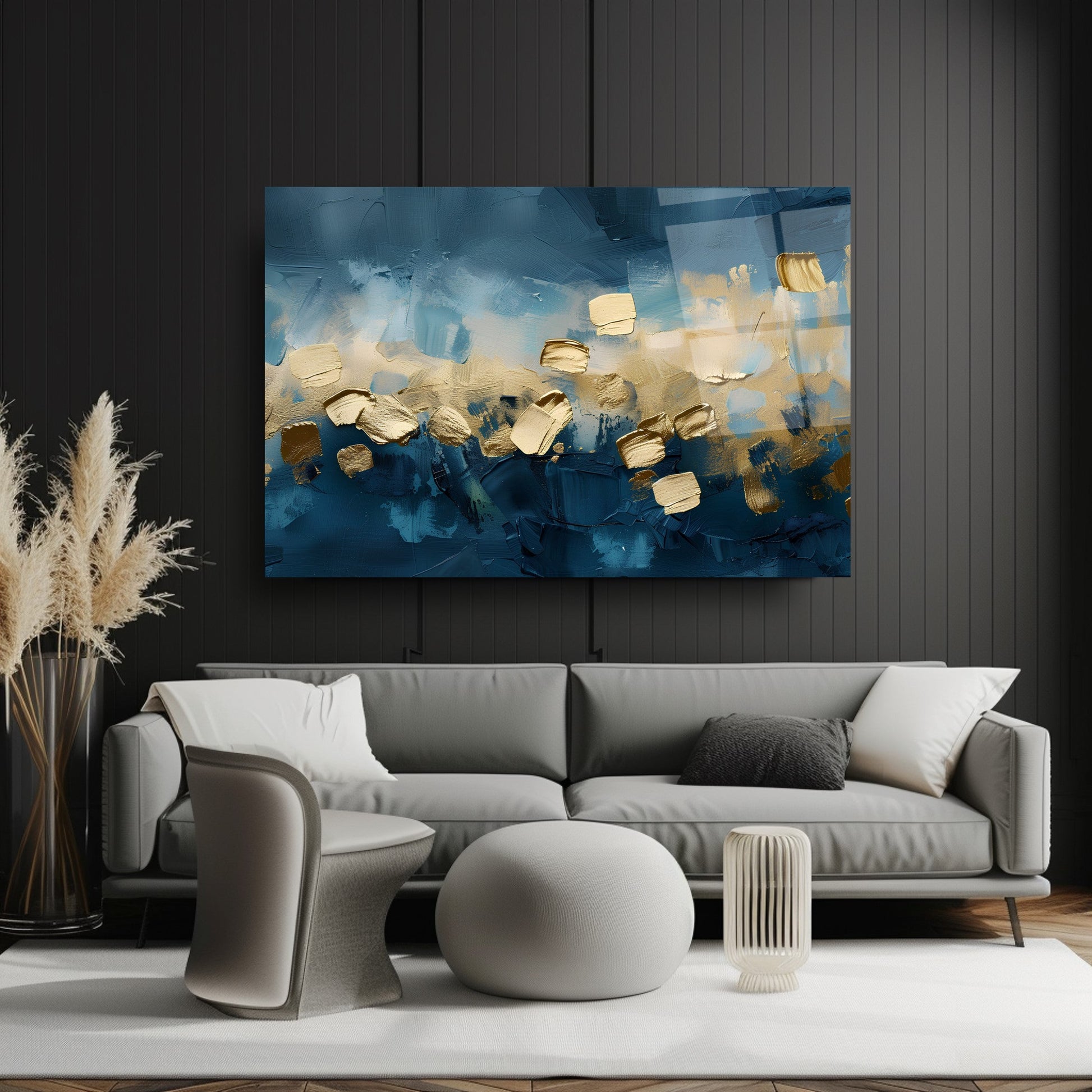 Derin mavi zemin üzerinde altın dokunuşlarla şekillenmiş soyut desenler, bu cam tabloyu modern mekanlar için güçlü bir görsel vurgu haline getiriyor. Temperli cam yüzeyi ve HD UV baskı teknolojisi sayesinde renkler solmadan uzun süre canlı kalır. Minimal çerçevesiz tasarımıyla salon, ofis veya antre gibi yaşam alanlarına zarafet ve stil katar. Modern duvar dekoru, soyut cam baskı arayanlar için ideal bir tercih.
