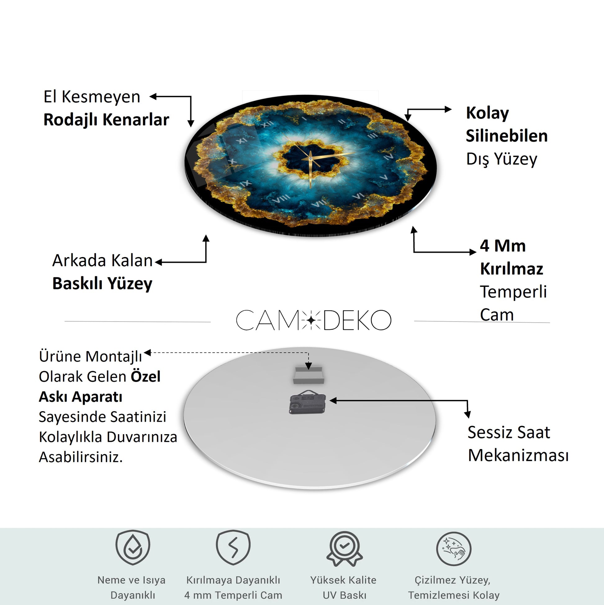 Saatlerimizde 4 mm kalınlığında ultra clear temperli cam kullanılır. Rodajlanmış (el kesmeyen) kenarları, hem güvenli hem de estetik bir görünüm sunar. Zamansız tasarımıyla ev ve ofis dekorasyonuna şıklık katar.