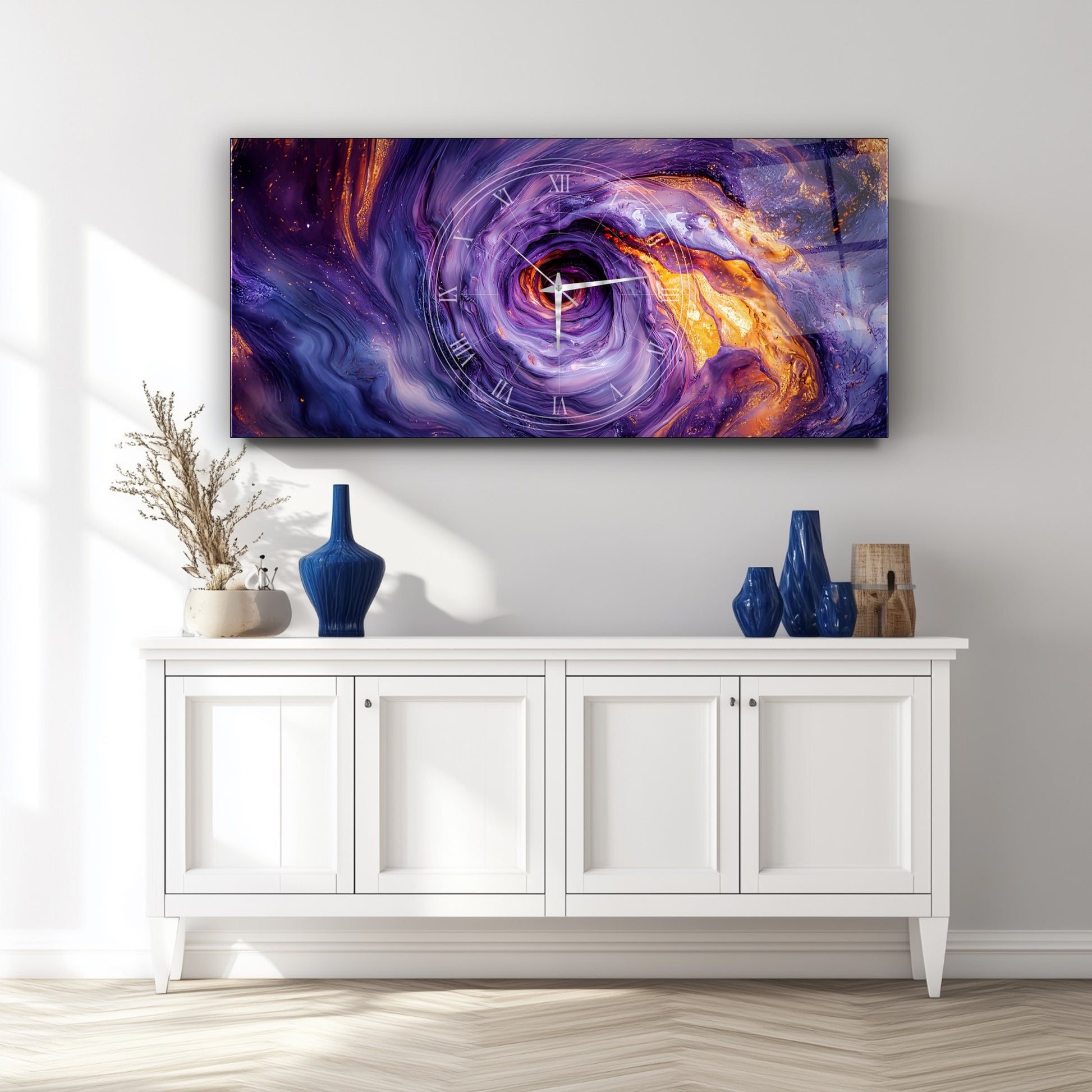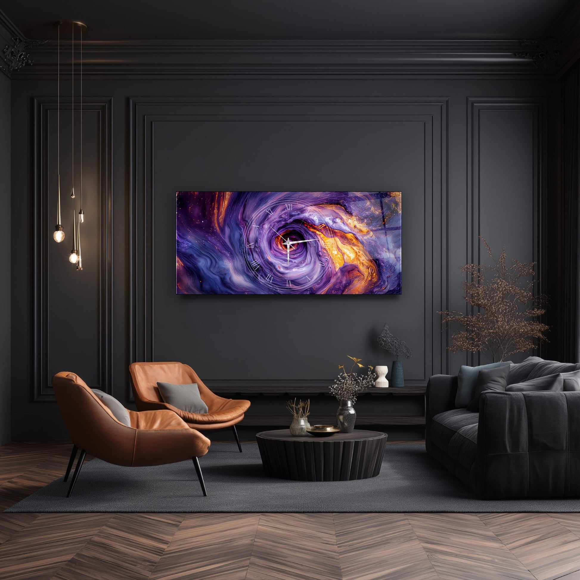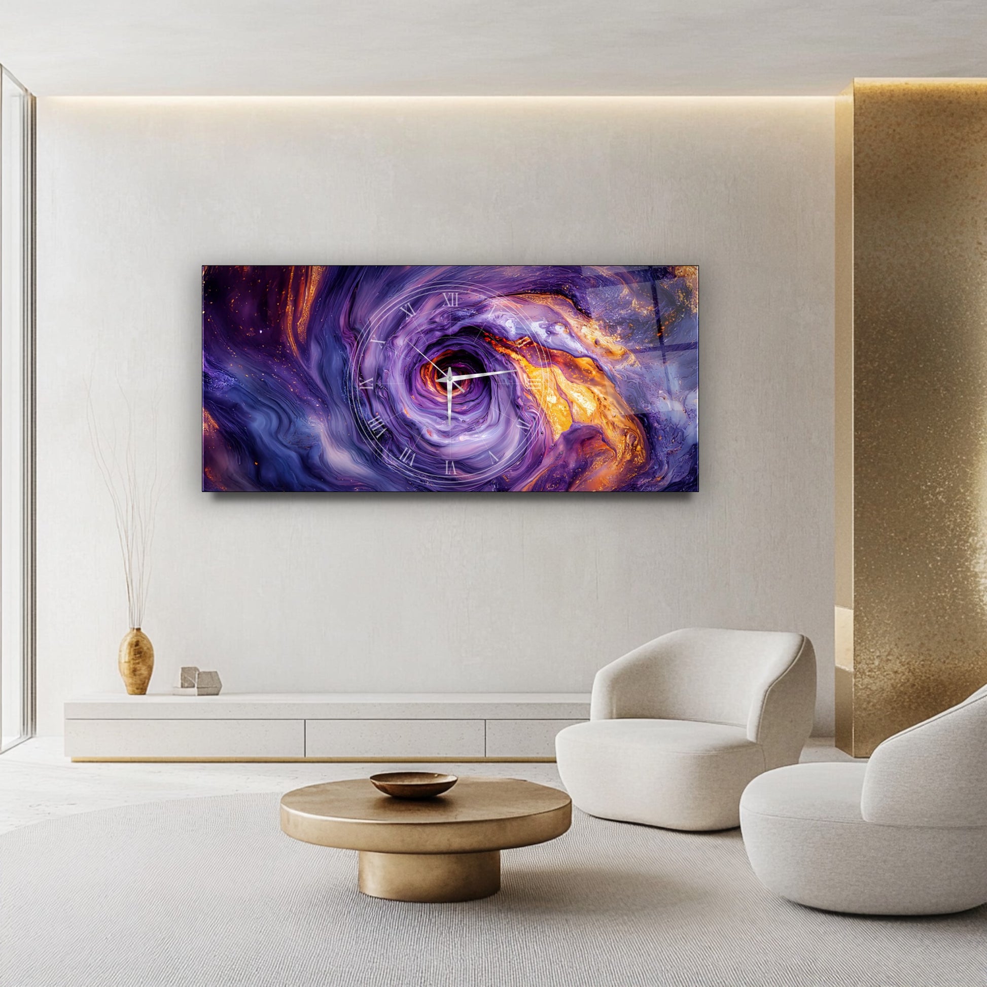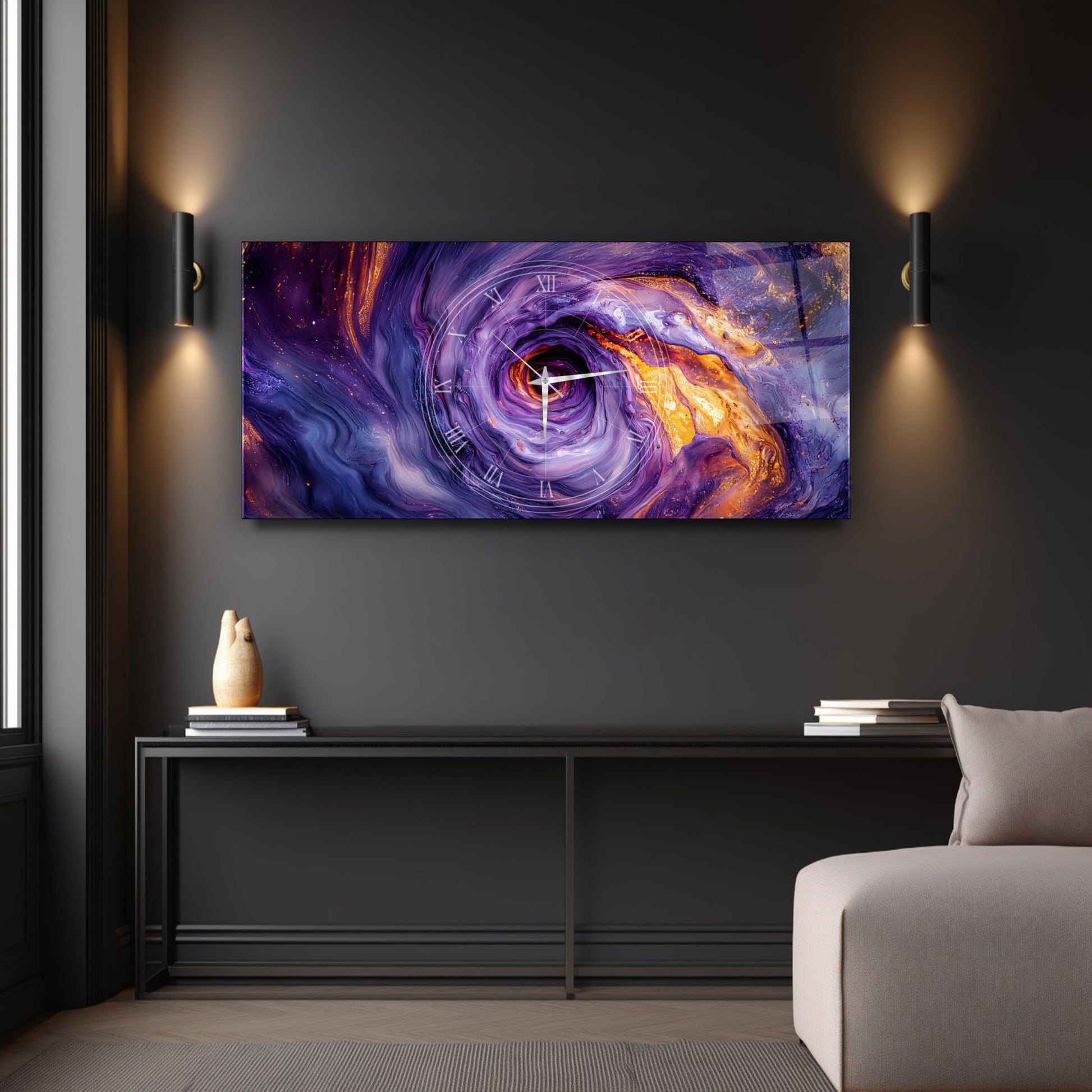 Soyut Mor Girdap Cam Duvar Saati