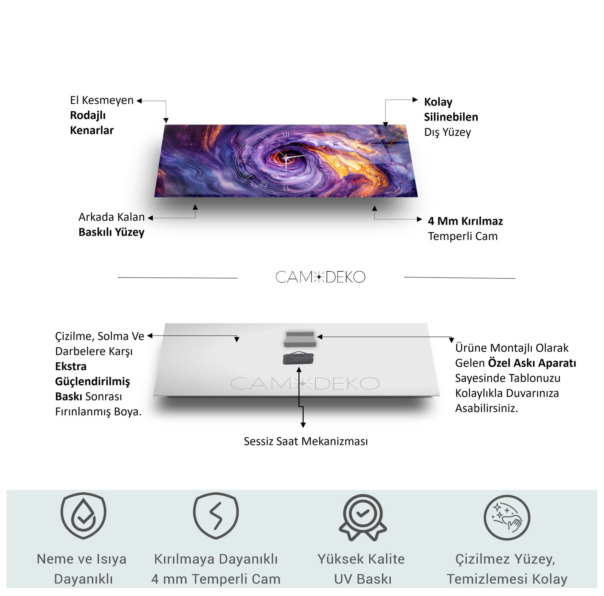 Cam saatlerimiz, son teknoloji UV baskı makineleriyle doğrudan cama uygulanır. Kağıt veya folyo yapıştırma kullanılmaz; baskılar camın arka yüzeyine işlenerek uzun ömürlü ve dayanıklı hale getirilir. Ek olarak, fırınlama boya işlemi ile güçlendirilerek solmaya ve deformasyona karşı ekstra koruma sağlanır.