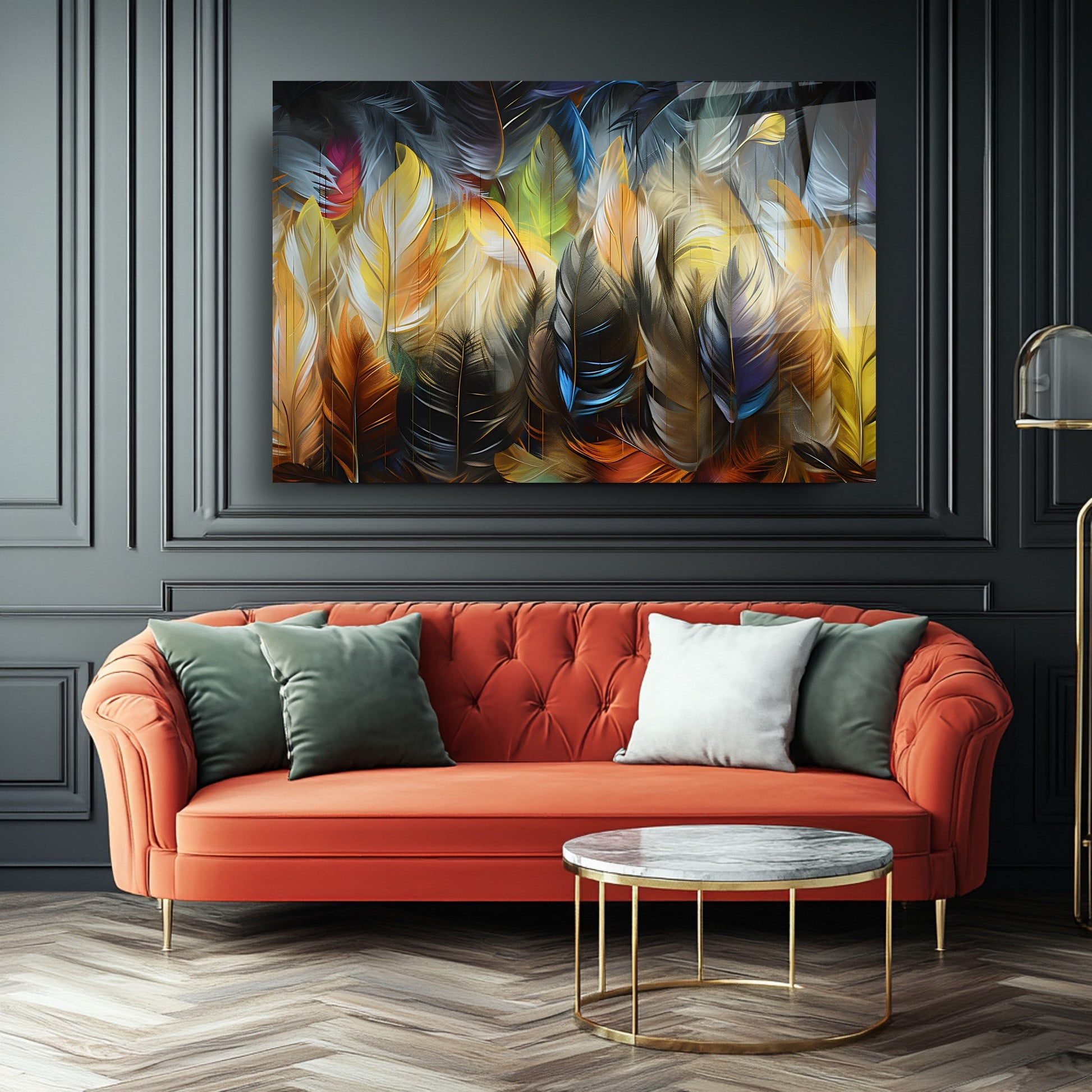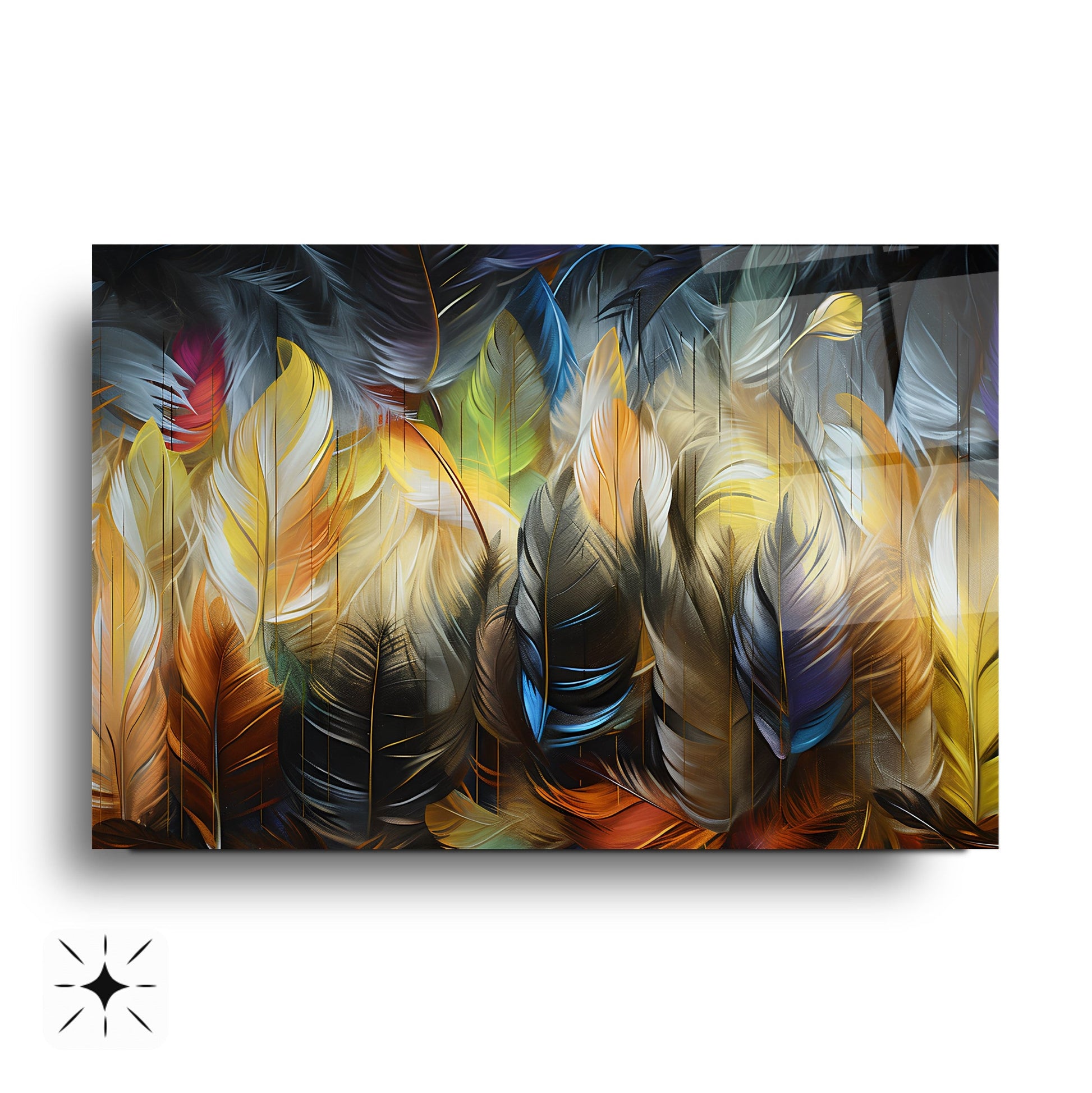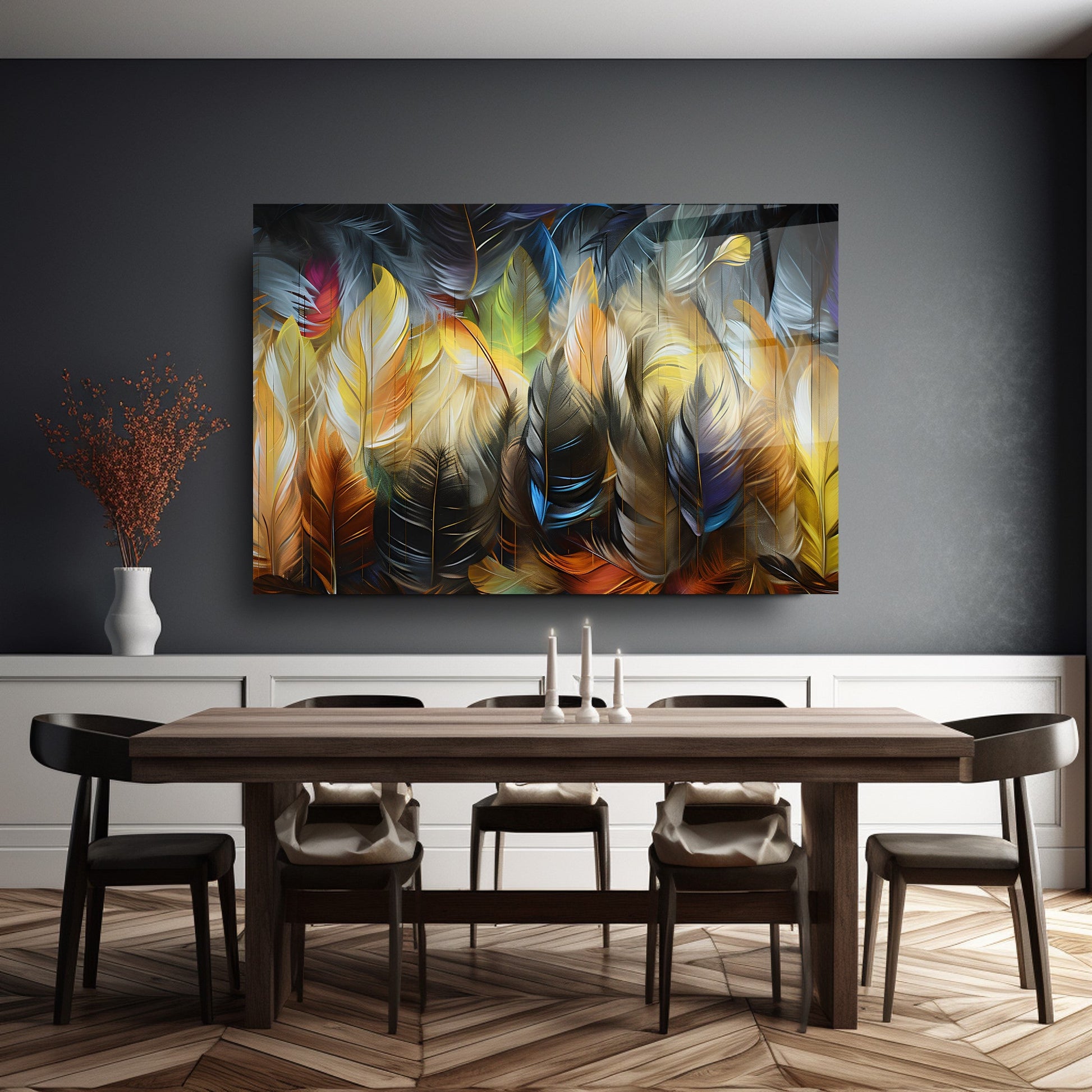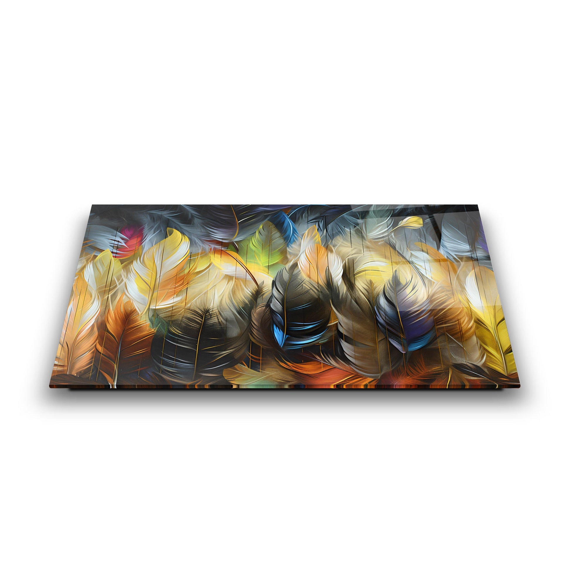 Canlı pembe, turuncu, mavi tonlarında soyut tüy desenlerinin büyüleyici uyumu, bu modern cam tabloyu sanatsal bir vurguya dönüştürüyor. HD UV baskı ile temperli cam yüzey arasında yüzen tüy desenleri solmadan ve parlaklığını kaybetmeden mekânınıza estetik bir hava katıyor. Çerçevesiz minimalist tasarımı, salon, yatak odası ya da ofisinizde modern duvar dekoru arayanlar için ideal bir seçimdir. Duvarınızda zarafet ve enerji arayanlar için mükemmel bir tercih.