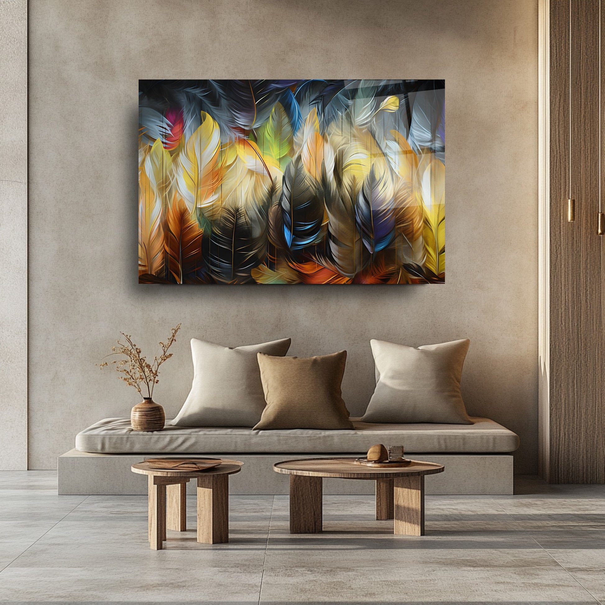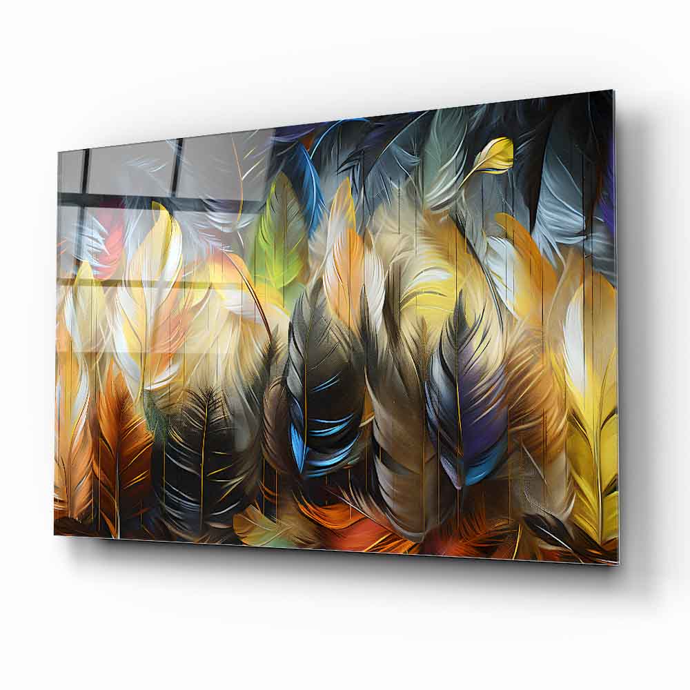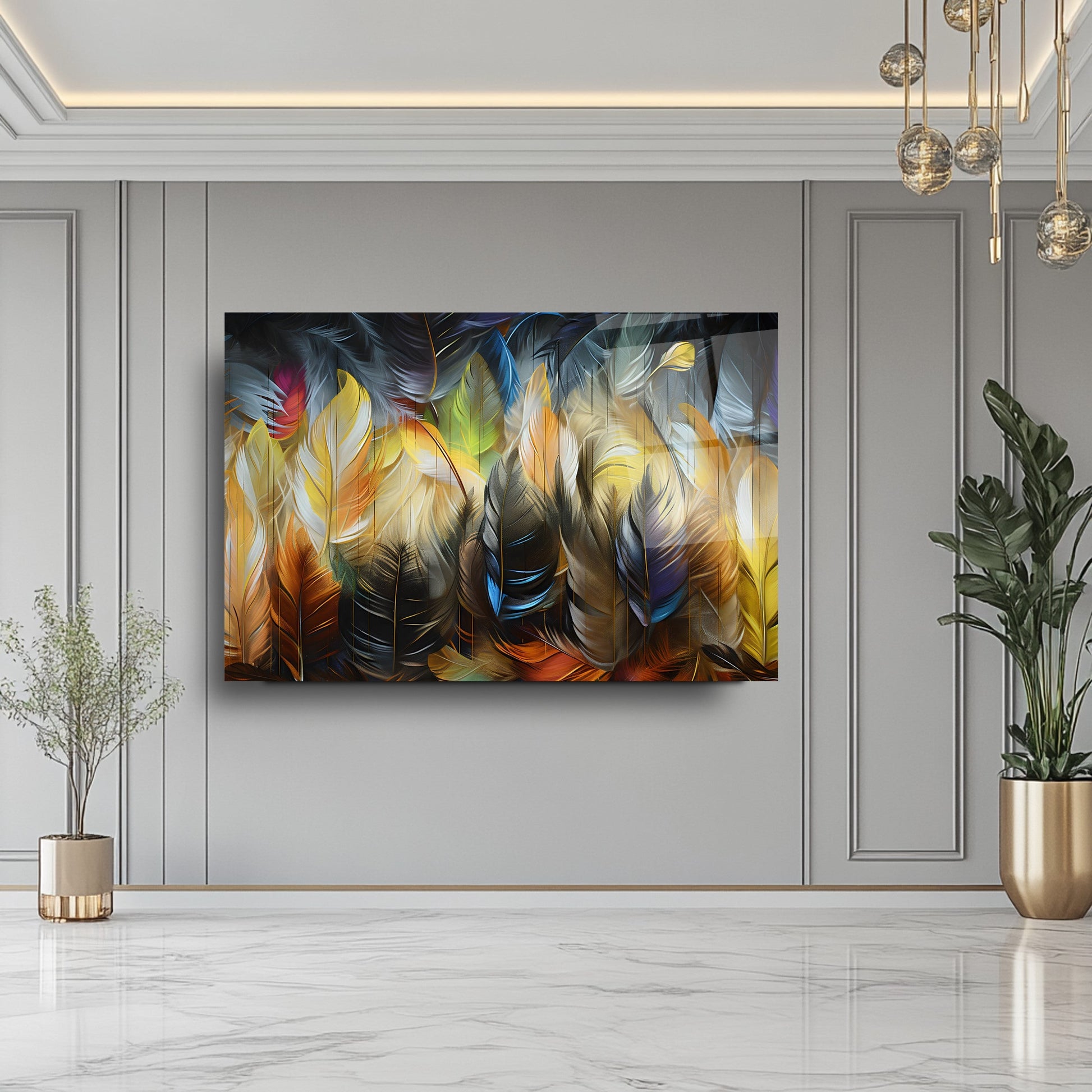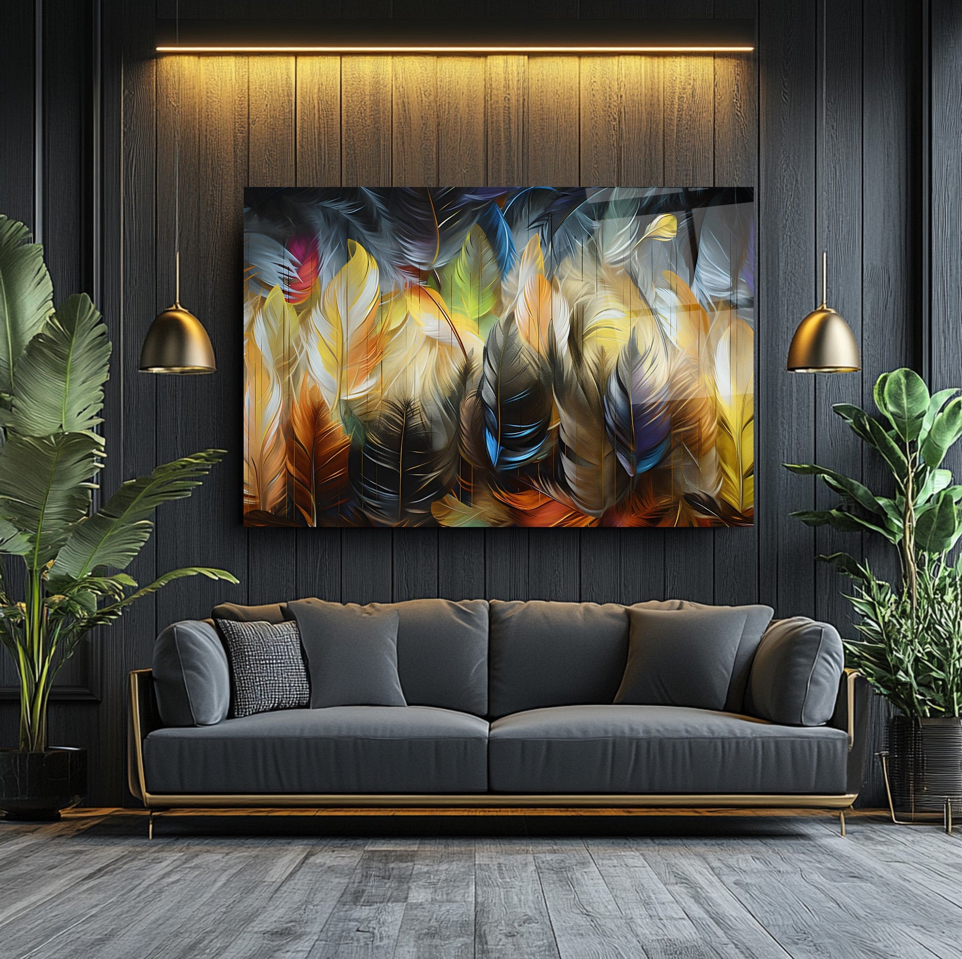 Canlı pembe, turuncu, mavi tonlarında soyut tüy desenlerinin büyüleyici uyumu, bu modern cam tabloyu sanatsal bir vurguya dönüştürüyor. HD UV baskı ile temperli cam yüzey arasında yüzen tüy desenleri solmadan ve parlaklığını kaybetmeden mekânınıza estetik bir hava katıyor. Çerçevesiz minimalist tasarımı, salon, yatak odası ya da ofisinizde modern duvar dekoru arayanlar için ideal bir seçimdir. Duvarınızda zarafet ve enerji arayanlar için mükemmel bir tercih.