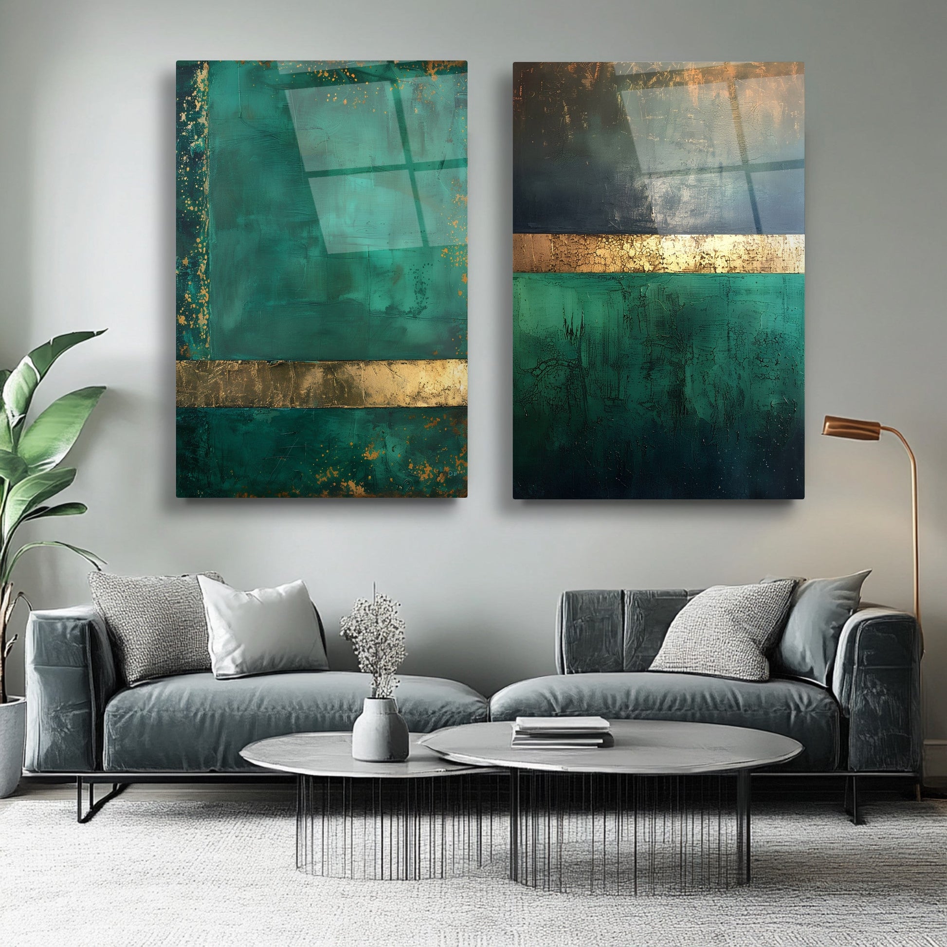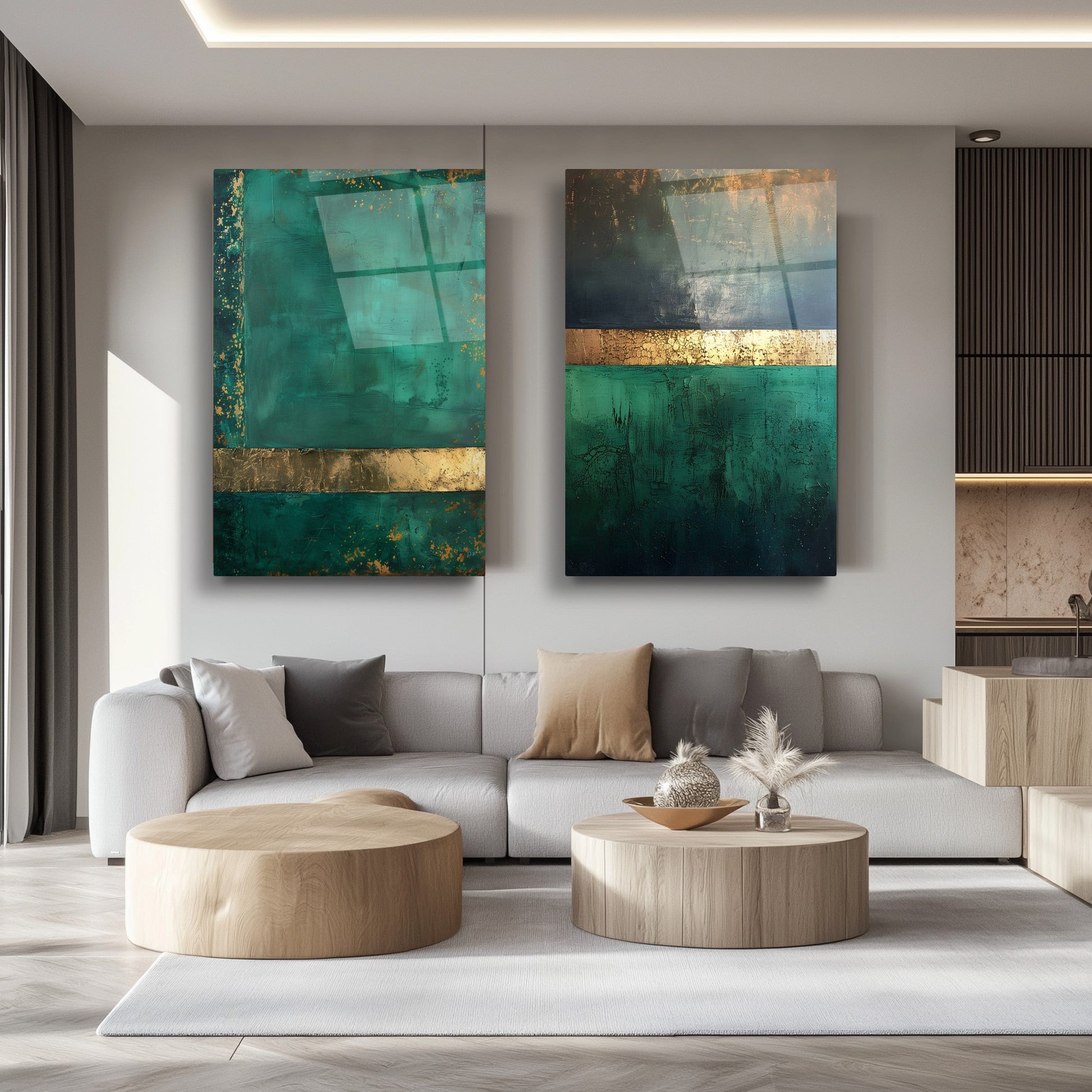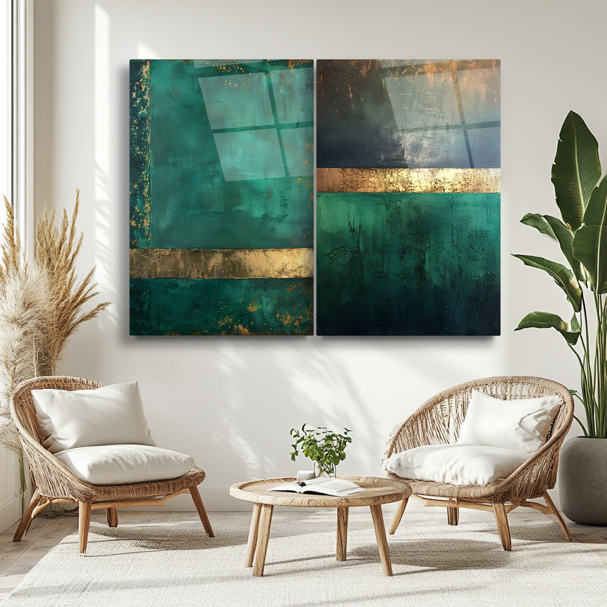Soyut yeşil ve gold tonlarının şıklığını bir araya getiren bu büyük boy ikili cam tablo seti, temperli ve kırılmaz cam üzerine UV baskı tekniğiyle hazırlanmıştır. Modern tasarımı ve canlı renkleriyle yaşam alanlarınıza zarif ve sofistike bir dokunuş katıyor. Dayanıklı yapısıyla uzun ömürlü kullanım sunan bu set, ev veya ofis dekorasyonunuza estetik bir atmosfer sağlar. CamDeko kalitesiyle tarzınızı yansıtacak bu özel tasarım, modern mekanlar için ideal bir seçimdir.