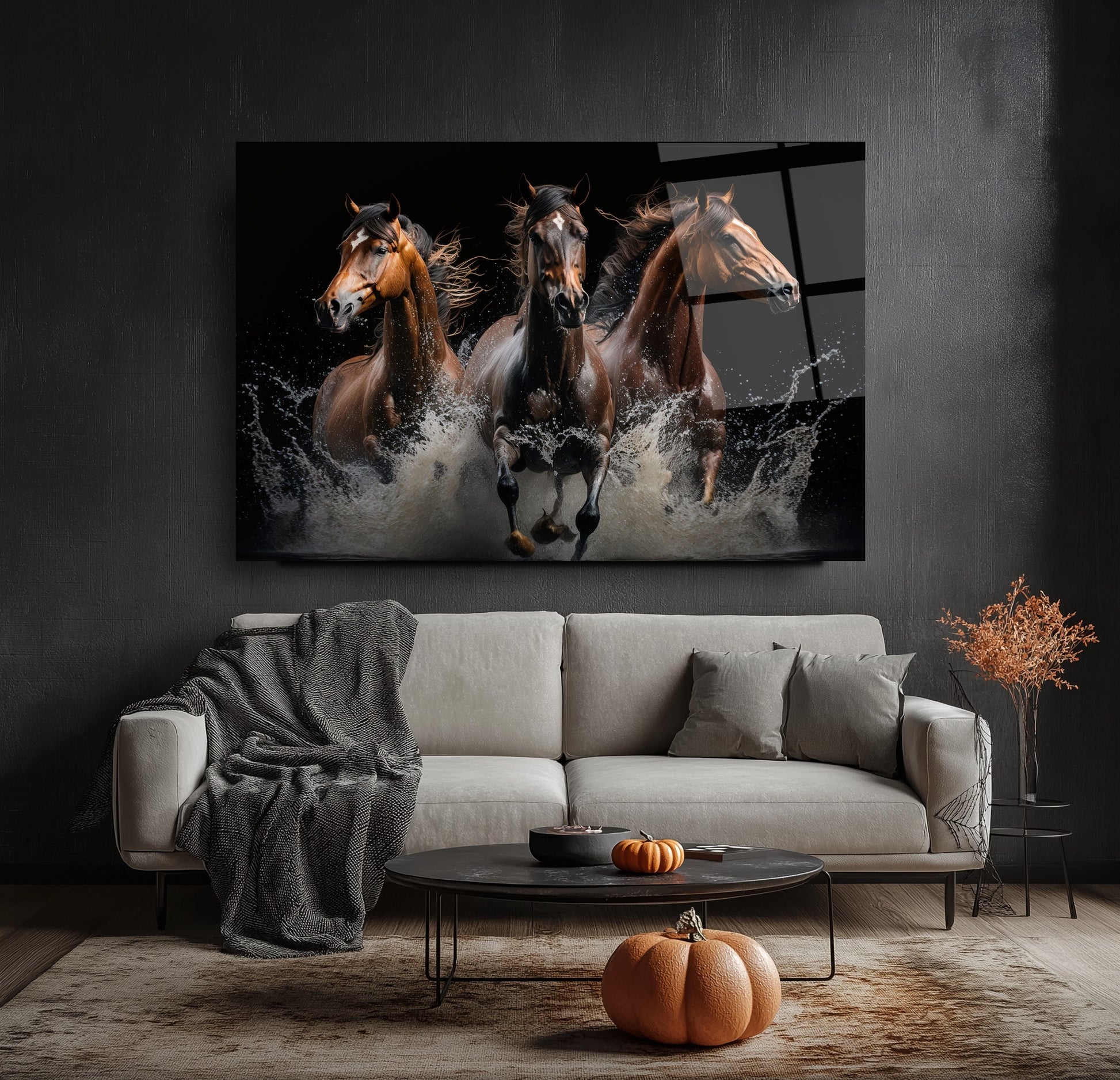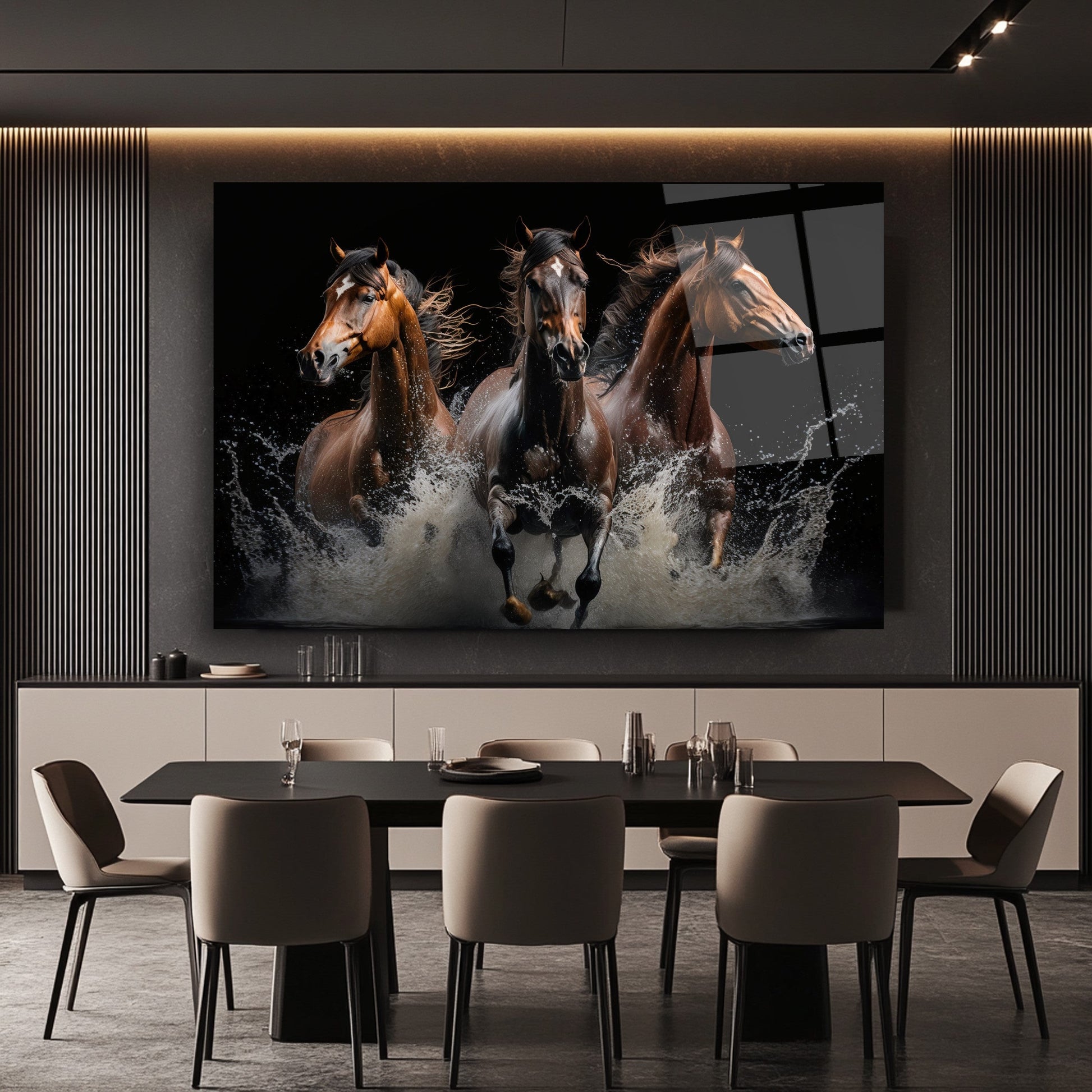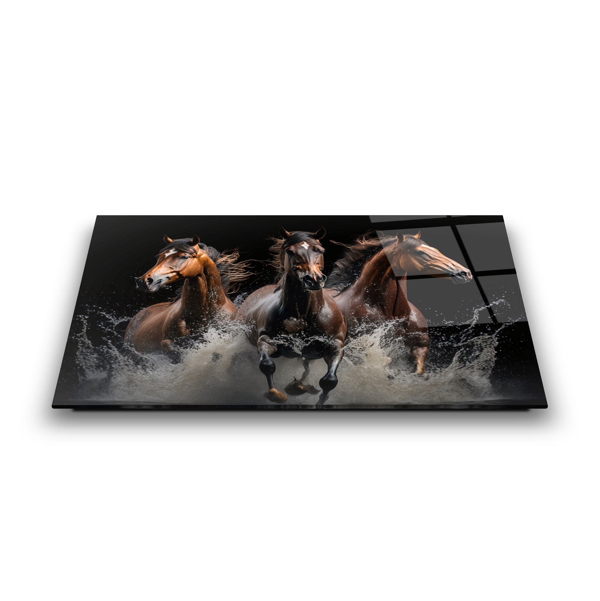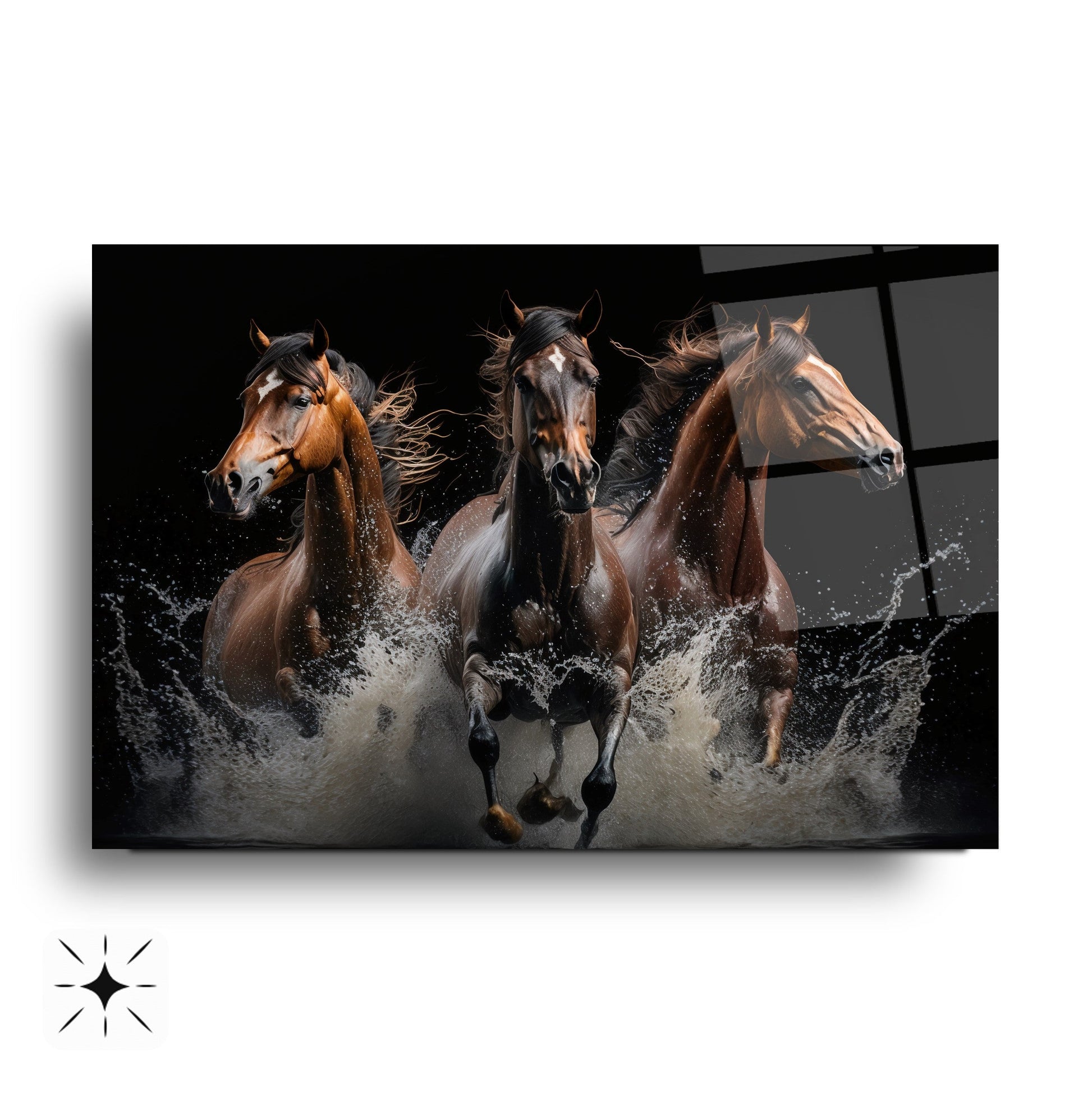 Kahverengi ve siyah tonlarındaki atların suyun üzerinde zarifçe koştuğu bu tablo, doğanın gücünü ve özgürlüğünü duvarlarınıza taşıyor. 4 mm ultra-clear temperli cam üzerine yüksek çözünürlüklü UV baskı teknolojisiyle işlenen bu eser, renklerin solmasını engeller ve uzun ömürlü kullanım sunar. Rodajlanmış kenarları sayesinde estetik ve güvenli bir görünüm sağlar. Kolay montaj için tüm aksesuarlar kutu içinde sunulur. Salon, oturma odası veya ofis gibi farklı mekanlarda şıklık ve dinamizm arayanlar için ideal bir tercihtir.
