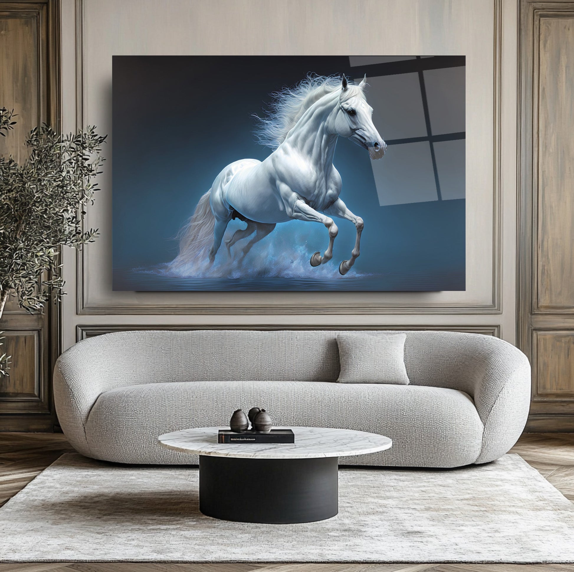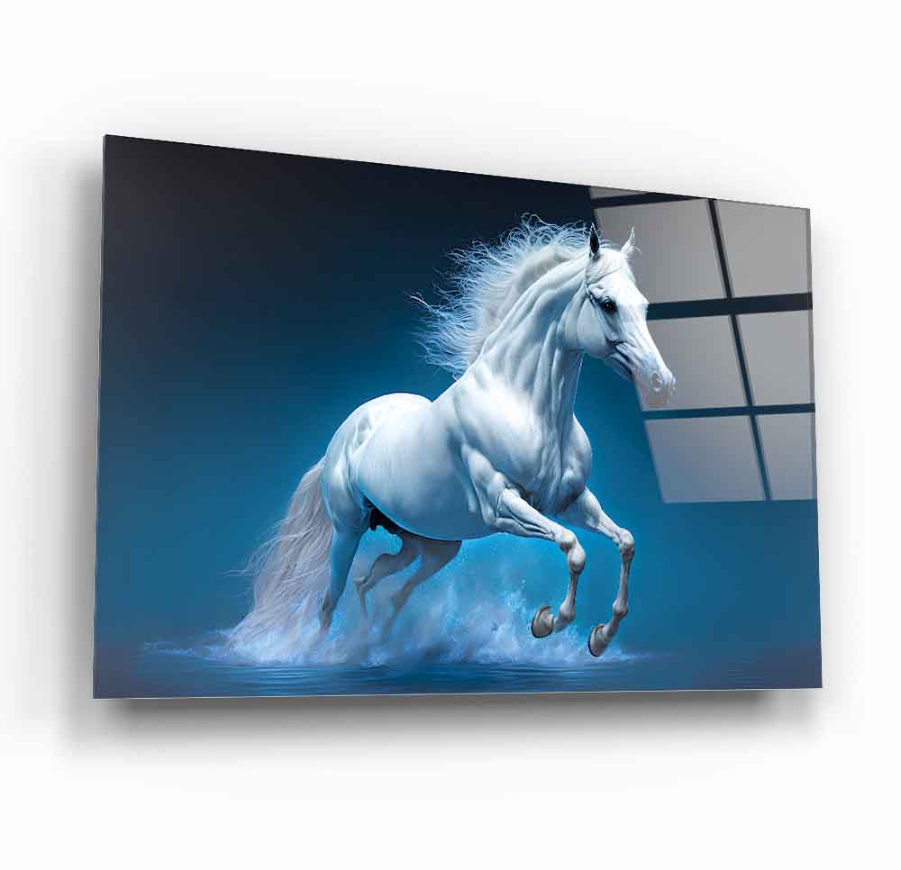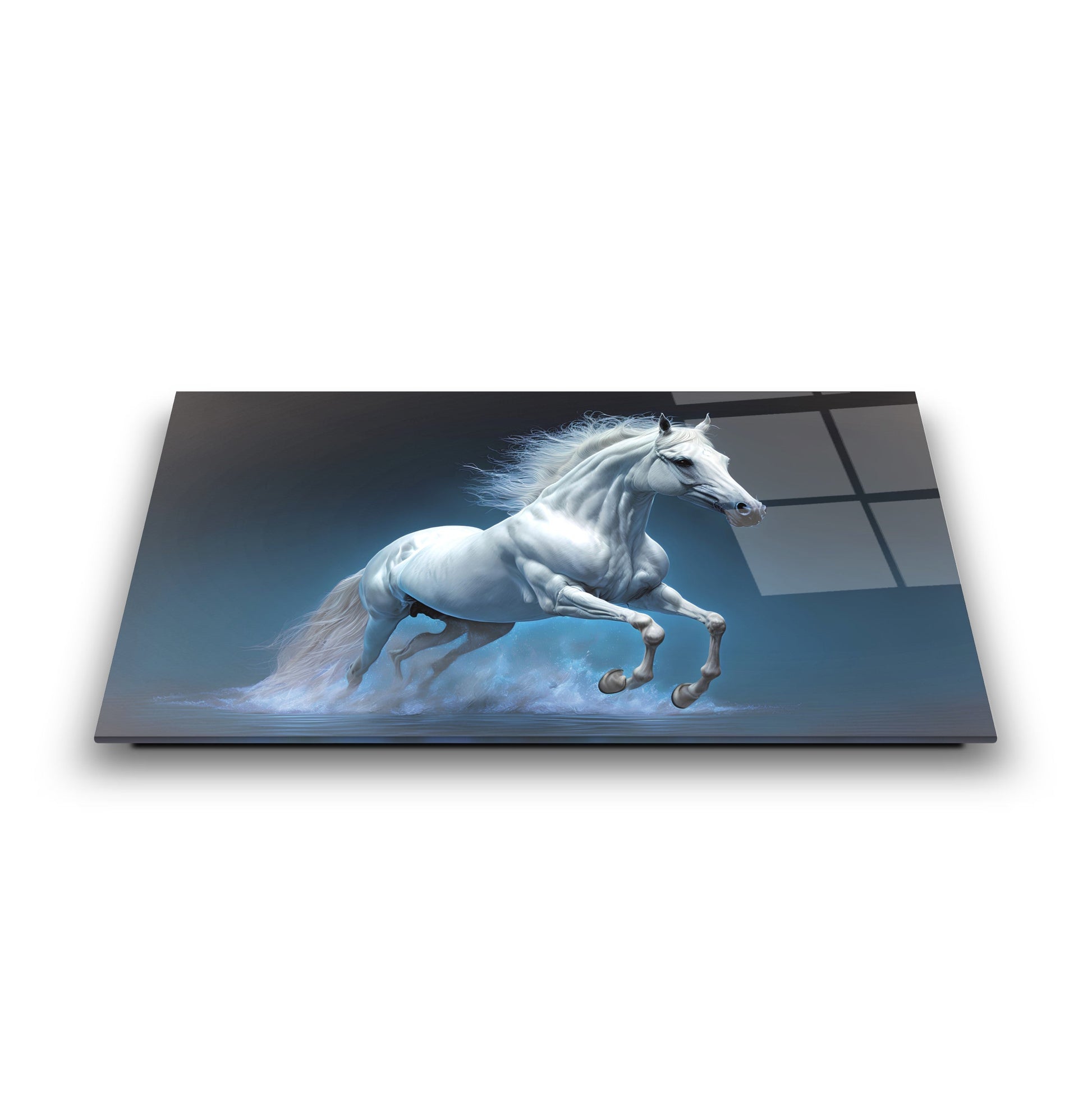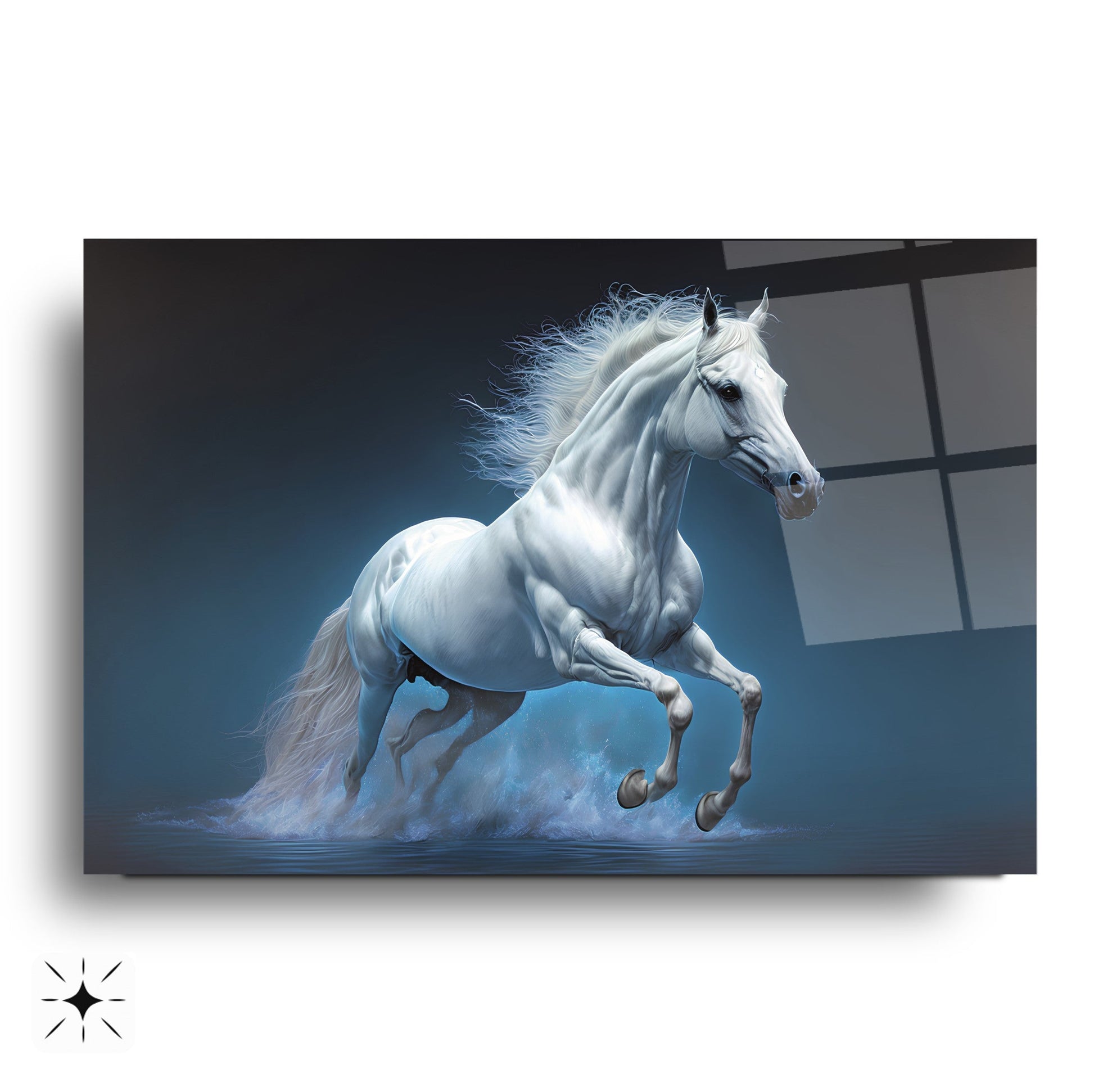 Mekanlarınıza Dinamizm ve Asalet Katın: Suda Koşan Beyaz At Cam Tablo
