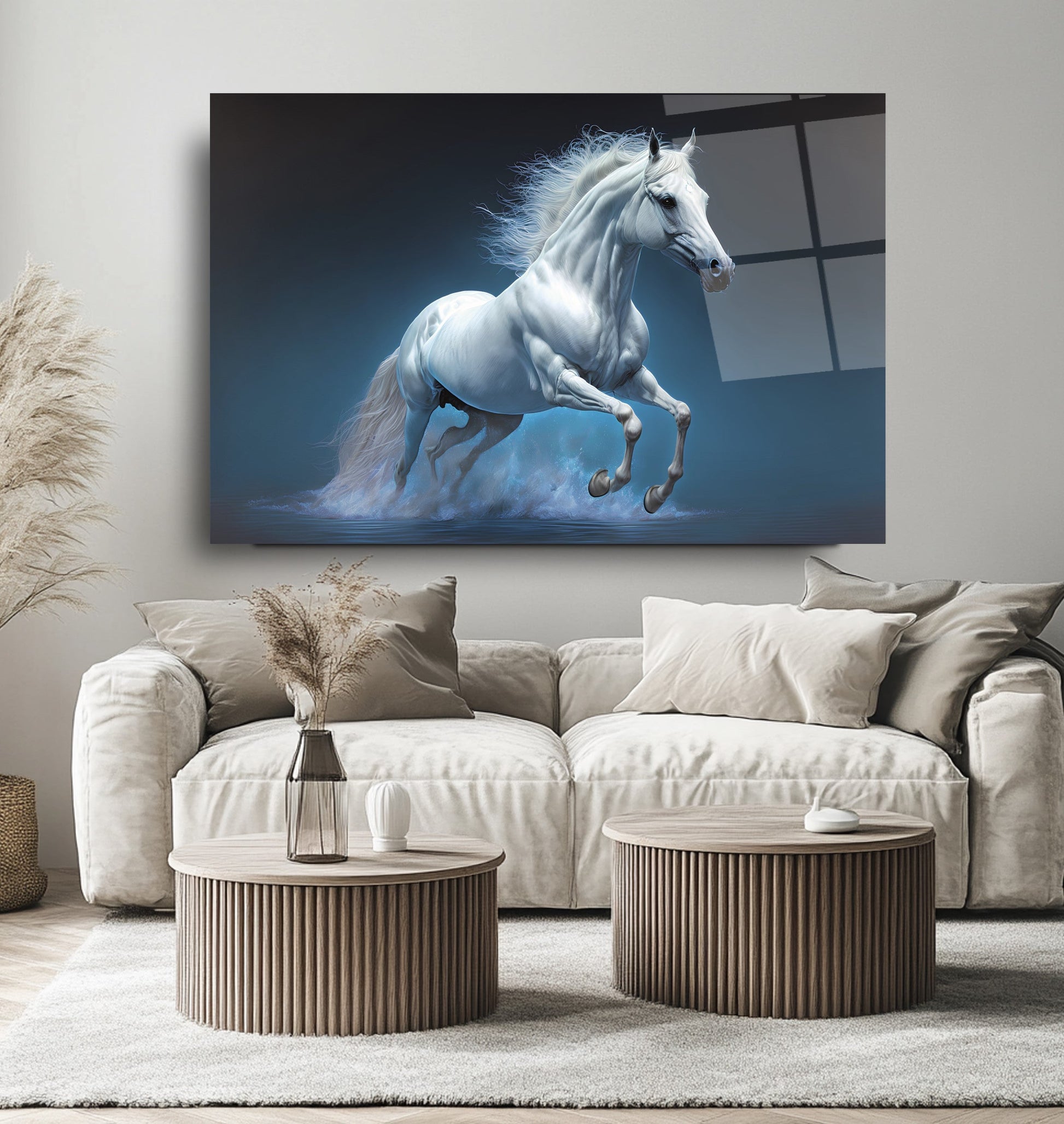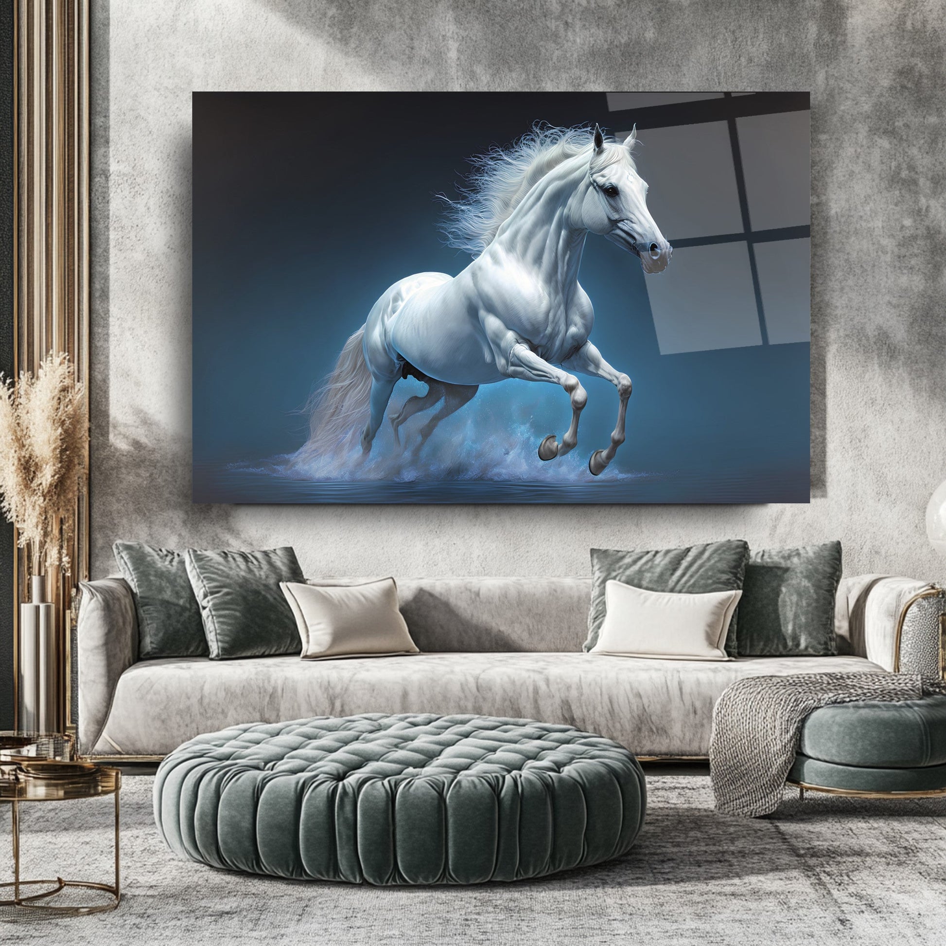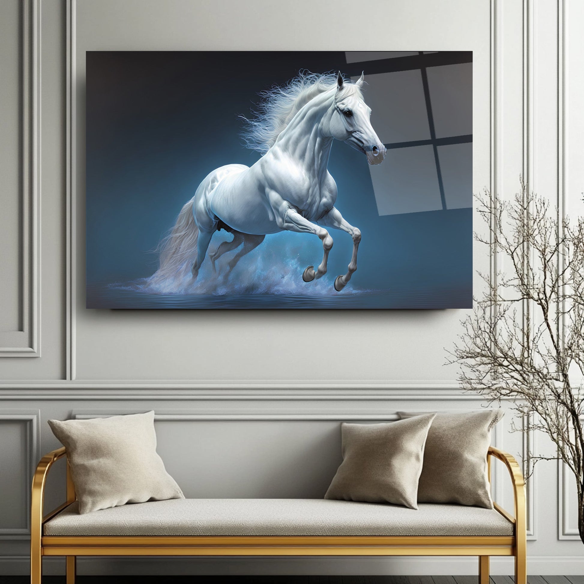 Mekanlarınıza Dinamizm ve Asalet Katın: Suda Koşan Beyaz At Cam Tablo