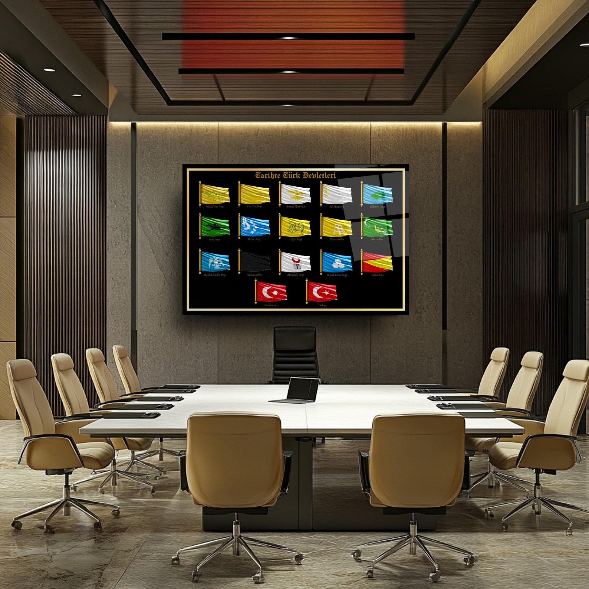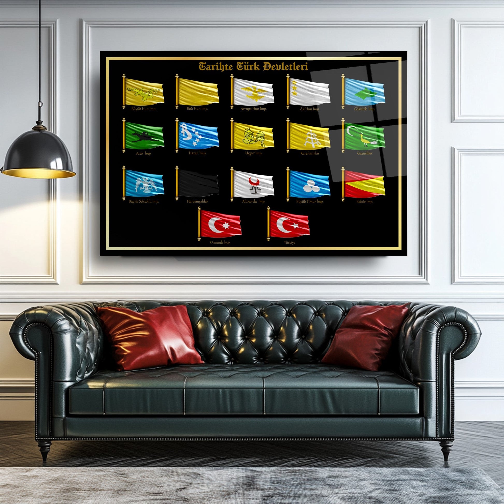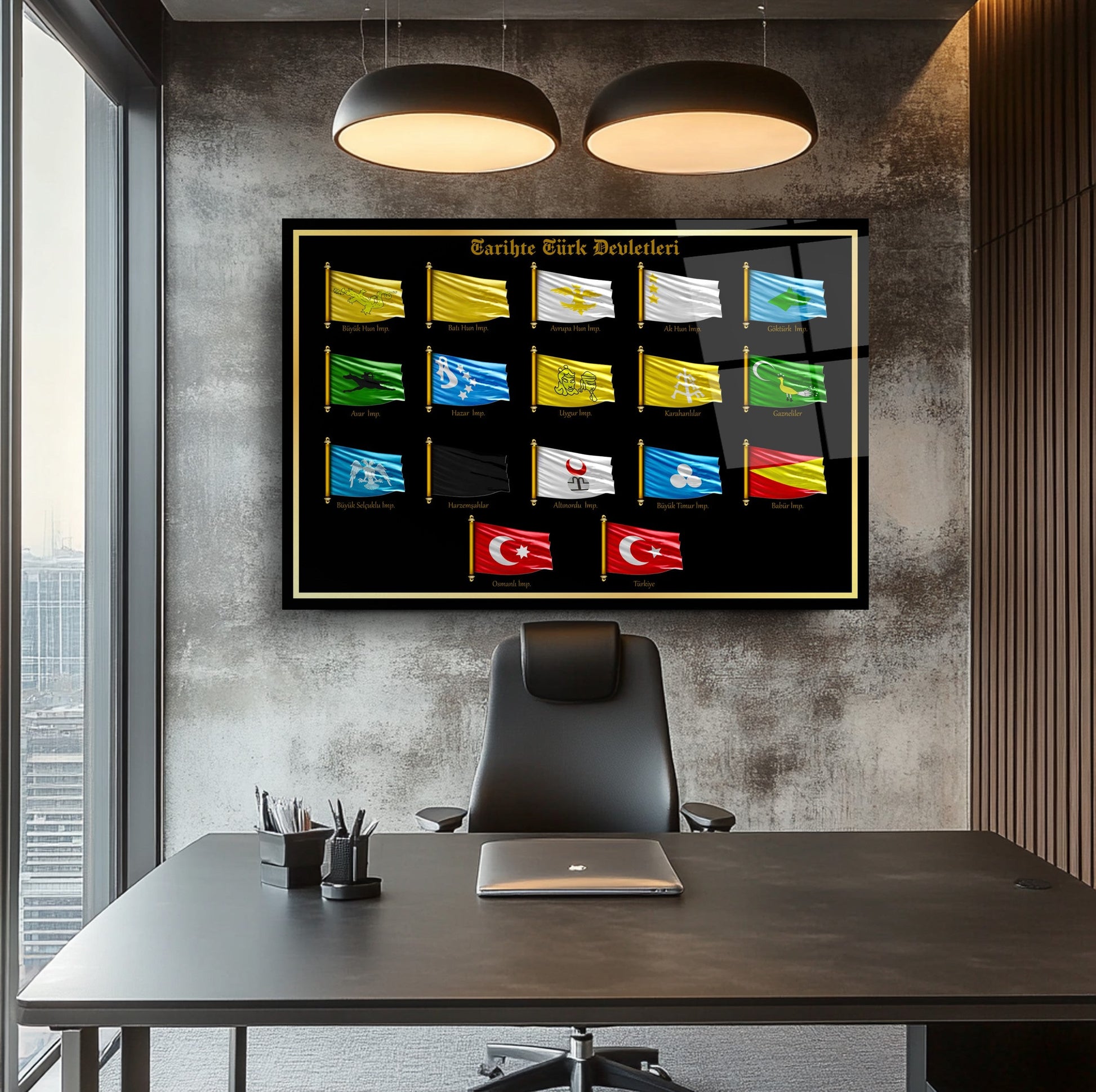 Mekanlarınıza Milli Bir Miras Katın: Tarihte Kurulmuş Türk Devletleri Bayrakları Cam Tablo