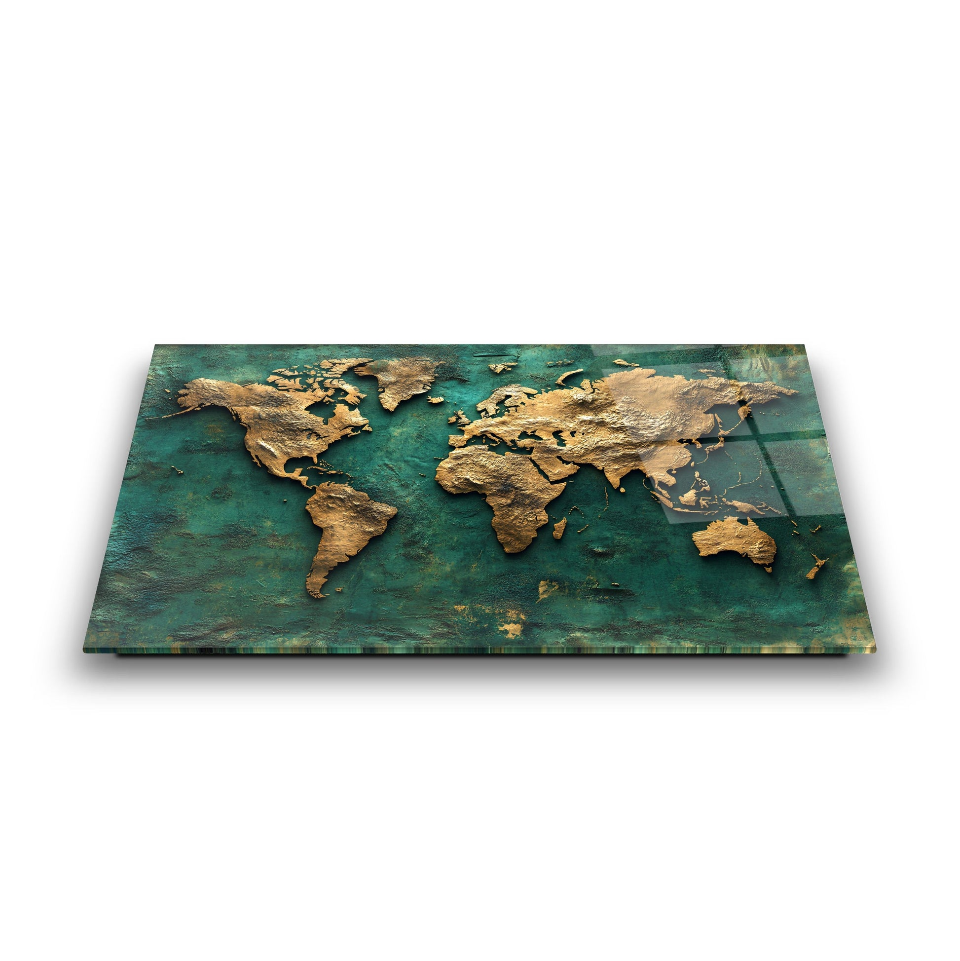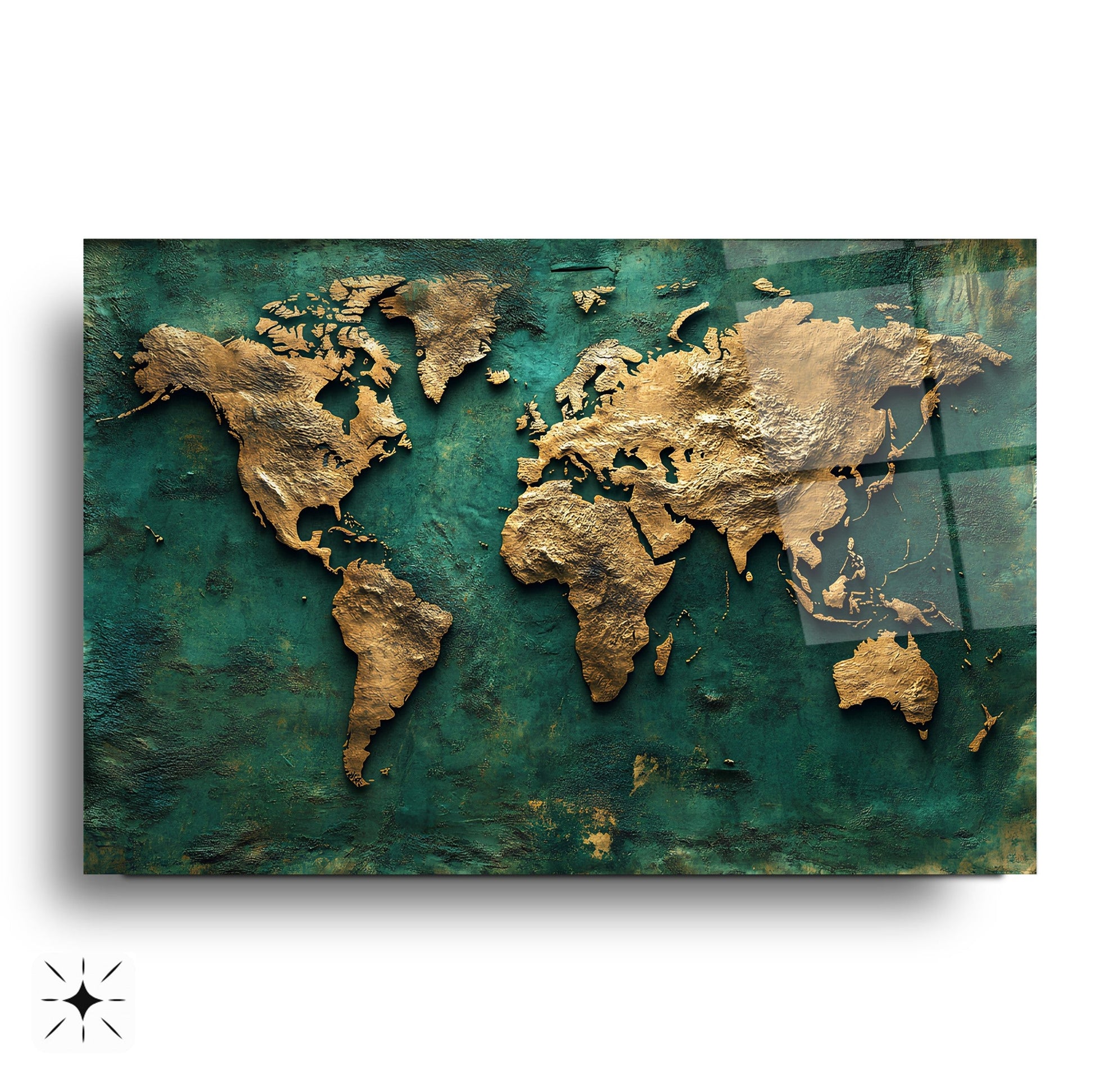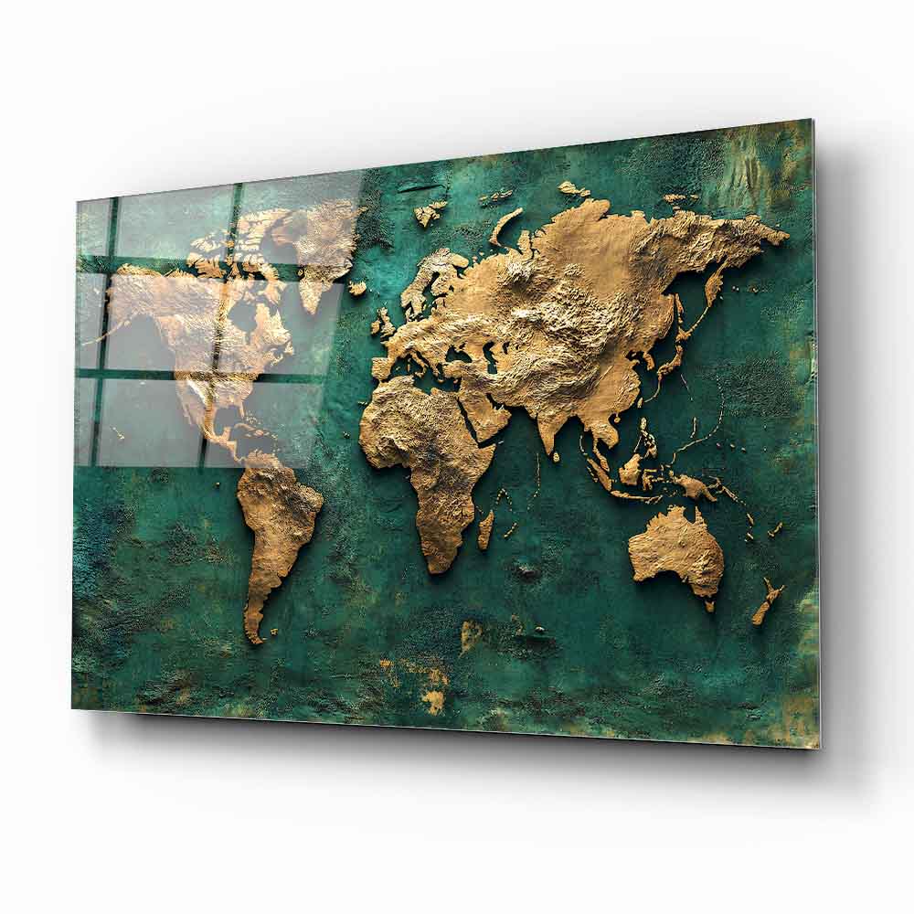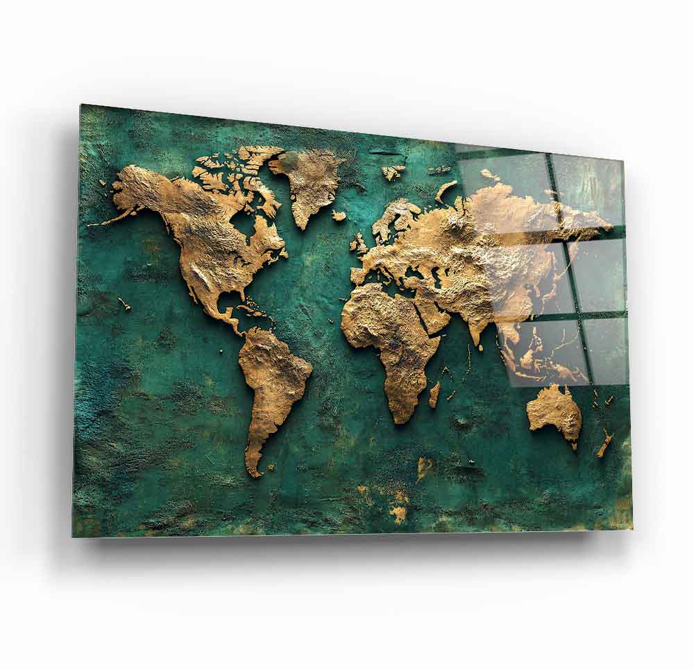 Mekanlarınıza Küresel Bir Vizyon Katın: Yeşil Gold Kabartmalı Dünya Haritası Cam Tablo