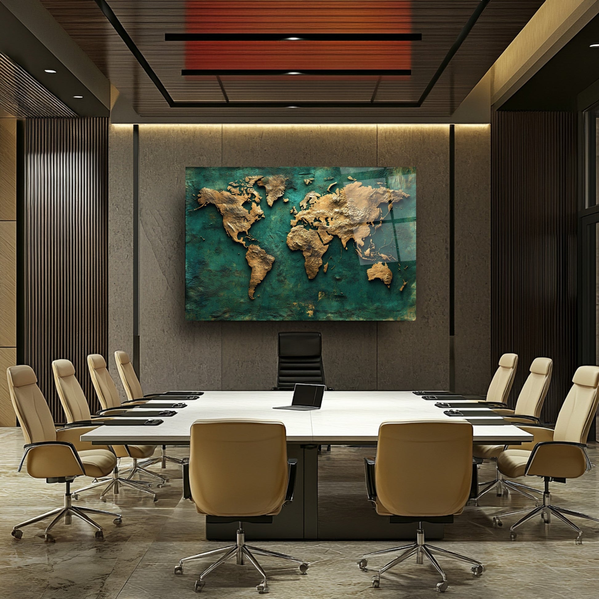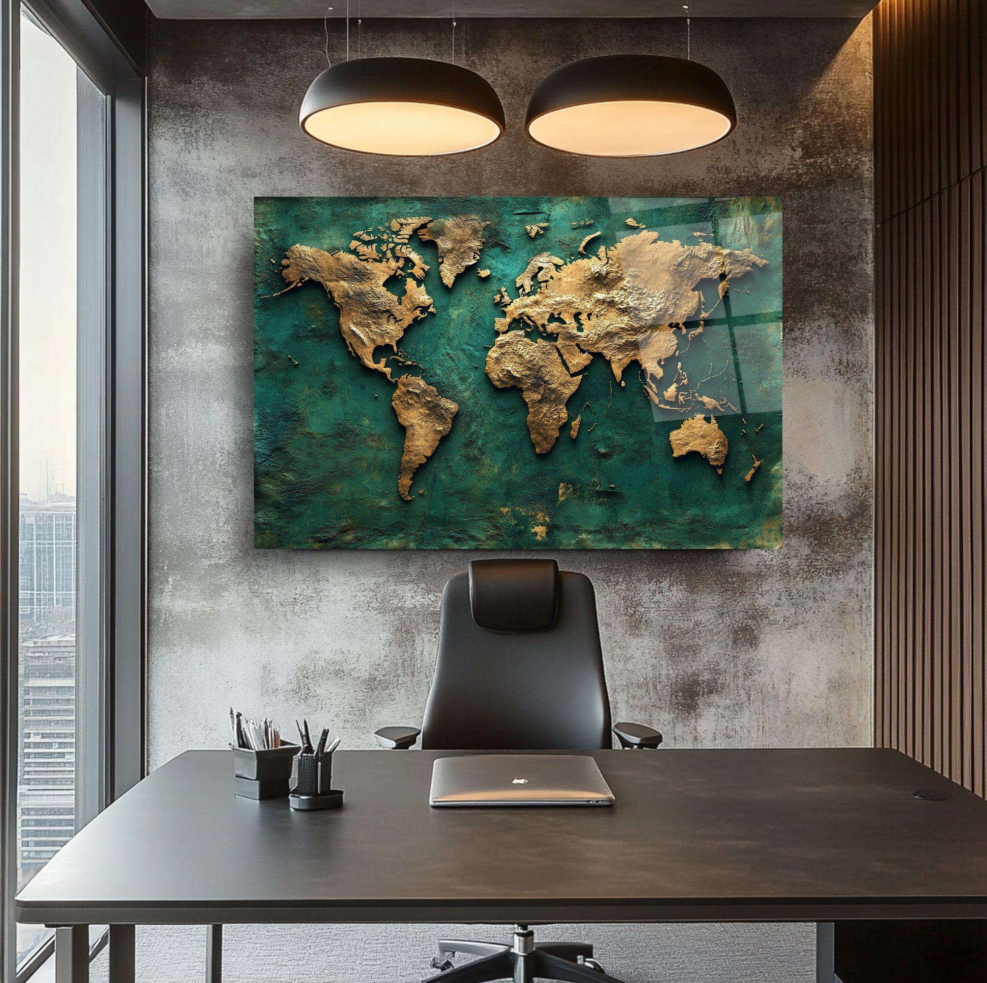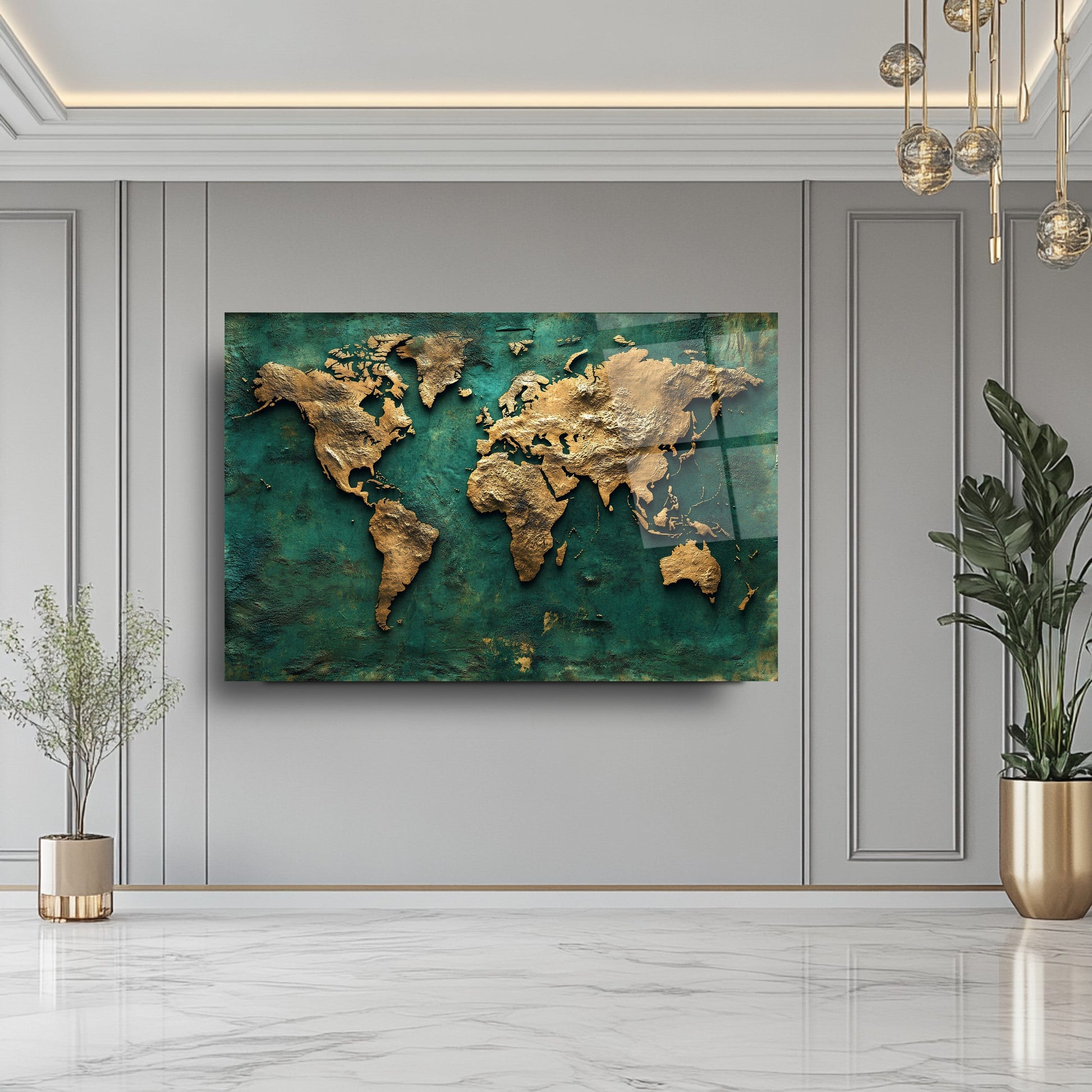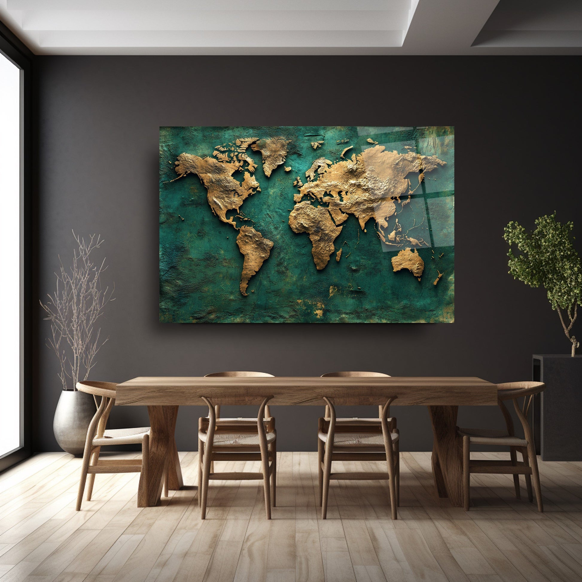 Mekanlarınıza Küresel Bir Vizyon Katın: Yeşil Gold Kabartmalı Dünya Haritası Cam Tablo