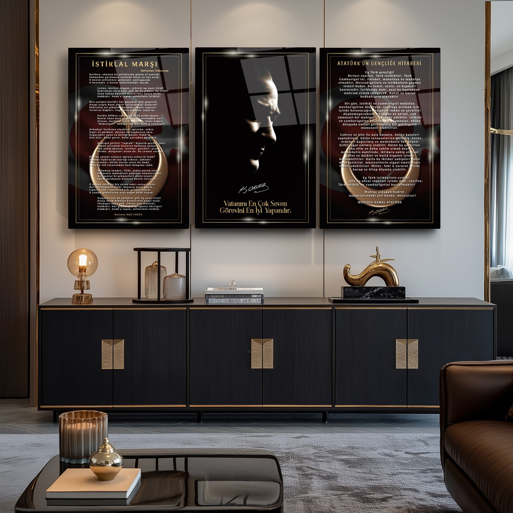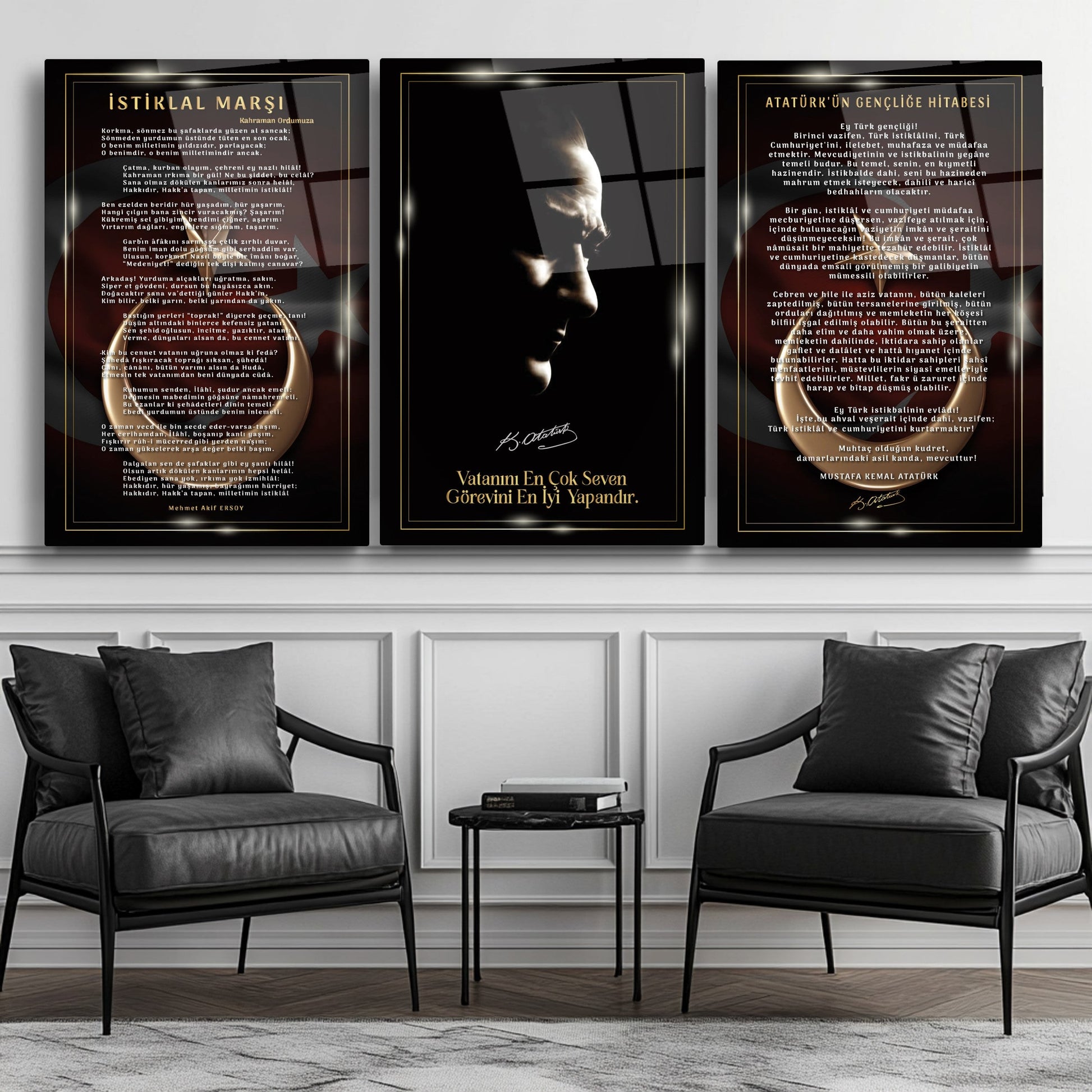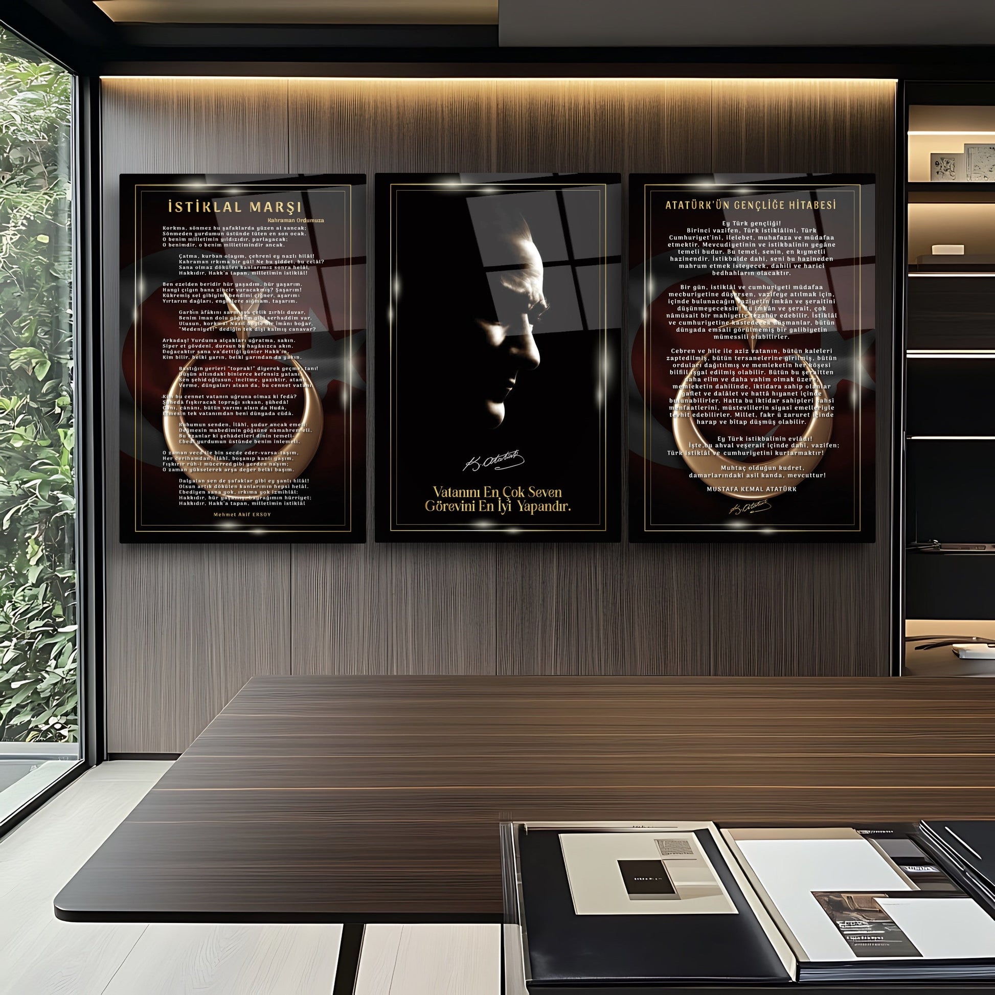 Kurumsal Alanların Prestijli Tamamlayıcısı: Bayraklı Gold Detay Atatürk Köşesi Üçlü Set Cam Tablo