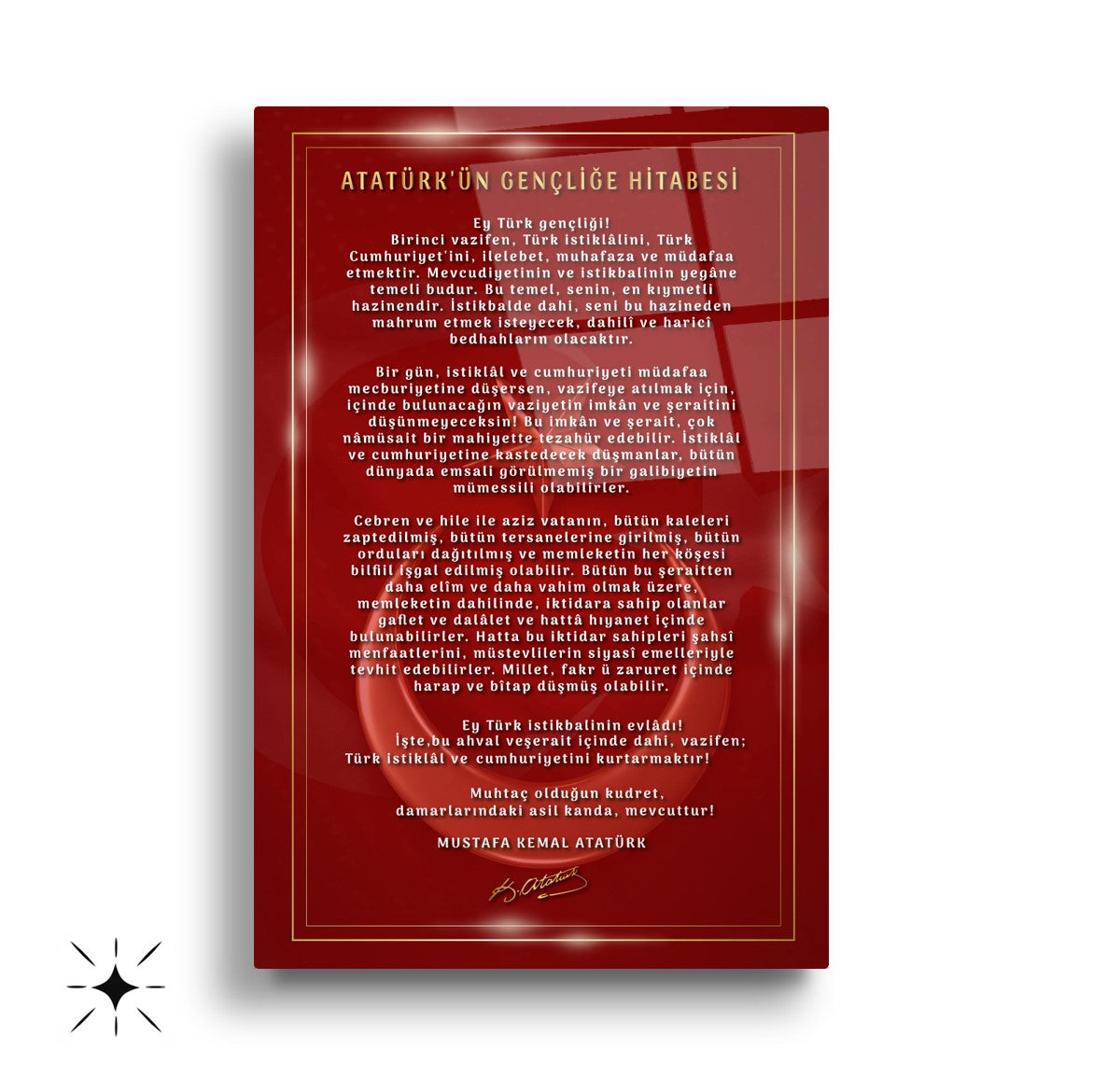 Bu modern gerçek cam tablo, en yeni nesil UV baskı teknolojileriyle hazırlanarak liderin karizmasını, milli sembollerimizin gücünü ve detayların keskinliğini kusursuzca sunar. Yüksek dayanıklılık ve estetik görünümü bir arada sunan kırılmaz yapısıyla, olası darbelere karşı üstün koruma sağlar ve parlaklığını yıllarca korur. Özellikle toplantı odası, okul, kolej, kurumsal ofisler gibi prestijli ve anlamlı bir atmosfer arayan tüm alanlar için ideal bir duvar dekorasyonu çözümüdür. Kolay temizlenebilir yüzeyiyle de pratik kullanım sunar. Şimdi CamDeko güvencesiyle mekanlarınıza milli bir duruş ve modern bir dokunuş taşıyın.