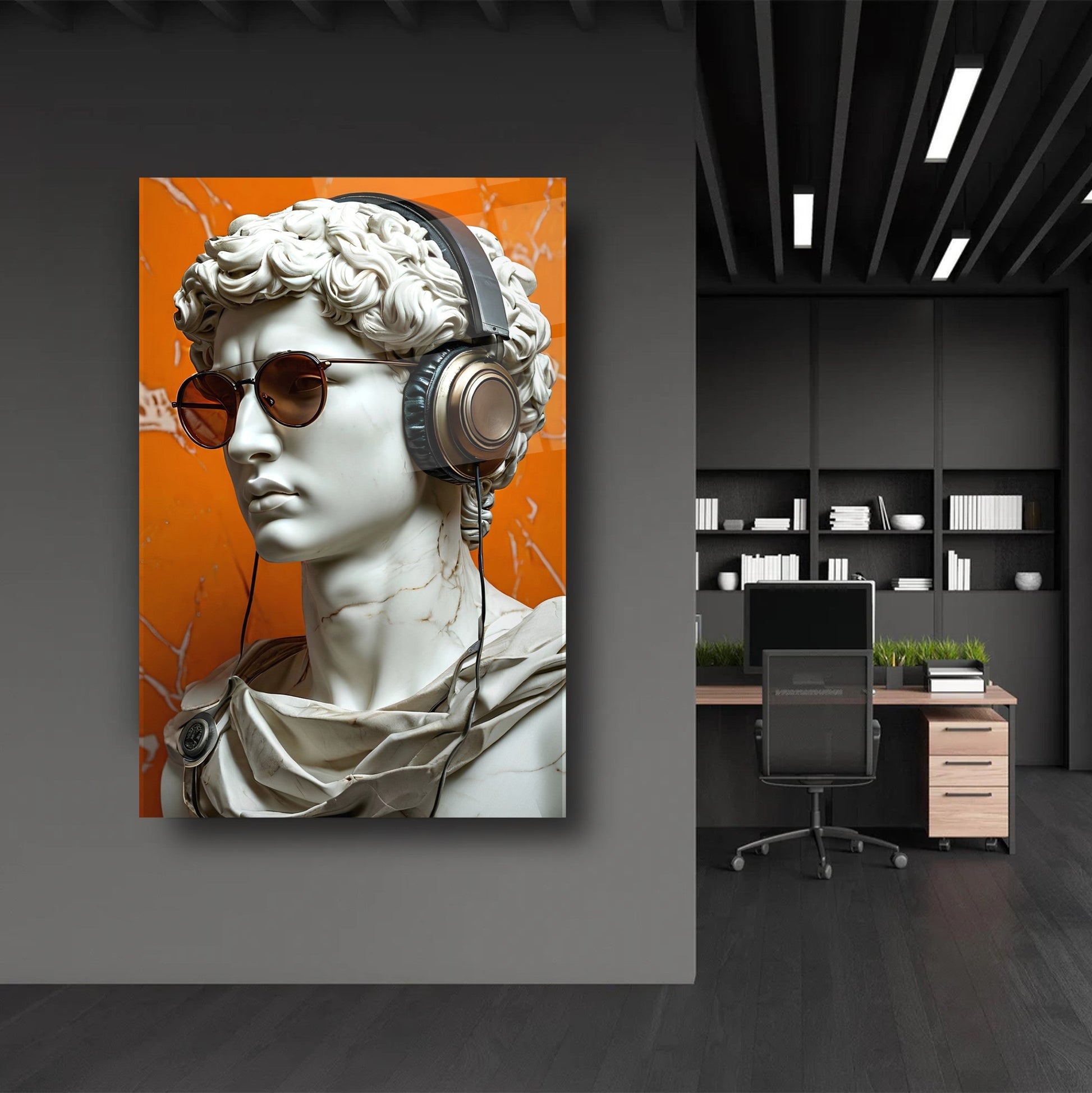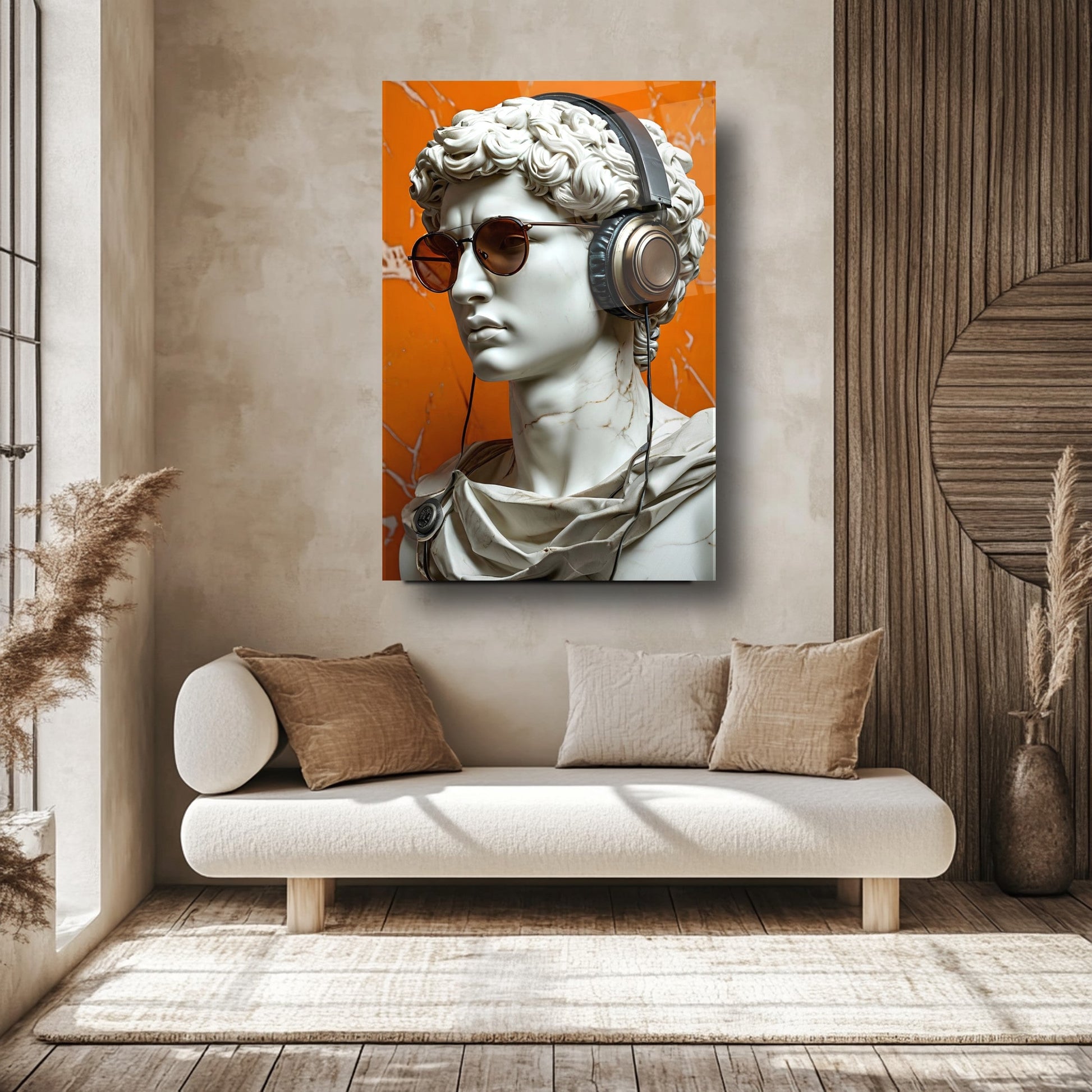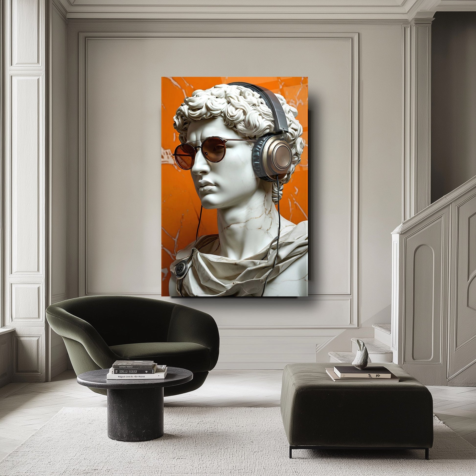 CamDeko'dan ev ve iş yerlerinize eşsiz bir tarz ve canlılık katan özel bir eser: Turuncu Arkaplan Müzik Dinleyen Gözlüklü Heykel Kırılmaz Modern UV Baskı Cam Tablo! Klasik heykel estetiğini modern detaylarla harmanlayan, müzik dinleyen gözlüklü heykel figürü ve dinamik turuncu arkaplanıyla yaşam alanlarınıza sanatsal ve enerjik bir atmosfer katın.