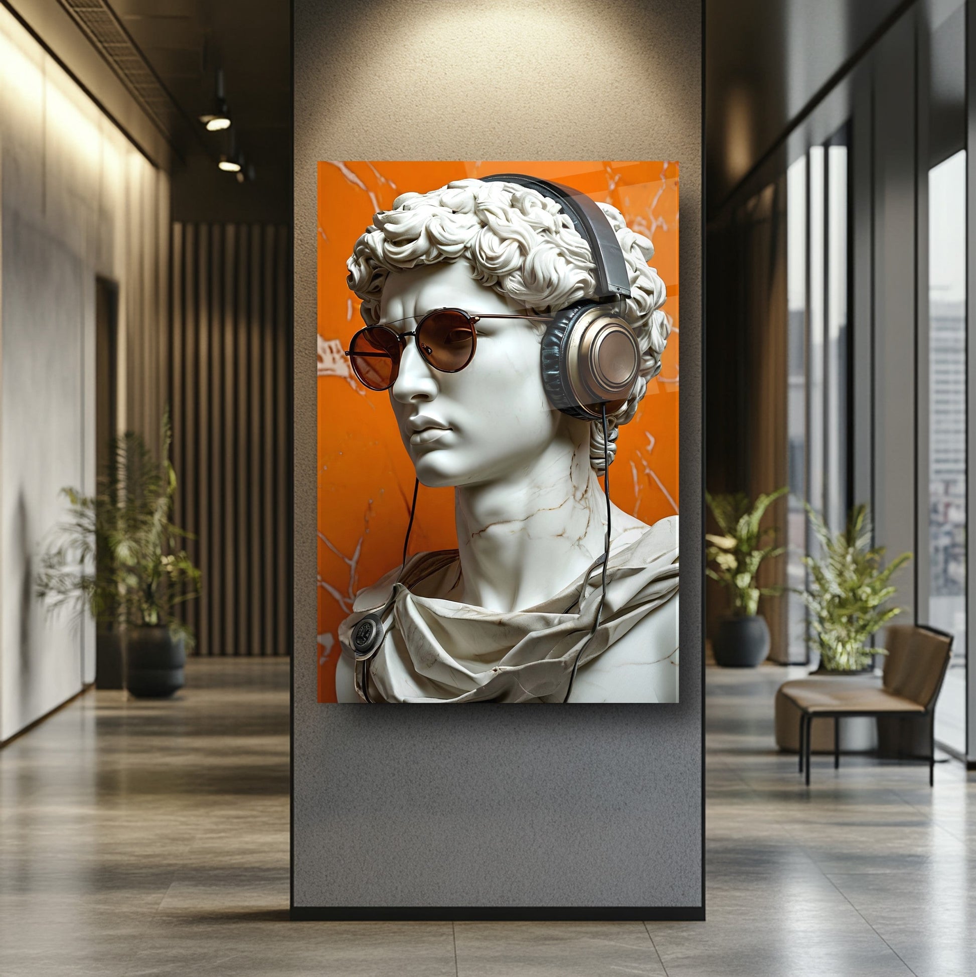 Mekanlarınıza Sanat ve Ritm Katın: Turuncu Arkaplan Müzik Dinleyen Gözlüklü Heykel Cam Tablo