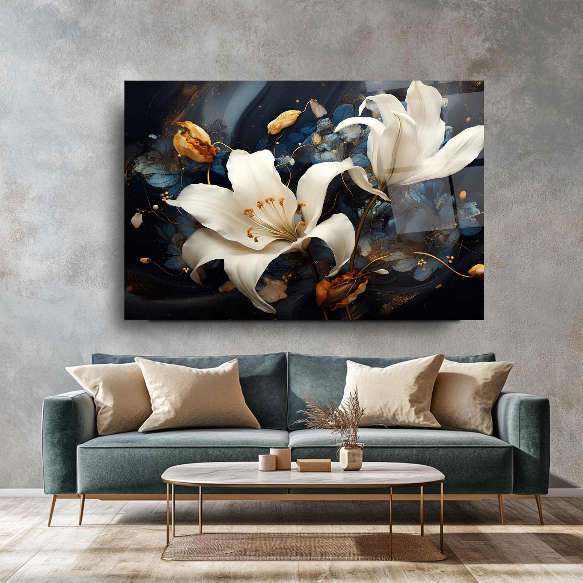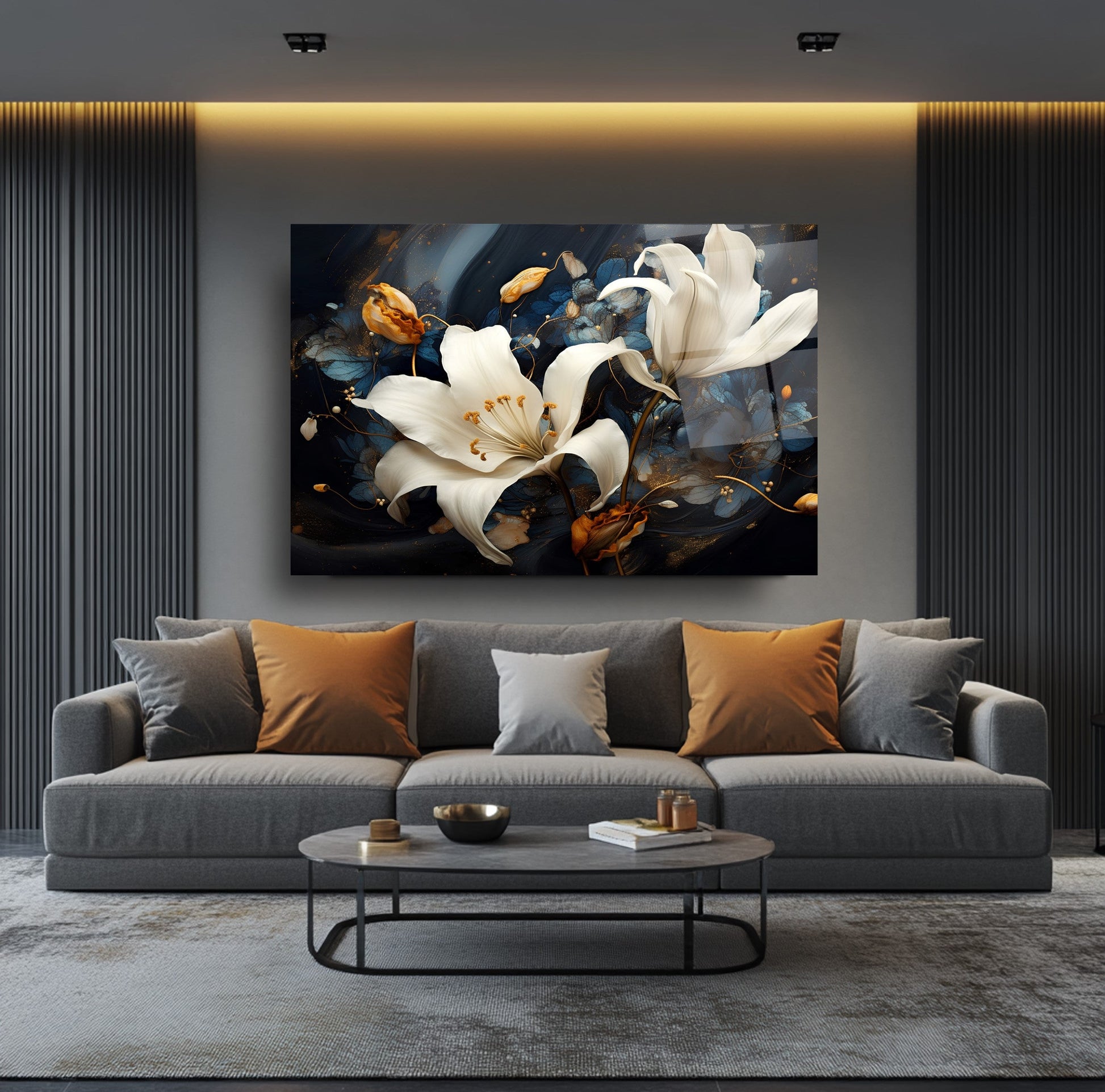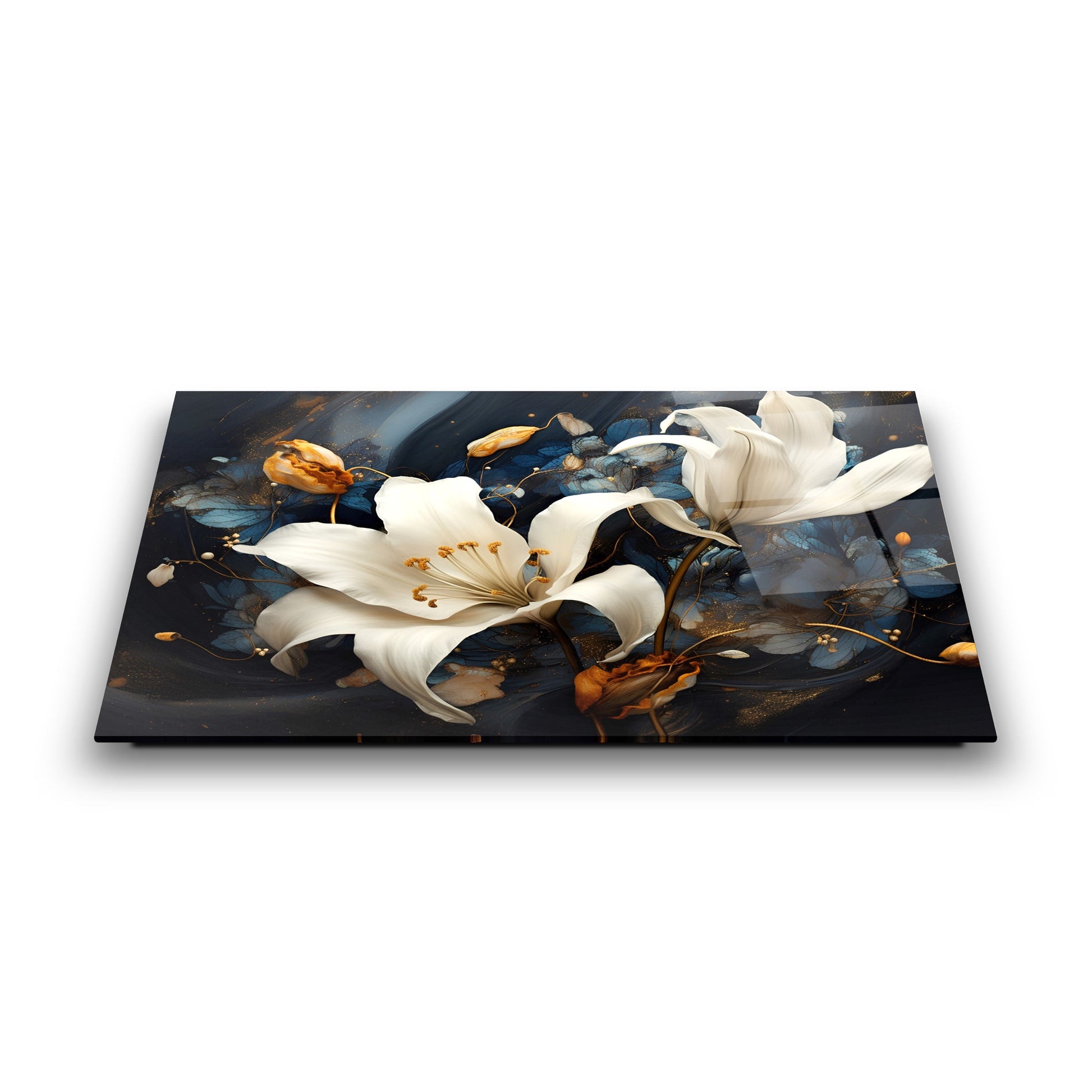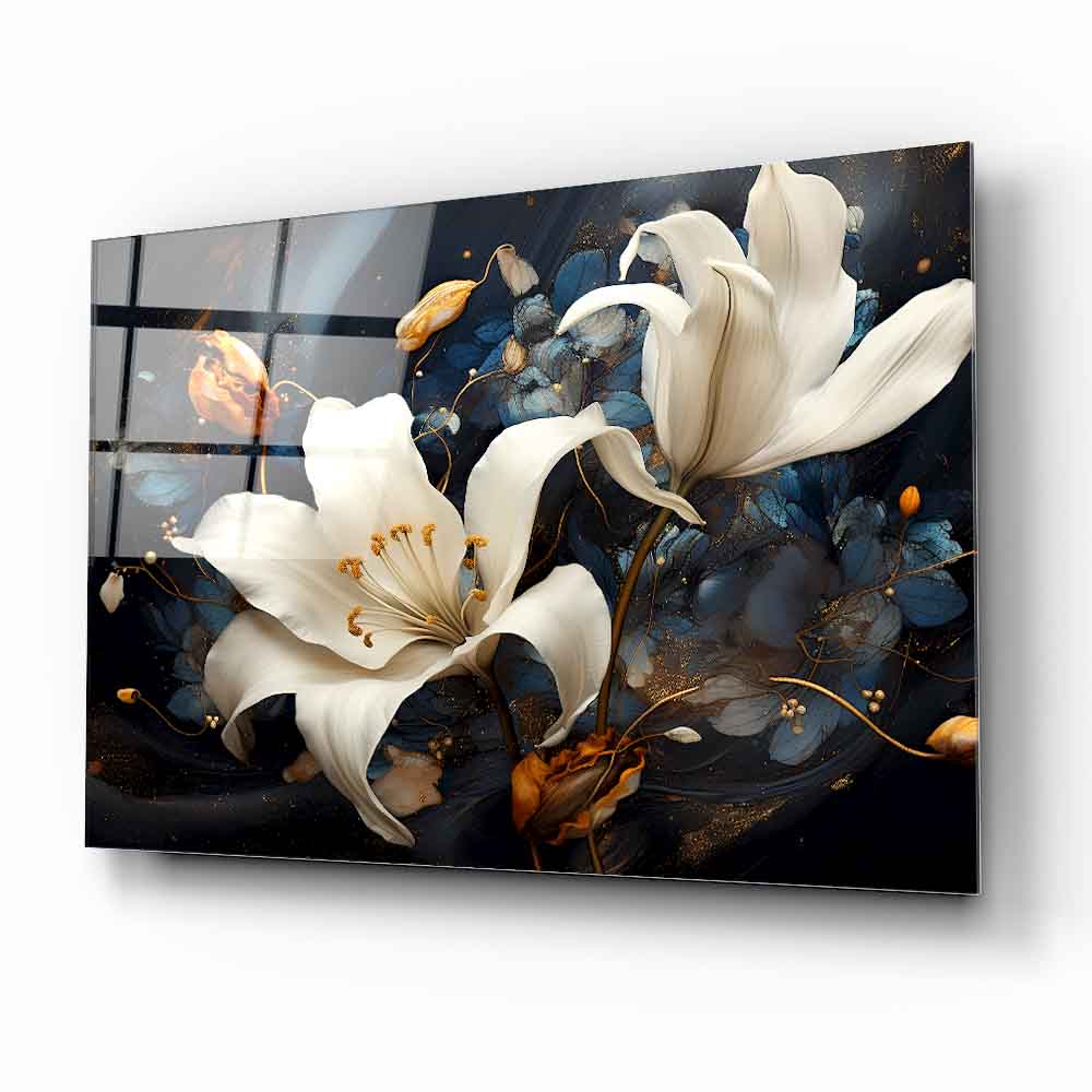 Sonbaharın sıcak turuncu yapraklarıyla çevrili zarif beyaz çiçekler, siyah ve lacivert zemin üzerinde göz alıcı bir kontrast sunuyor. Dikey kompozisyon, modern ve enerjik bir atmosfer yaratırken detaylı fırça görünümü esere derinlik kazandırıyor. UV baskı teknolojisi sayesinde sonbahar renkleri solmadan canlı kalır, temperli cam yapısı ise şıklığı uzun ömürle birleştirir. Çerçevesiz, minimal tasarımıyla salon, ofis veya antre gibi alanlarda dikkat çeken bir dekoratif vurgu isteyenler için ideal bir tercih.