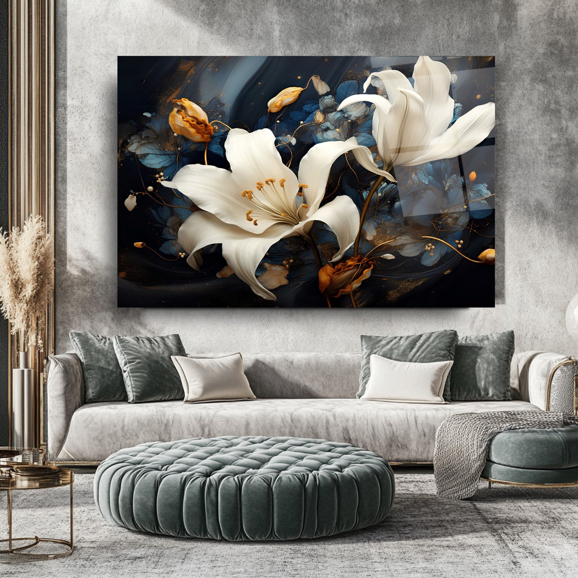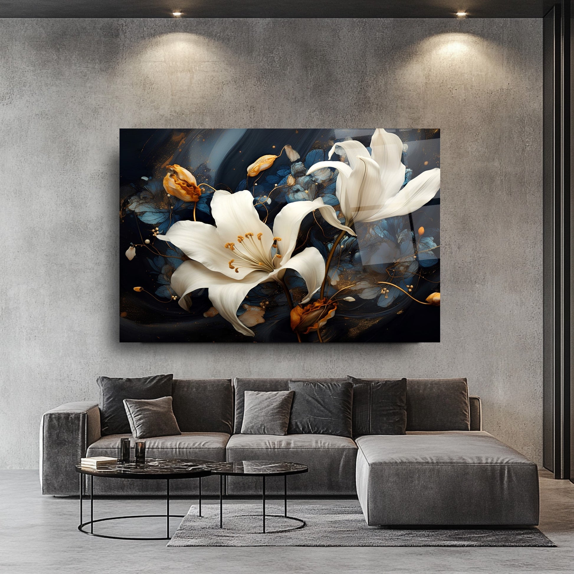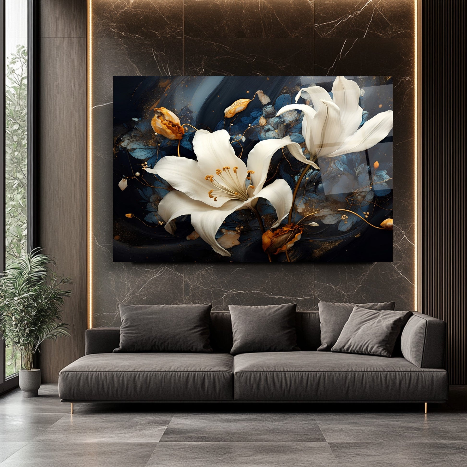 Sonbaharın sıcak turuncu yapraklarıyla çevrili zarif beyaz çiçekler, siyah ve lacivert zemin üzerinde göz alıcı bir kontrast sunuyor. Dikey kompozisyon, modern ve enerjik bir atmosfer yaratırken detaylı fırça görünümü esere derinlik kazandırıyor. UV baskı teknolojisi sayesinde sonbahar renkleri solmadan canlı kalır, temperli cam yapısı ise şıklığı uzun ömürle birleştirir. Çerçevesiz, minimal tasarımıyla salon, ofis veya antre gibi alanlarda dikkat çeken bir dekoratif vurgu isteyenler için ideal bir tercih.