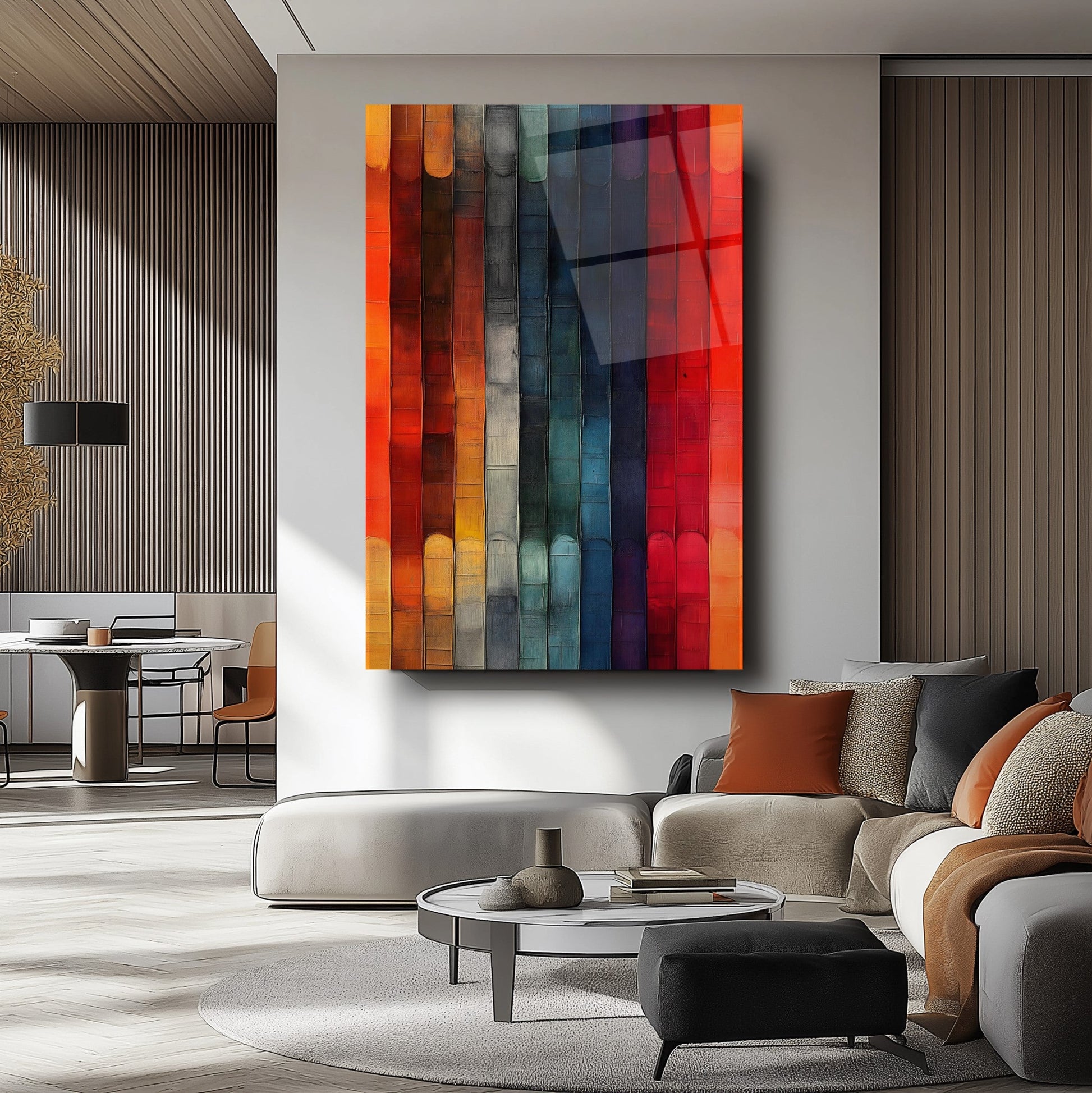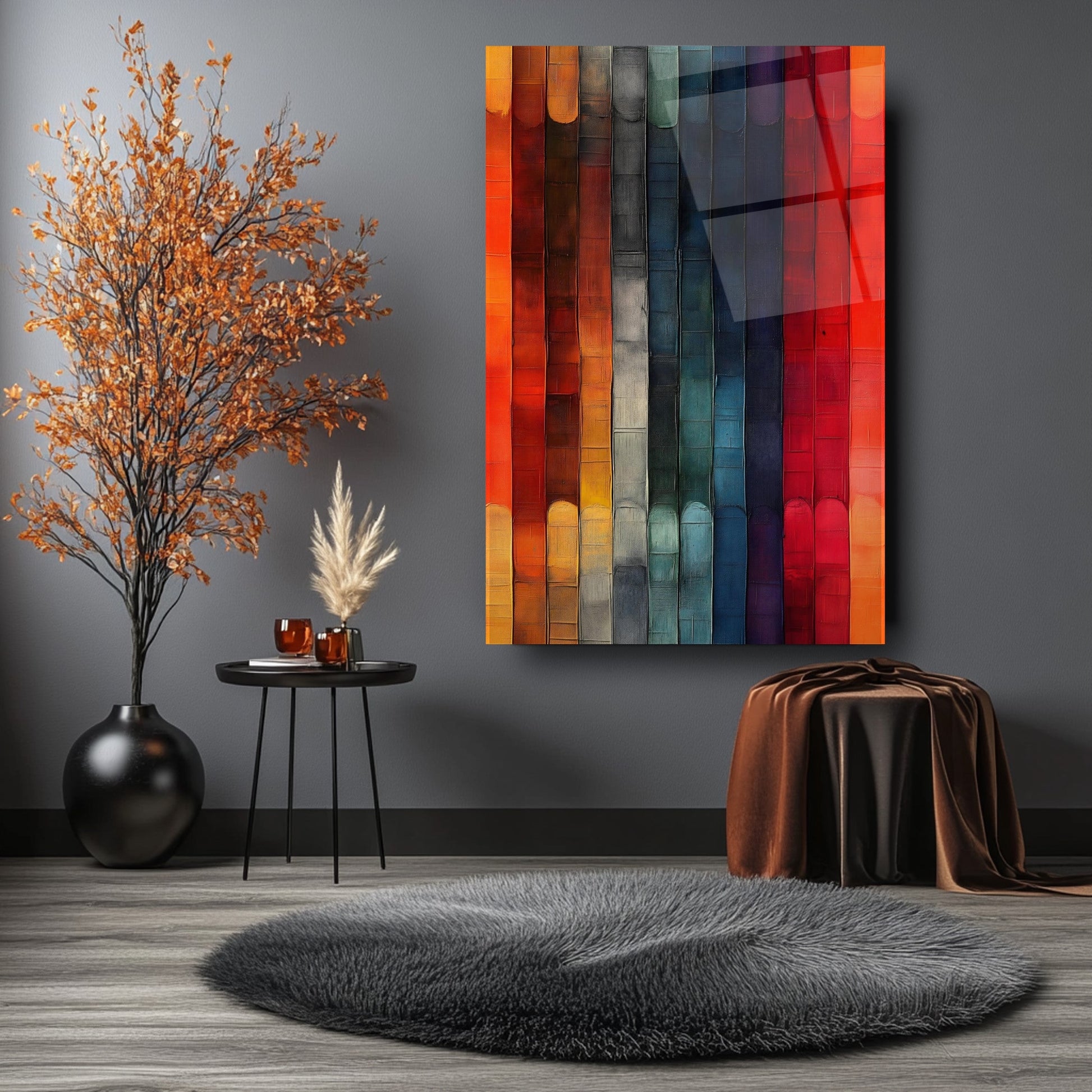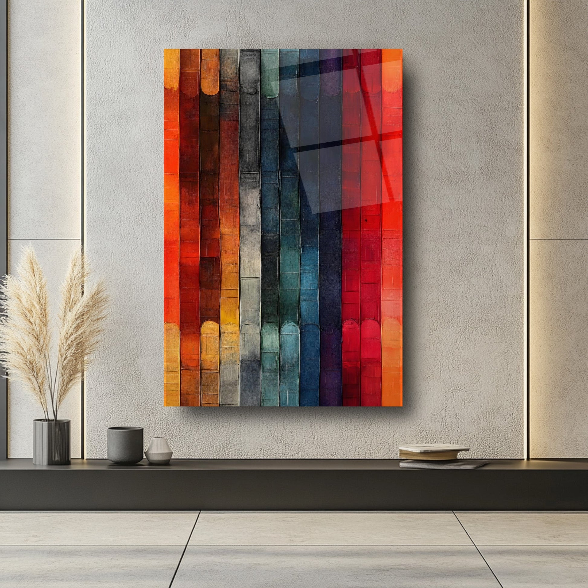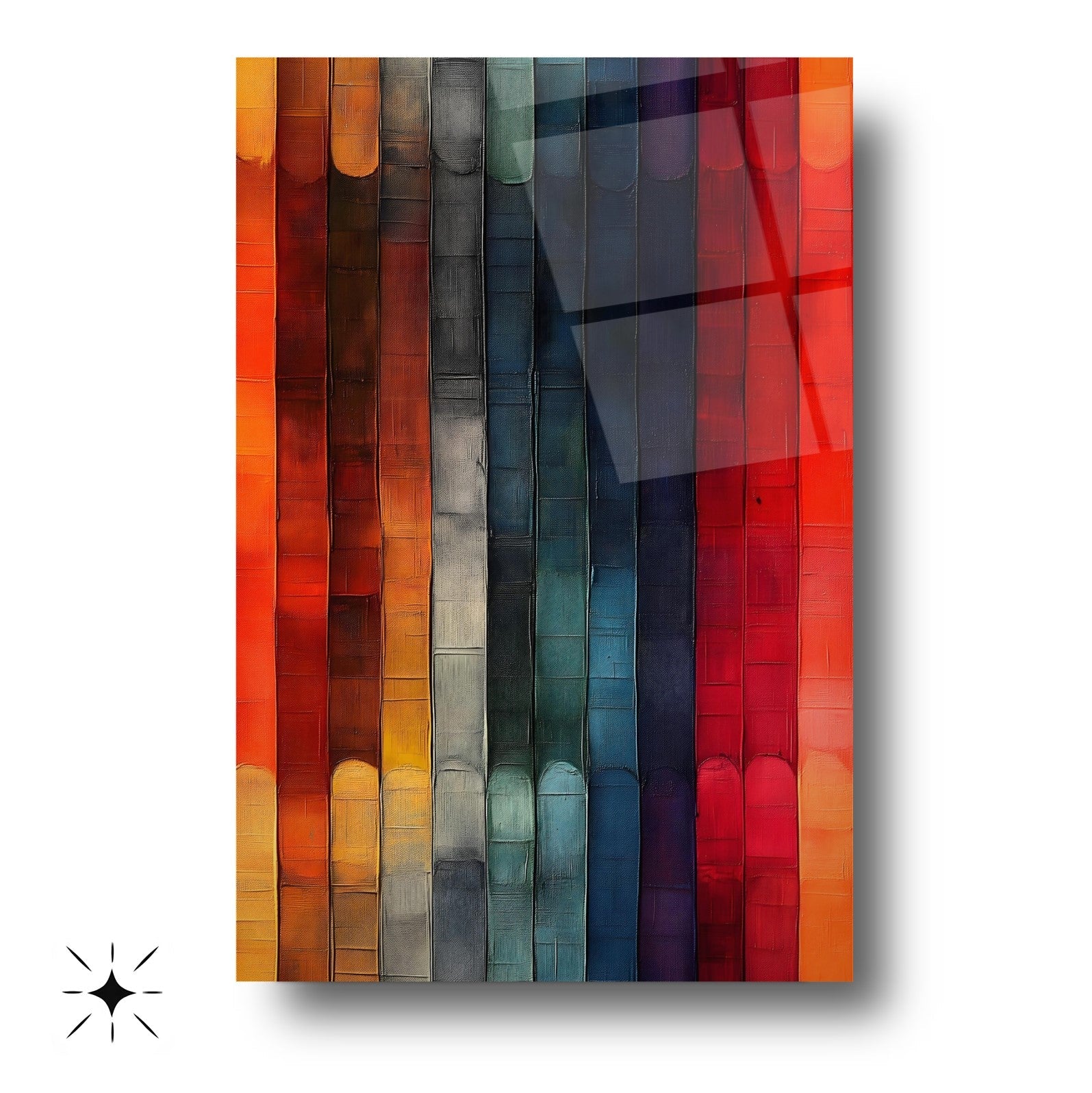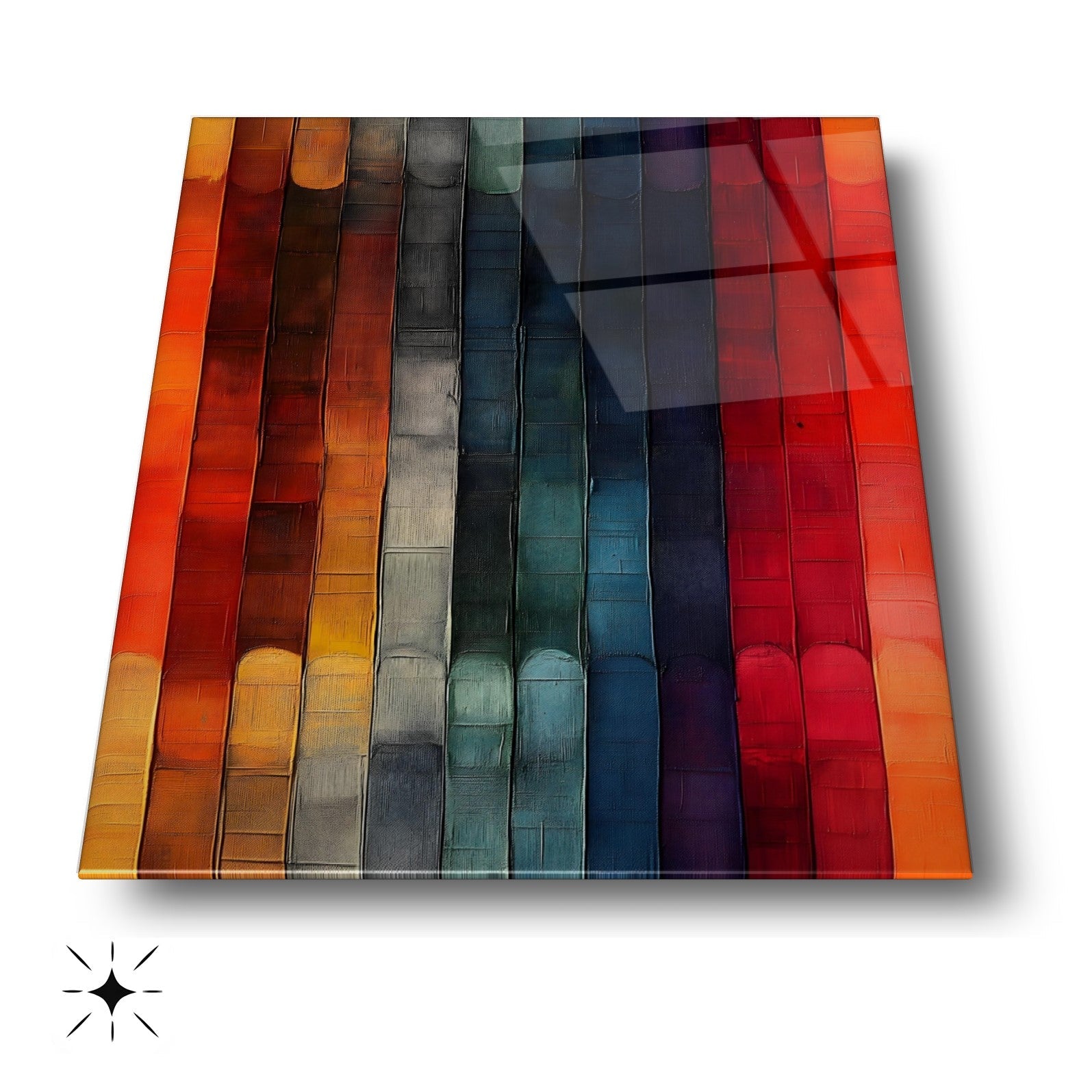 Canlı turuncu, kırmızı ve sarı tonlarıyla tasarlanmış bu kırılmaz cam tablo, dayanıklı temperli cam yapısıyla gerçek bir cam tablodur. Modern ve soyut çubuklu desenleriyle salon, ofis ve yaşam alanlarına şıklık ve enerji katar. Uzun ömürlü ve kaliteli yapısıyla mekan dekorasyonunuzda fark yaratacak mükemmel bir tercih.