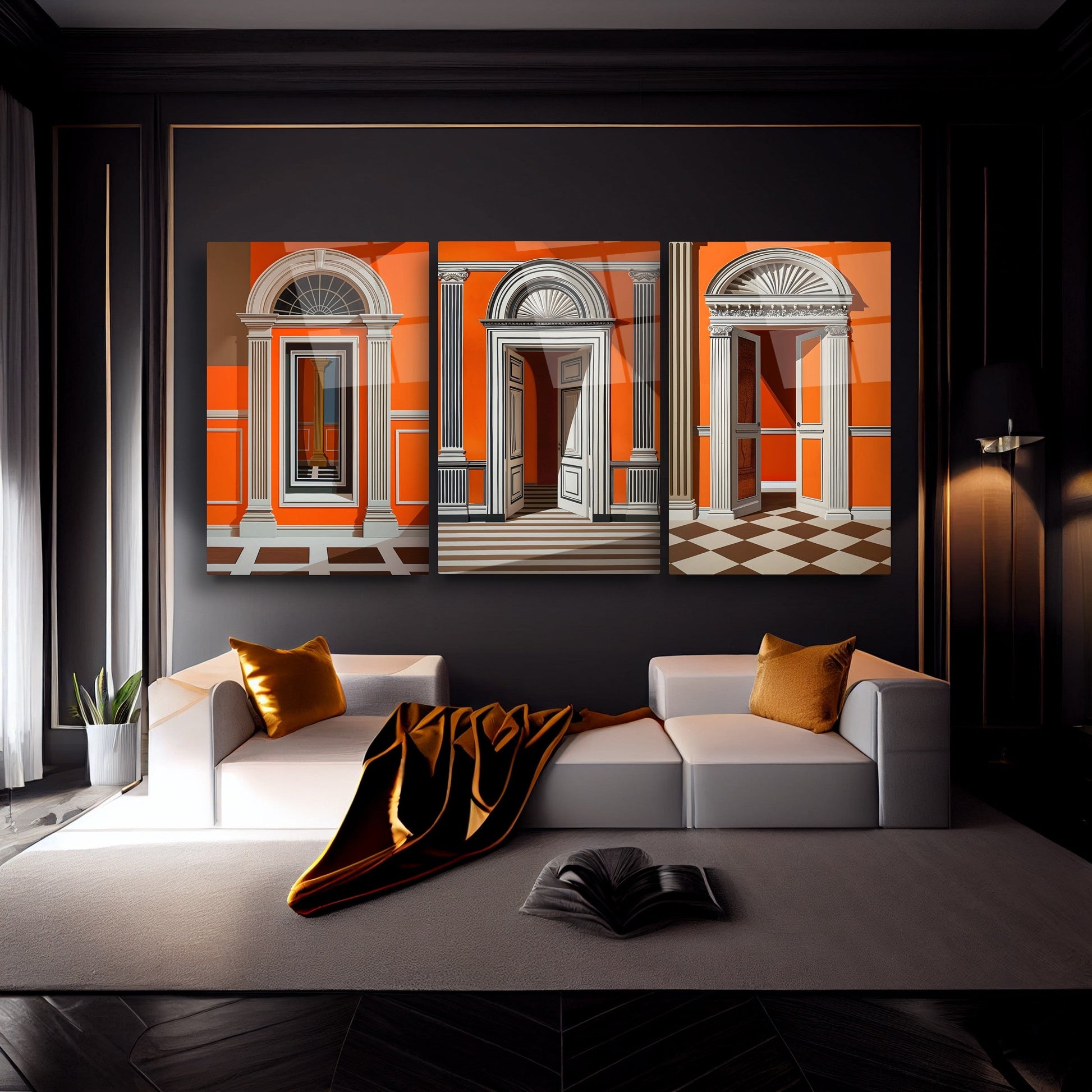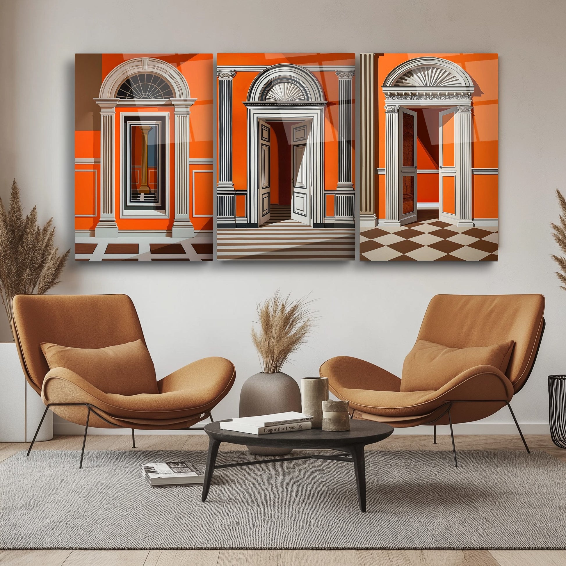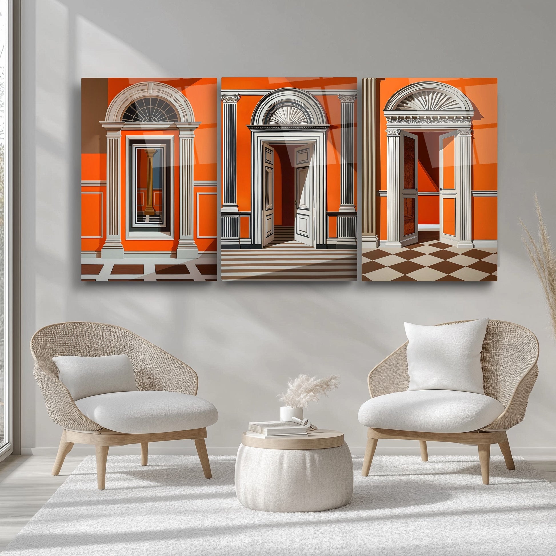Turuncu tonların sıcaklığıyla tasarlanan bu üçlü cam tablo seti, sanatsal kapı detaylarıyla dikkat çeker. Minimal ve modern tarzıyla özellikle oturma odası, antre ya da butik işletmeler için etkileyici bir dekorasyon parçasıdır. Her biri kırılmaz temperli camdan üretilmiş bu tablolar, uzun ömürlü kullanım sunarken UV baskı tekniği sayesinde renk canlılığını korur. Sanatsal dokunuşlarla harmanlanan kapı figürleri, mekâna karakter ve derinlik kazandırır. Cam tablo dekorasyonunda özgün ve dikkat çekici bir alternatif arayanlar için estetik ve fonksiyonelliği bir arada sunar.