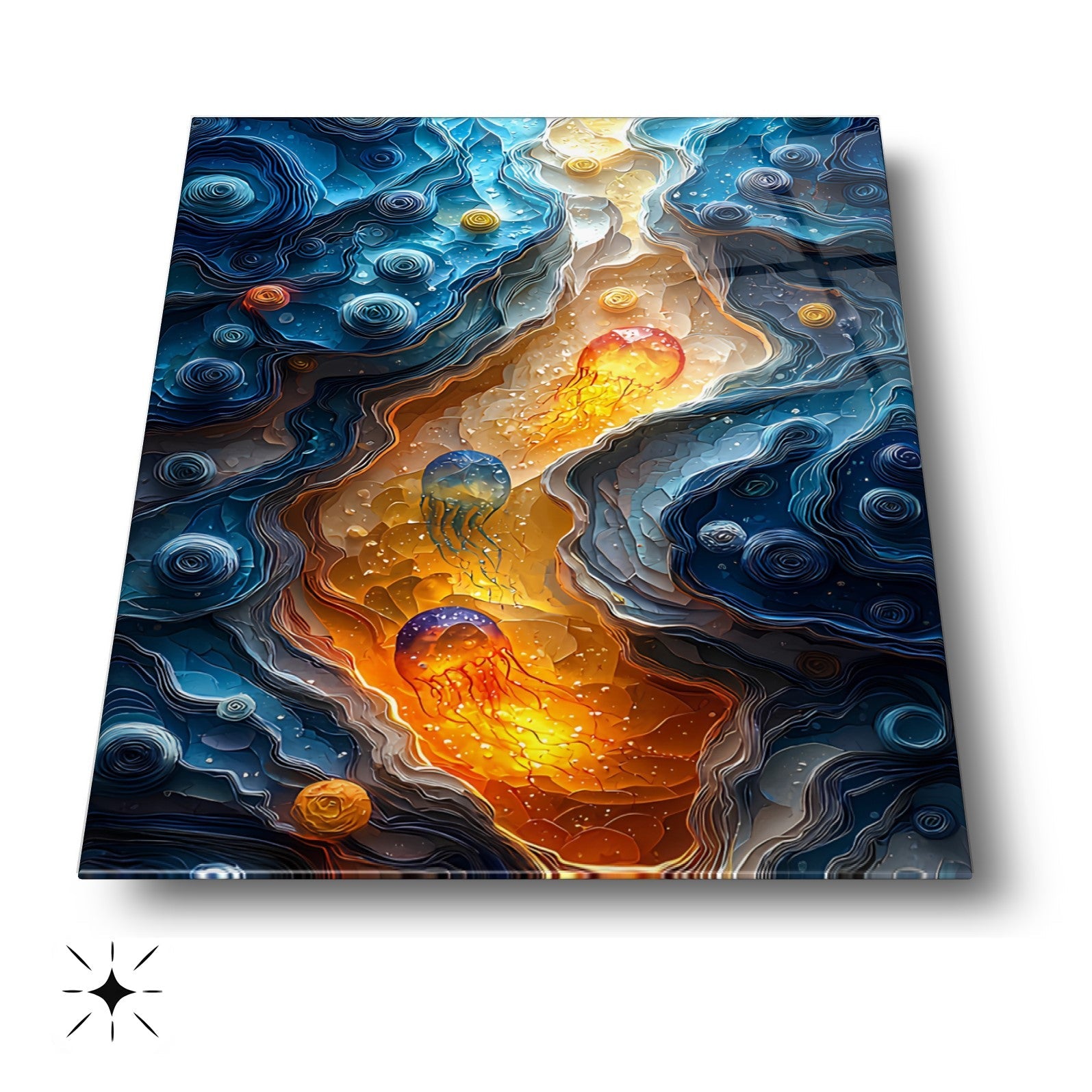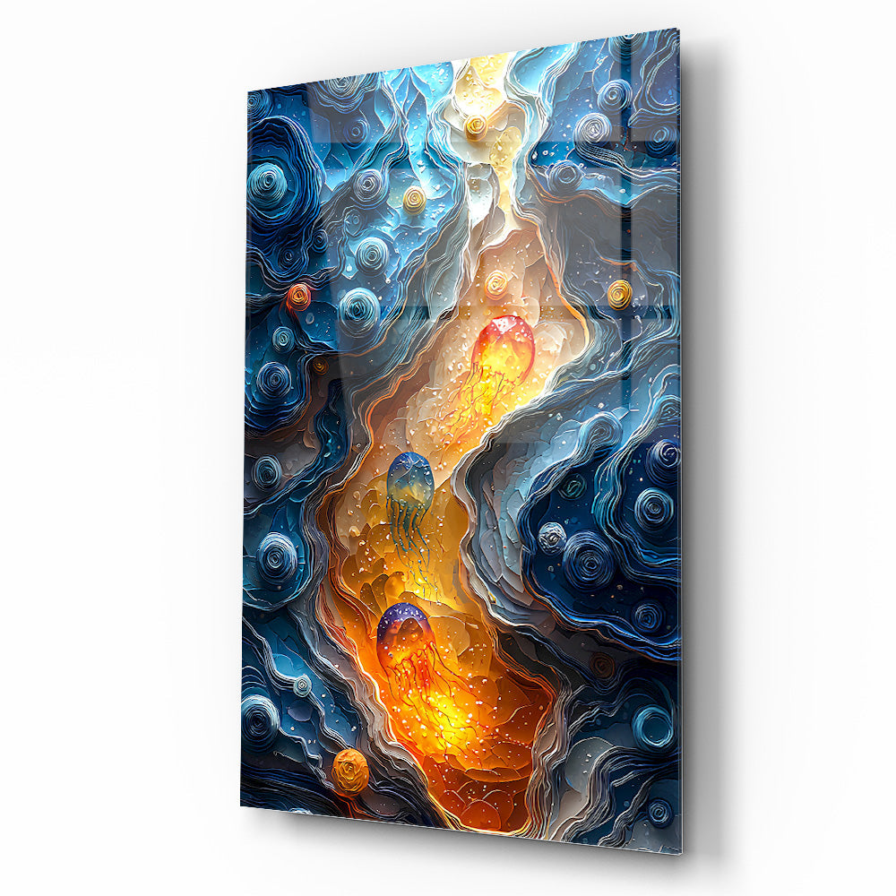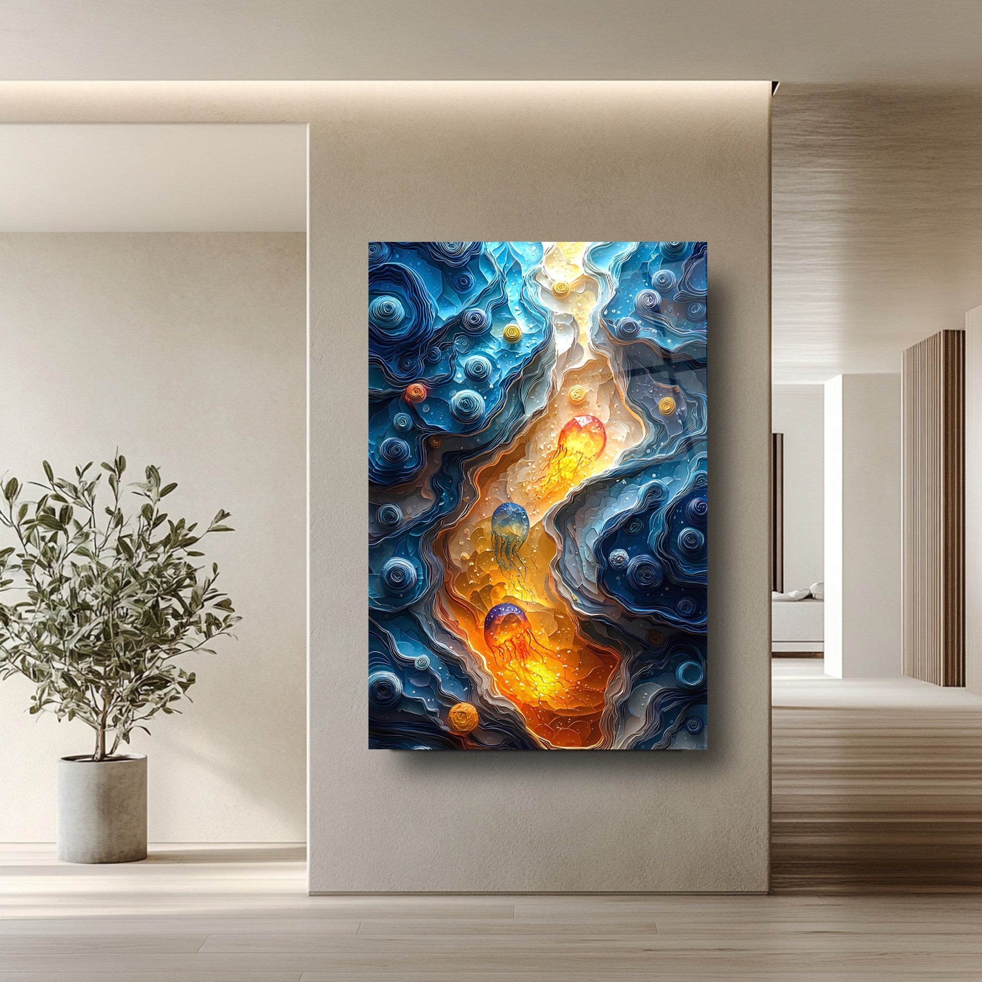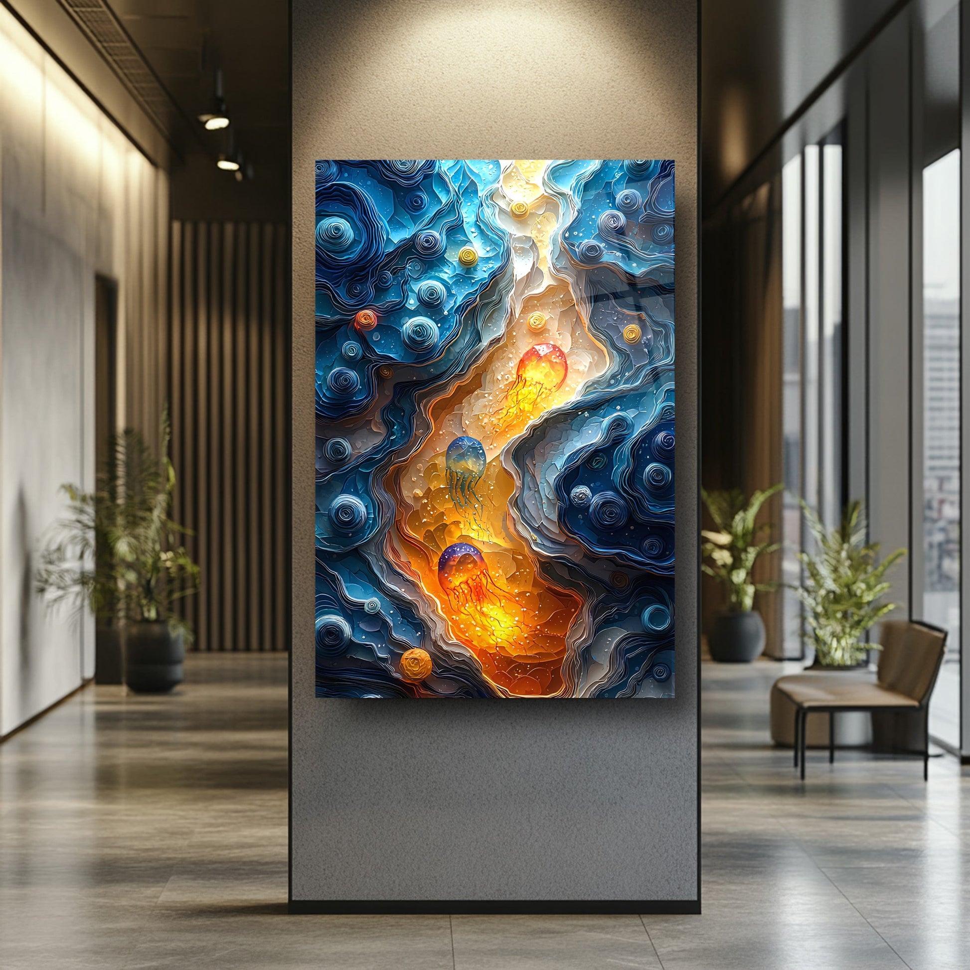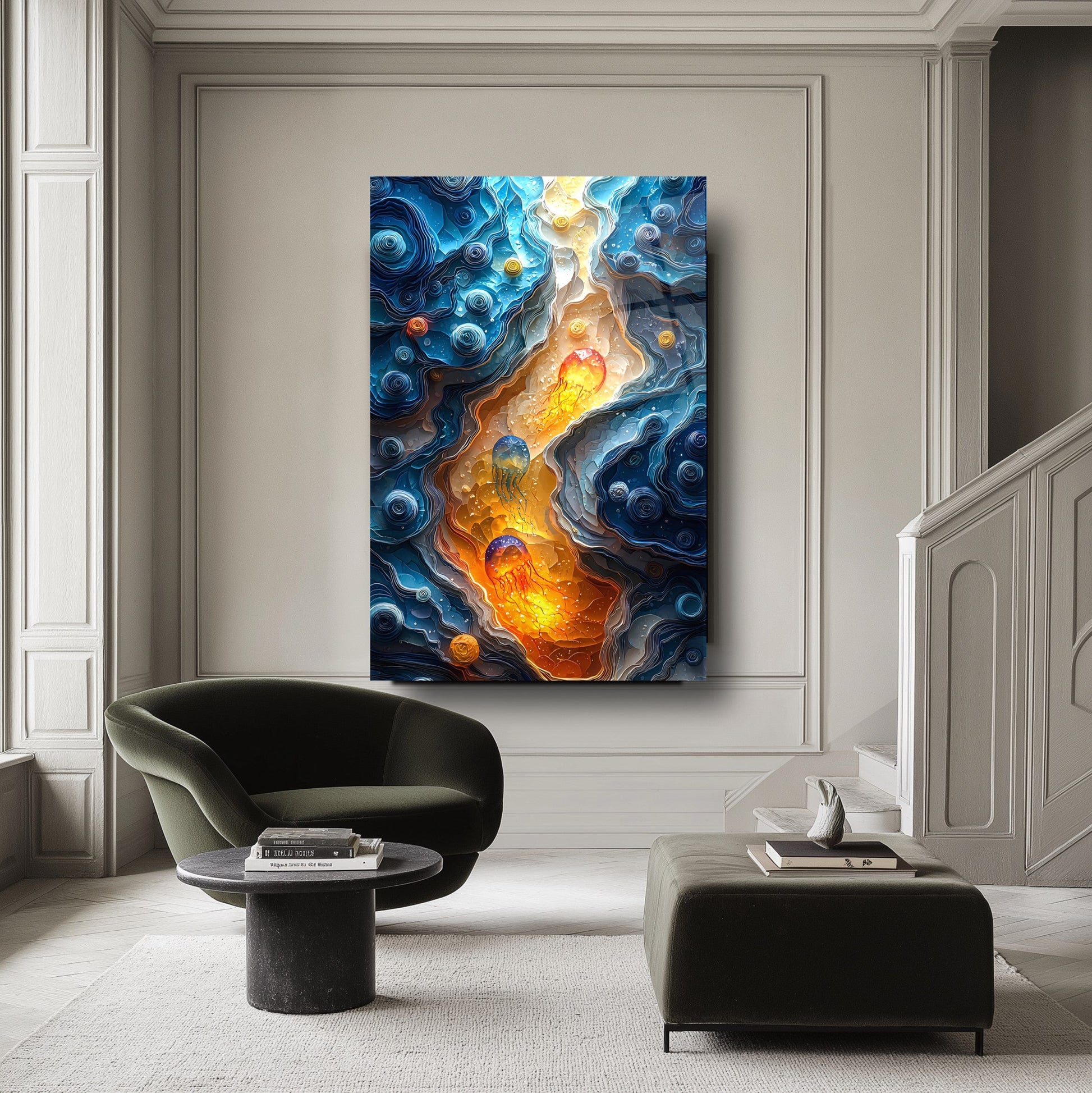 Modern ve sofistike bir atmosfer yaratmak isteyenler için ideal bir seçenek olan bu tablo, mavi ve sarı tonlarındaki soyut nehir figürüyle dikkat çekiyor. Yapay zeka destekli tasarım ve üç boyutlu kabartma efekti, mekânınıza derinlik ve estetik bir dokunuş katıyor. 4 mm kalınlığındaki ultra-clear temperli cam, standart camlara göre 10 kat daha dayanıklıdır ve rodajlanmış kenarlarıyla güvenli kullanım sağlar. UV dijital baskı teknolojisiyle uygulanan yüksek çözünürlüklü baskı, renklerin solmasını engeller ve uzun ömürlü kullanım sunar. Kolay montajı sayesinde hemen duvarınıza asılabilir. Salon, oturma odası veya ofis gibi farklı alanlarda şıklığıyla öne çıkar. Evinize veya iş yerinize modern bir atmosfer kazandırmak için bu tablo mükemmel bir tercih olacaktır.