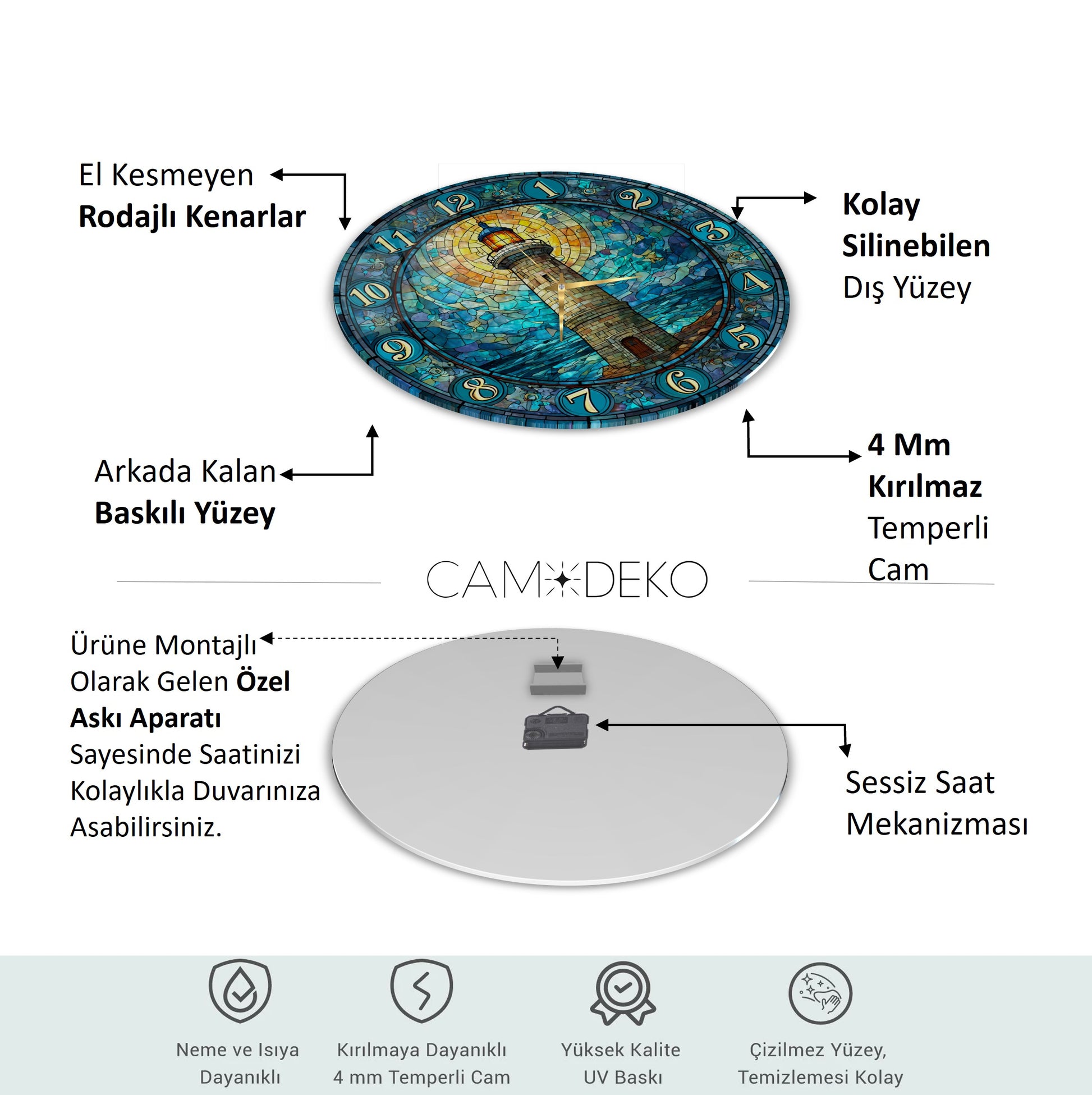 Cam saatlerimiz, son teknoloji UV baskı makineleriyle doğrudan cama uygulanır. Kağıt veya folyo yapıştırma kullanılmaz; baskılar camın arka yüzeyine işlenerek uzun ömürlü ve dayanıklı hale getirilir. Ek olarak, fırınlama boya işlemi ile güçlendirilerek solmaya ve deformasyona karşı ekstra koruma sağlanır.