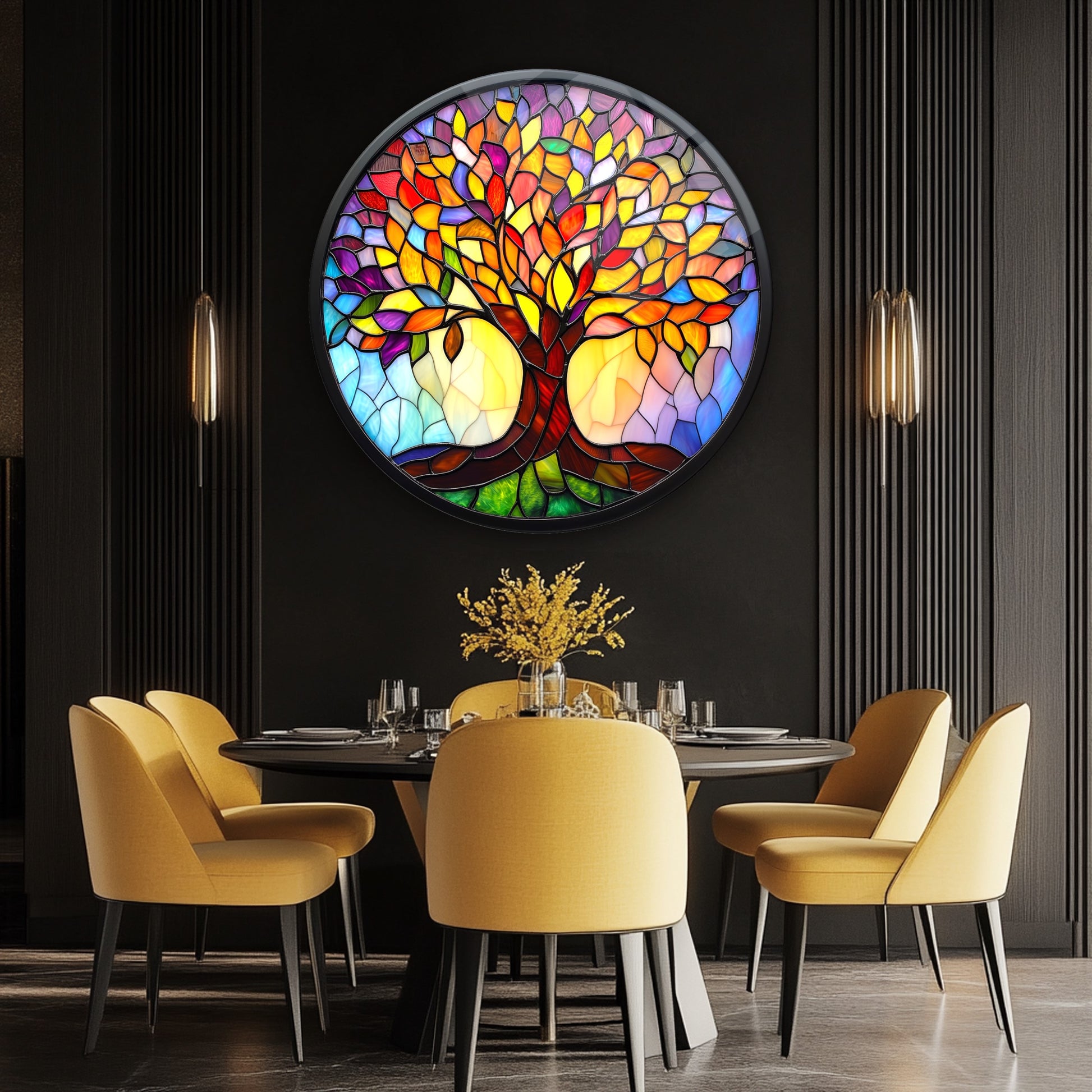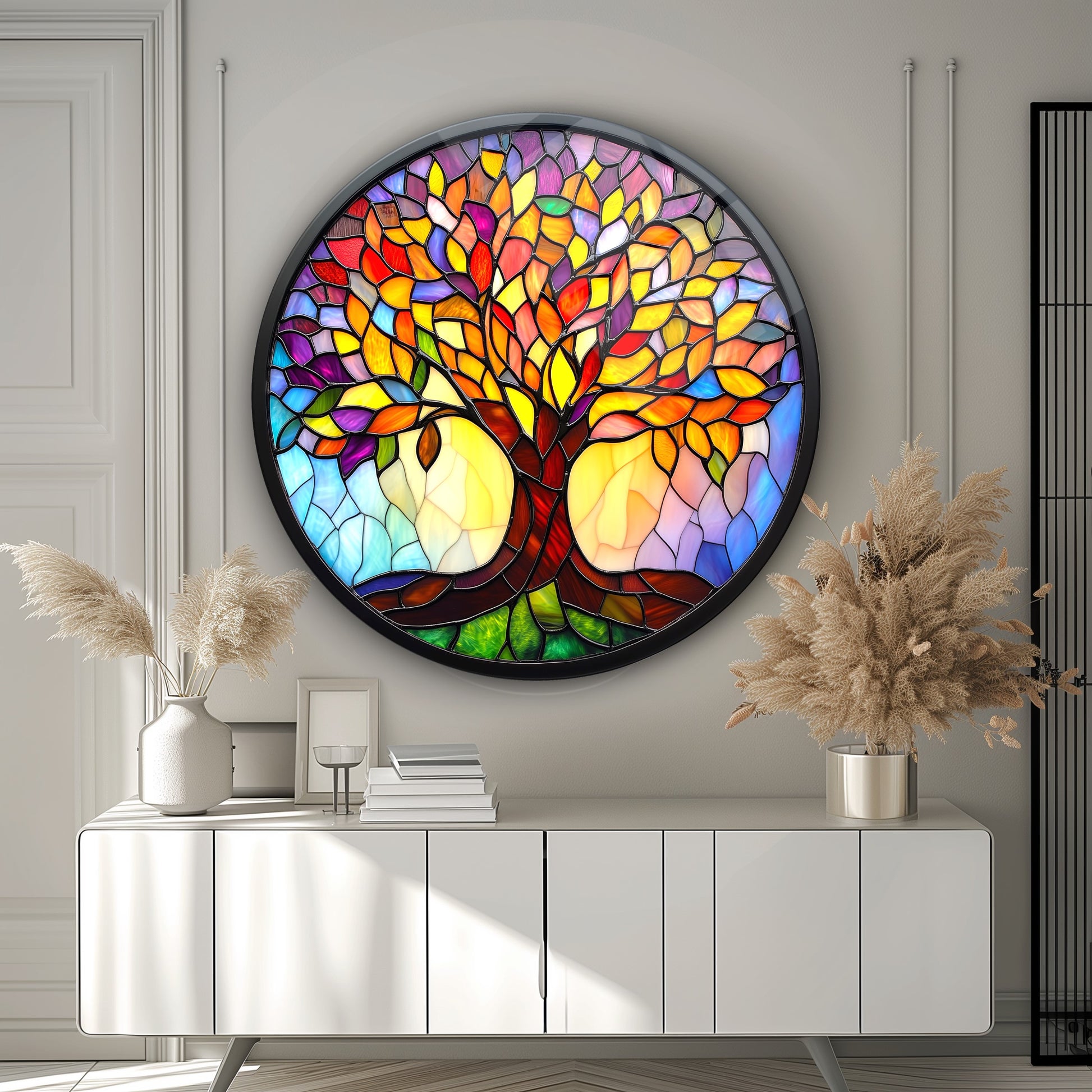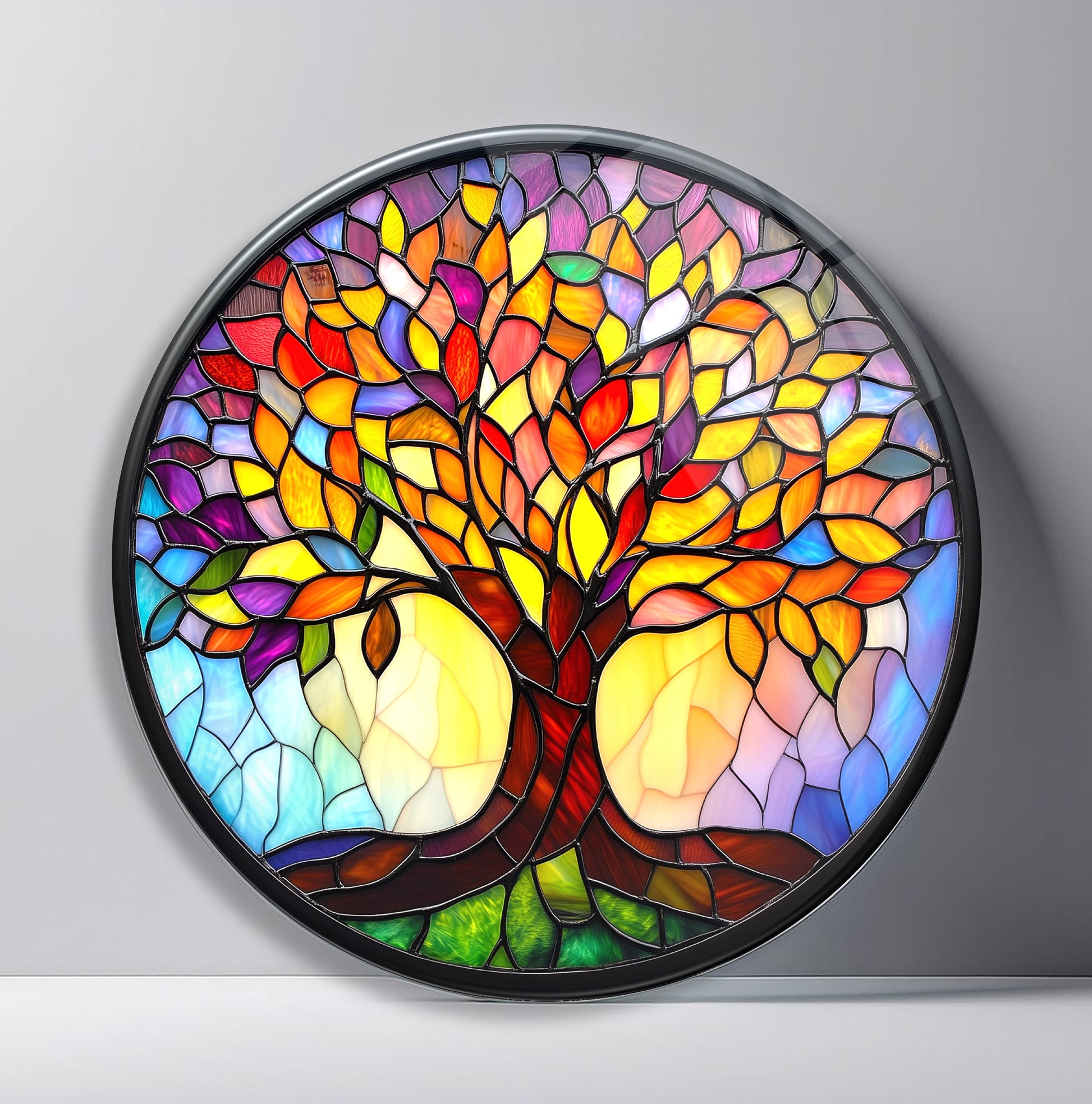 Vitray Desen Renkli Hayat Ağacı Yuvarlak Cam Tablo