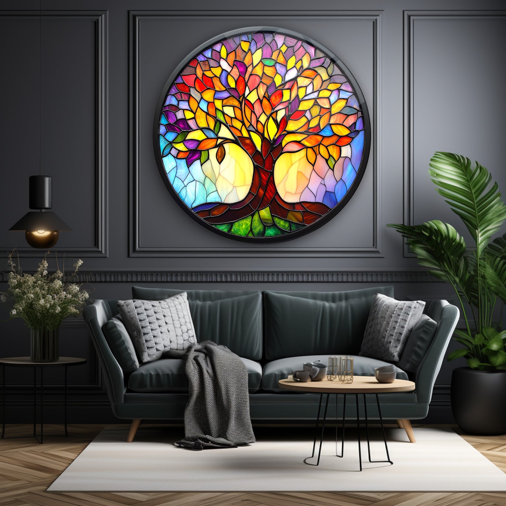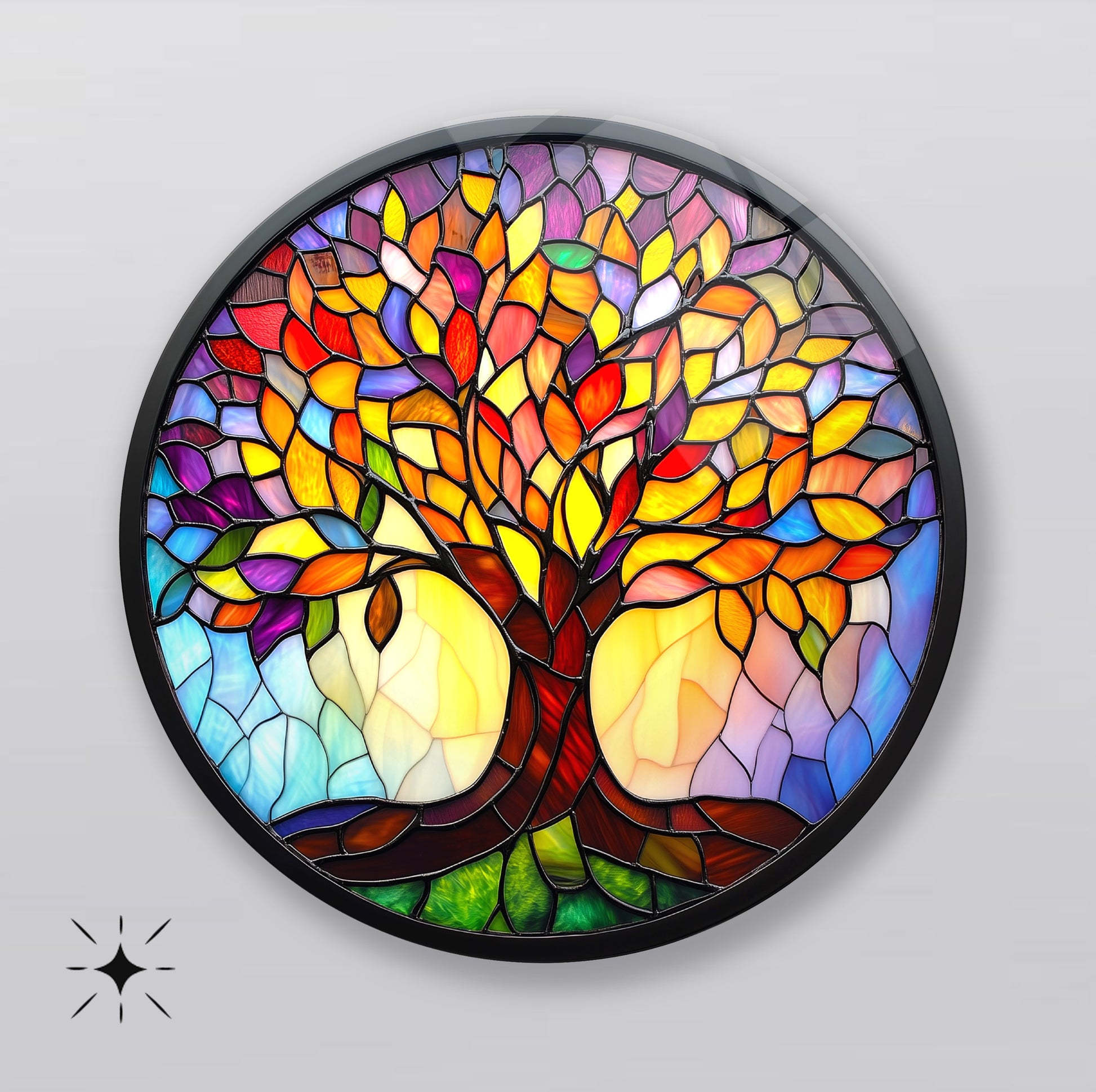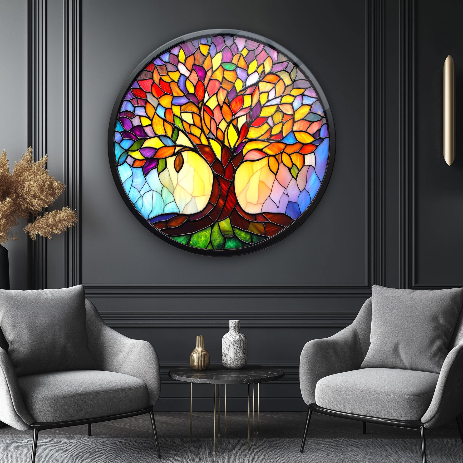 Vitray Desen Renkli Hayat Ağacı Yuvarlak Cam Tablo