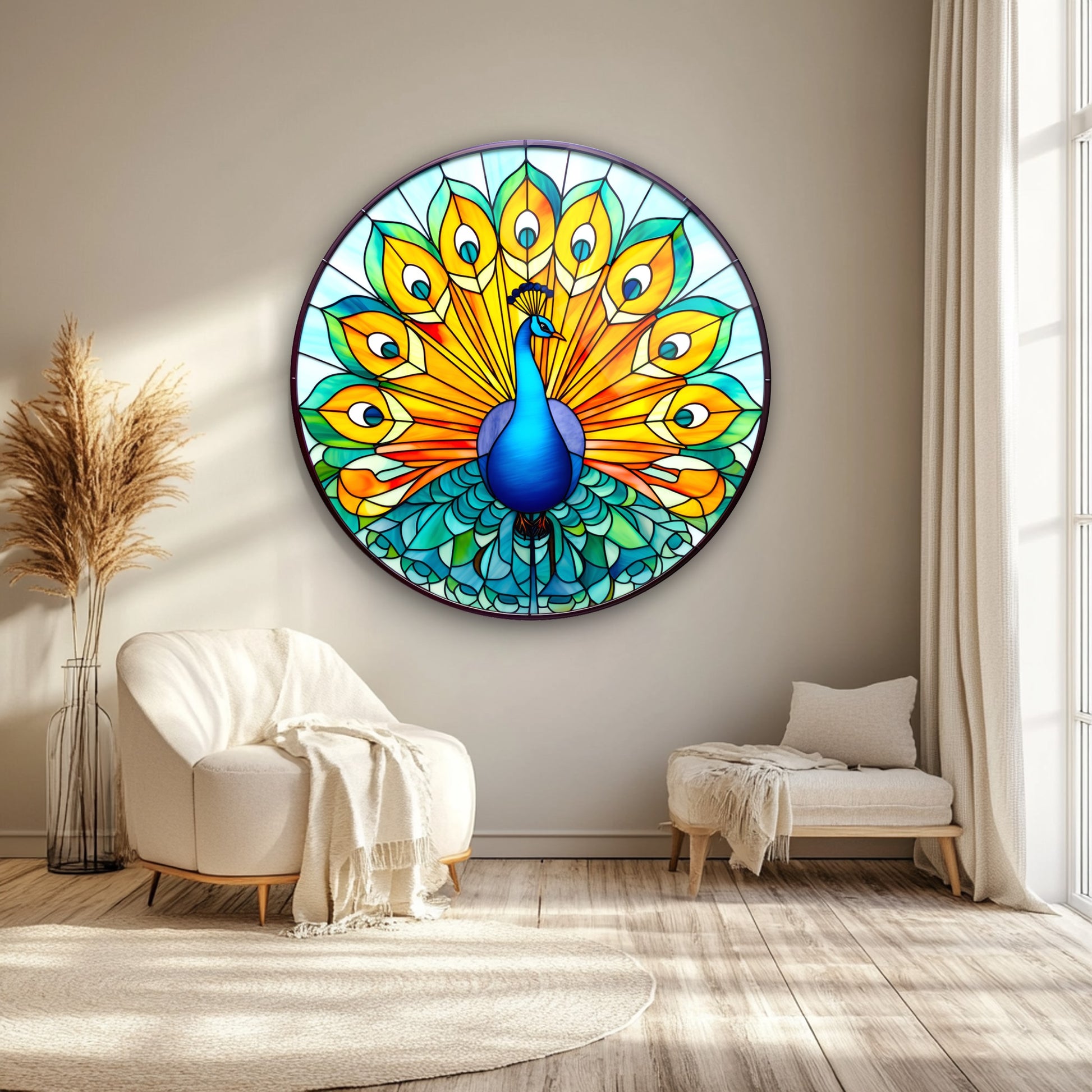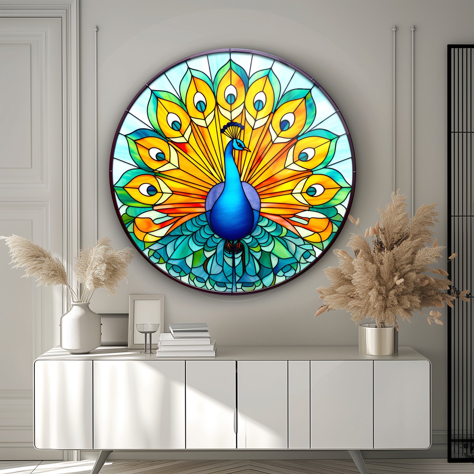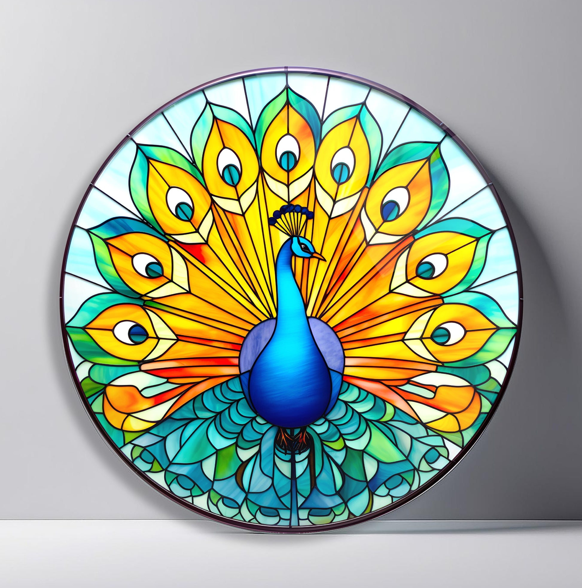 Vitray Desen Tavus Kuşu Yuvarlak Cam Tablo