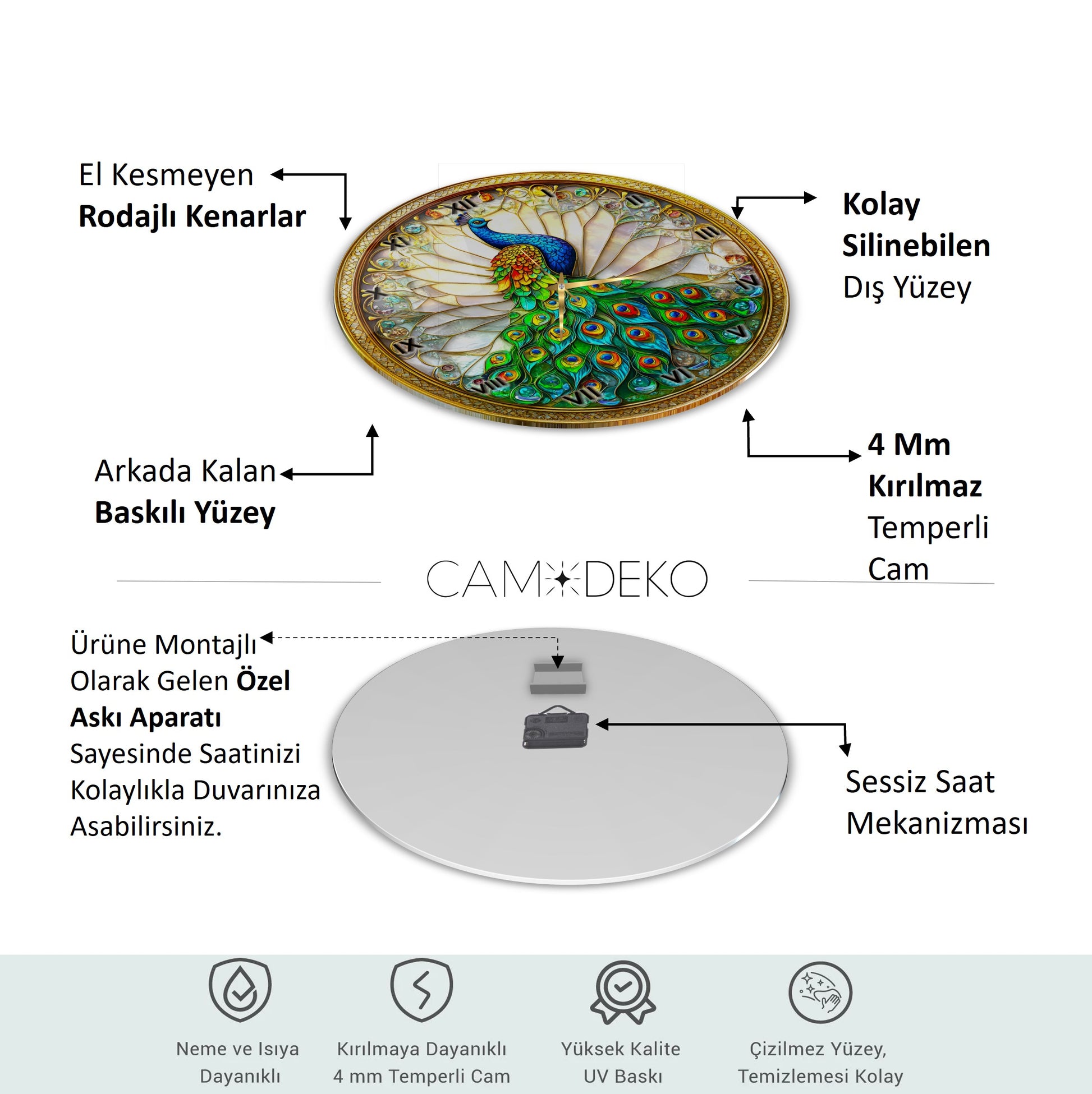 Cam saatlerimiz, son teknoloji UV baskı makineleriyle doğrudan cama uygulanır. Kağıt veya folyo yapıştırma kullanılmaz; baskılar camın arka yüzeyine işlenerek uzun ömürlü ve dayanıklı hale getirilir. Ek olarak, fırınlama boya işlemi ile güçlendirilerek solmaya ve deformasyona karşı ekstra koruma sağlanır.