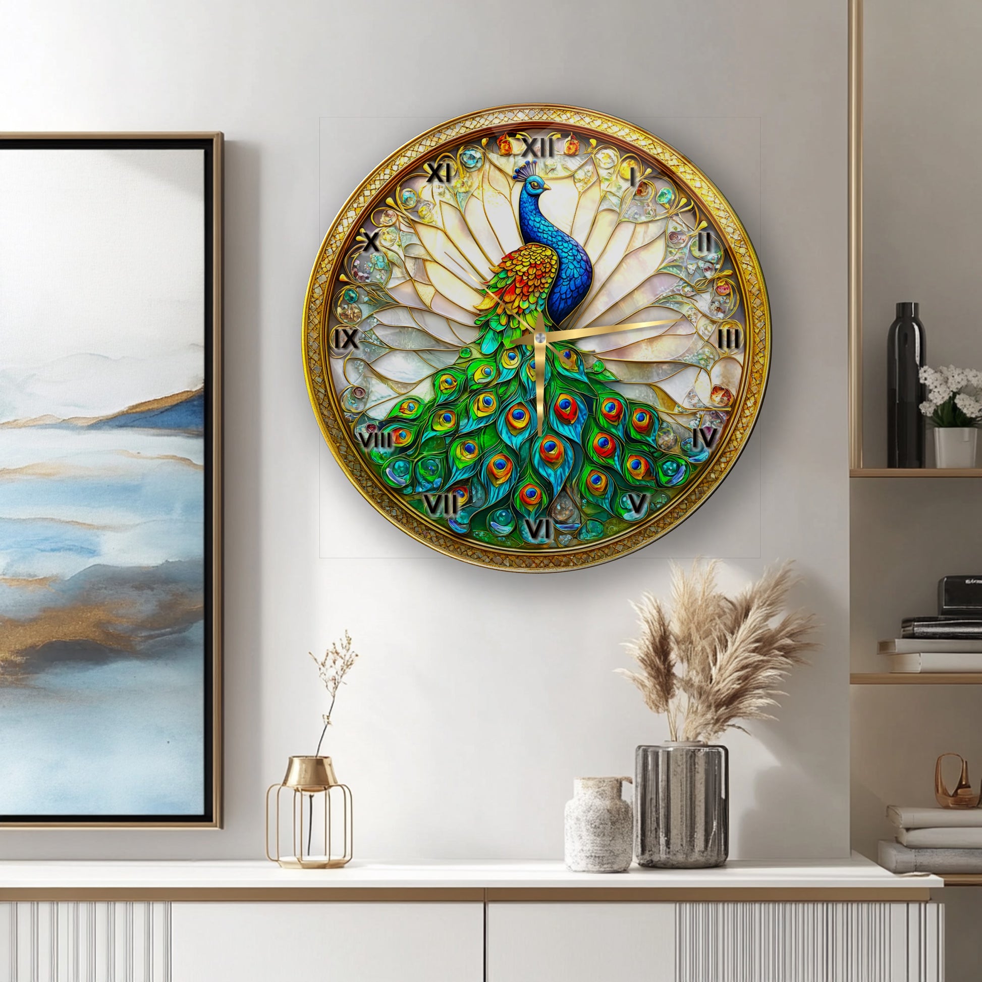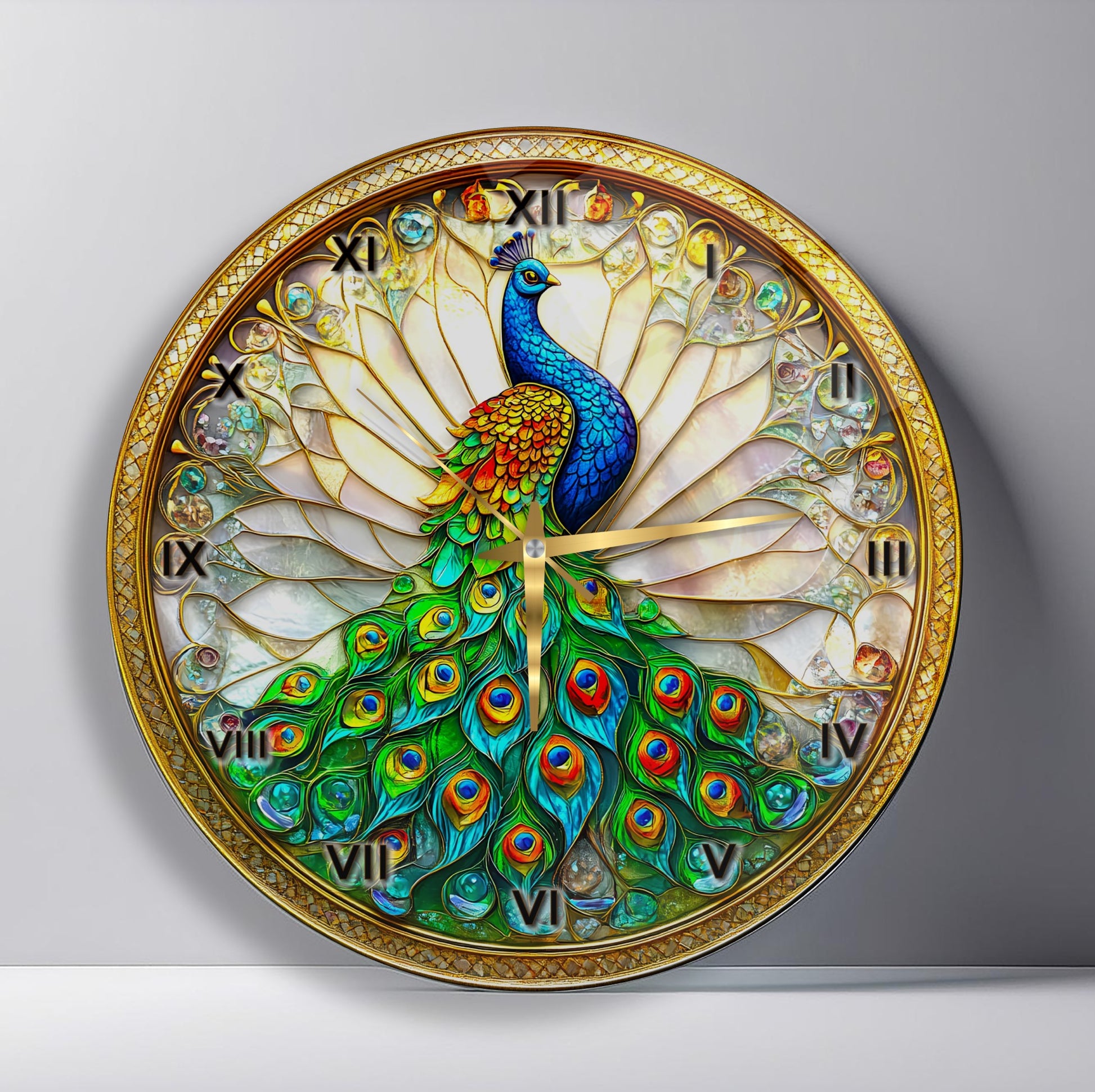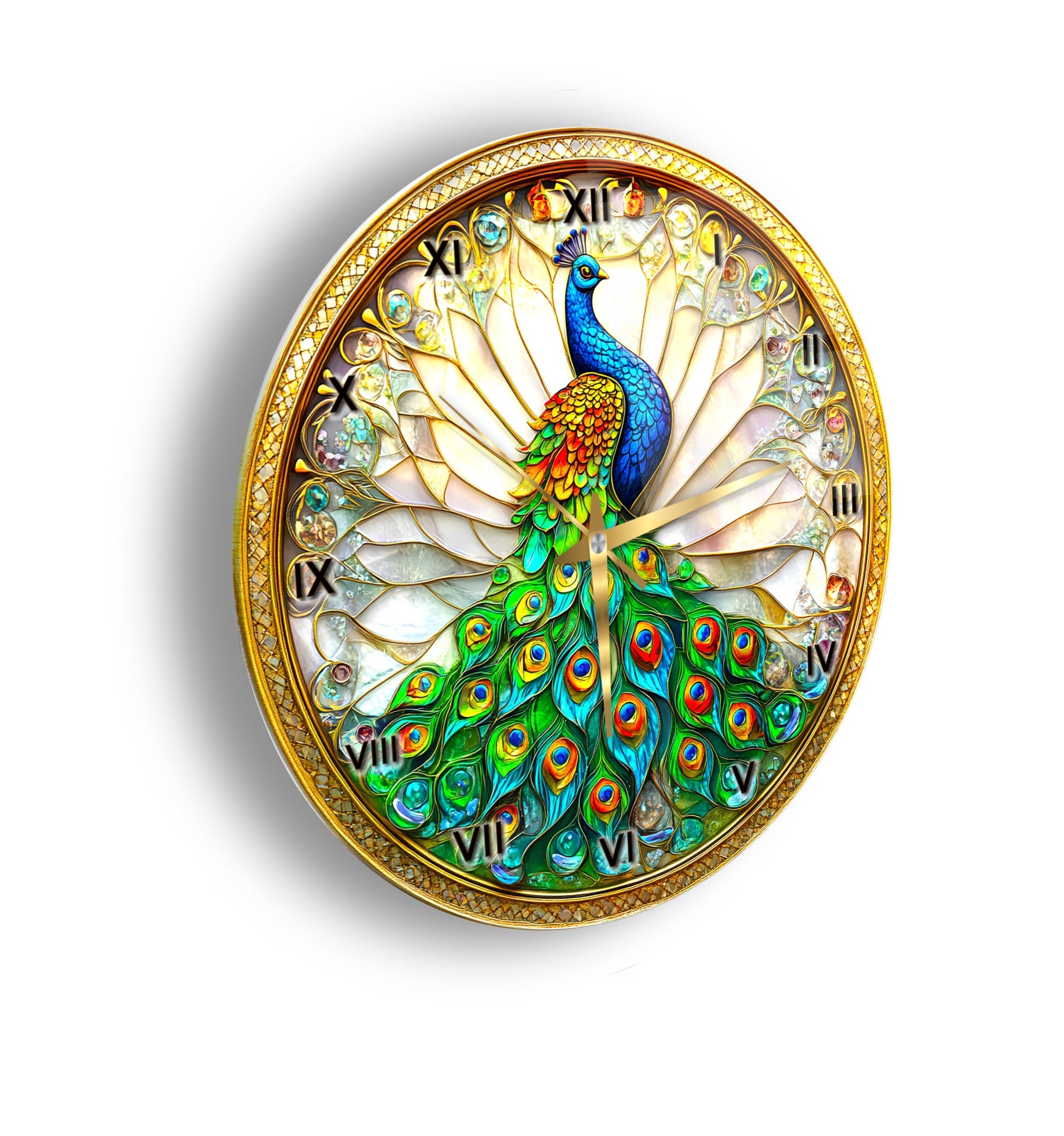 Vitray Desen Tavus Kuşu Cam Duvar Saati