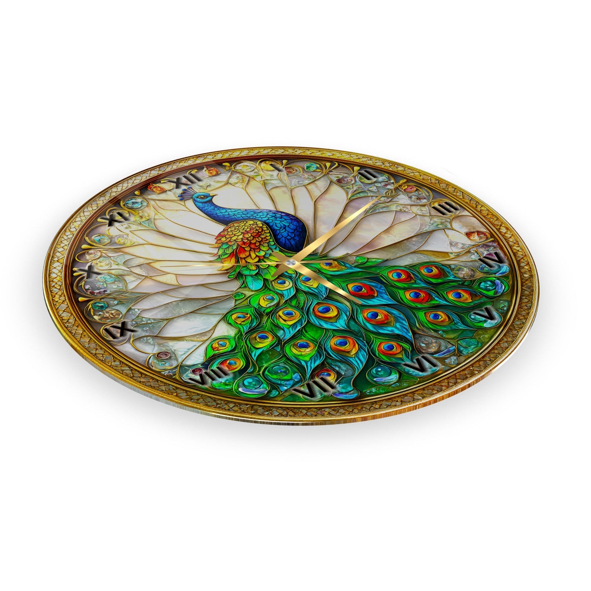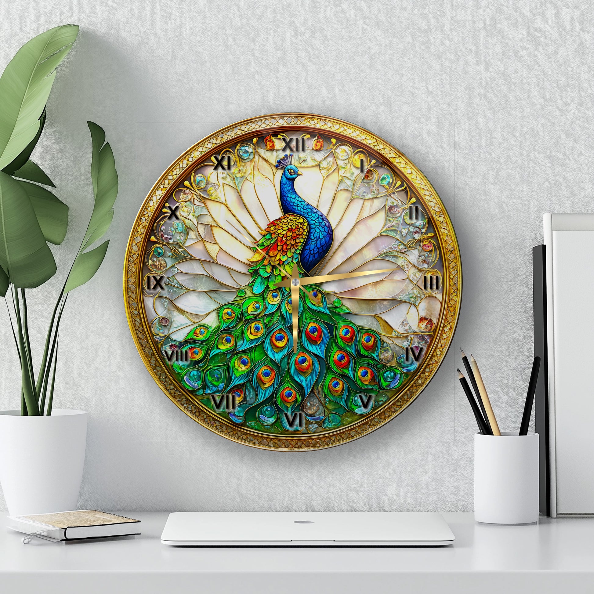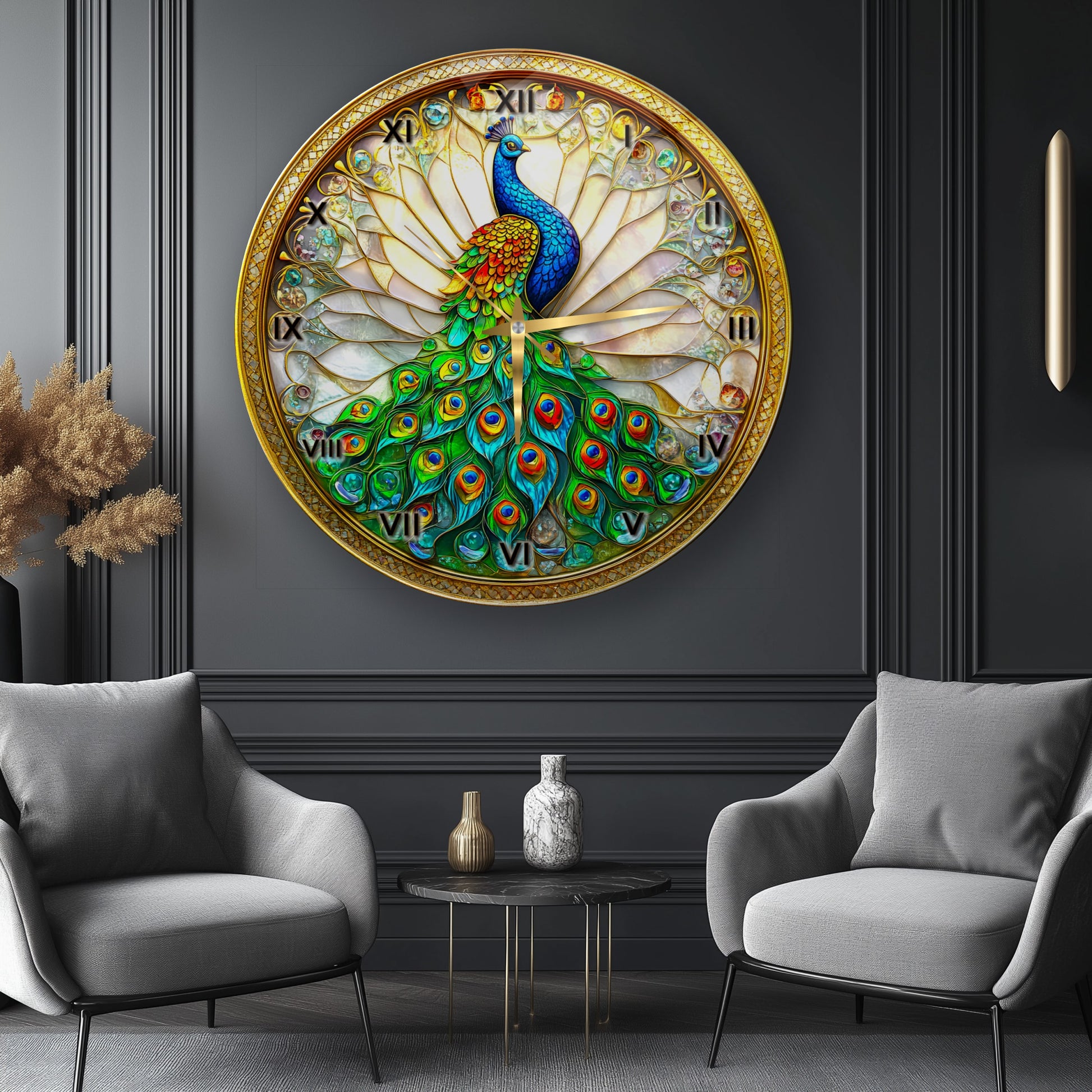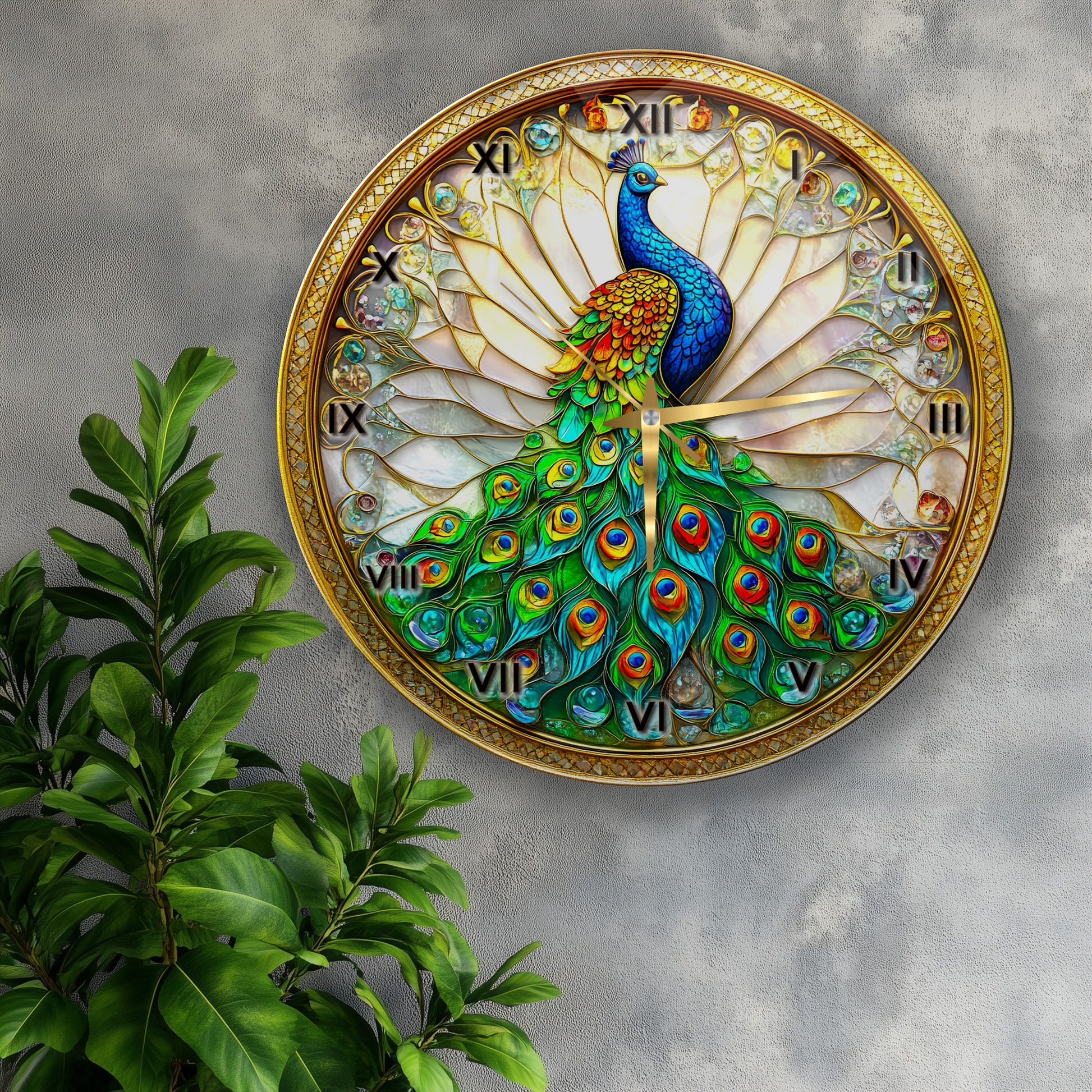 Vitray Desen Tavus Kuşu Cam Duvar Saati