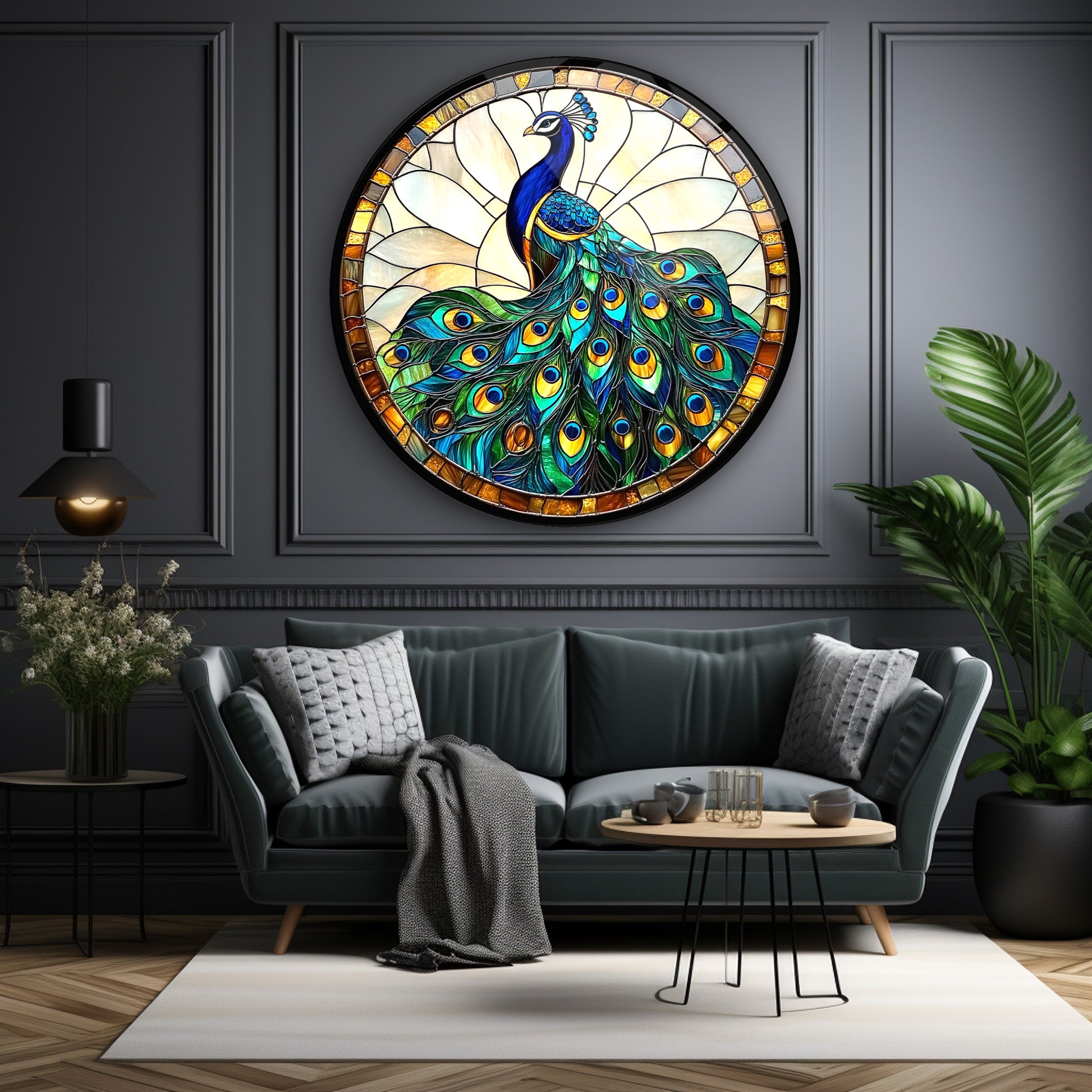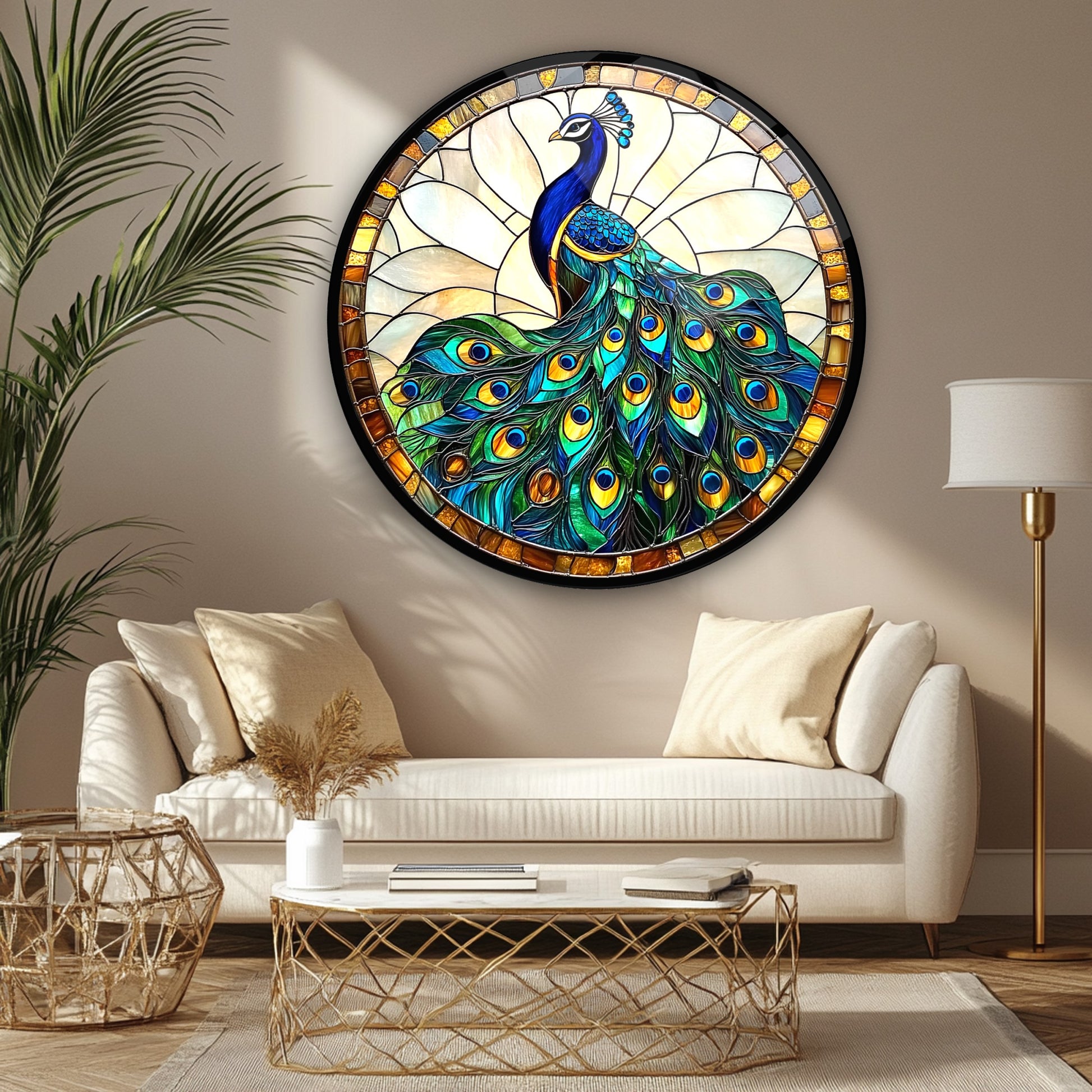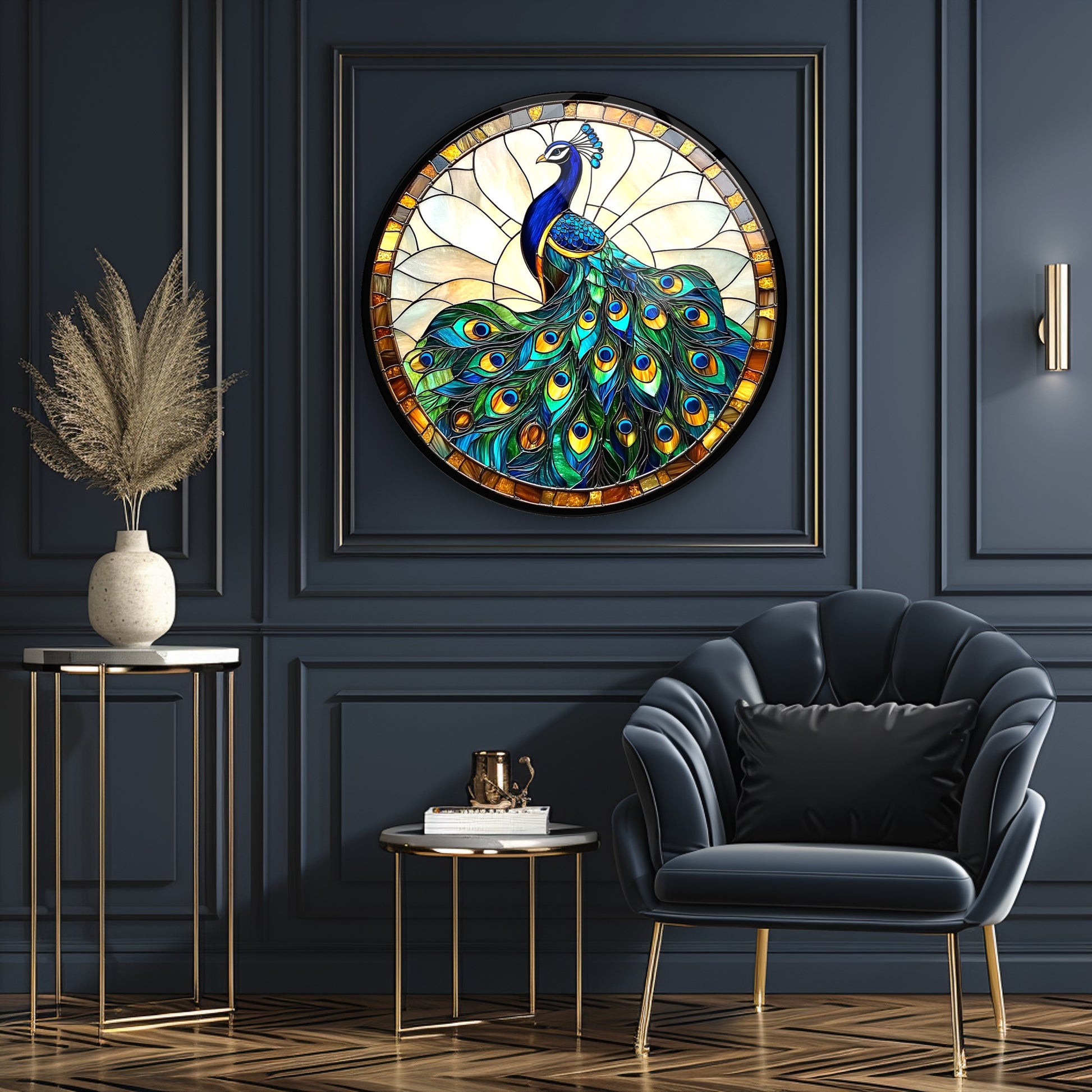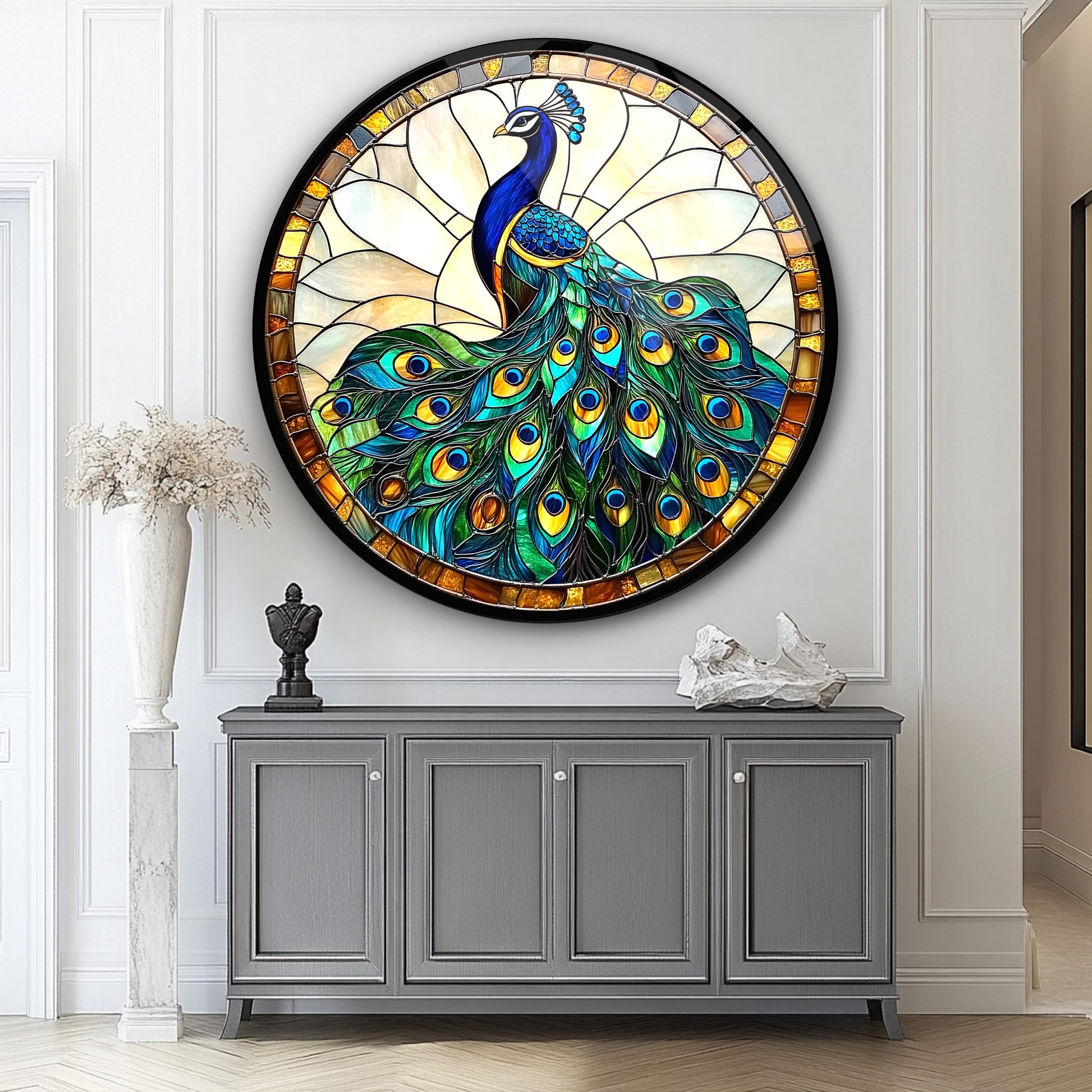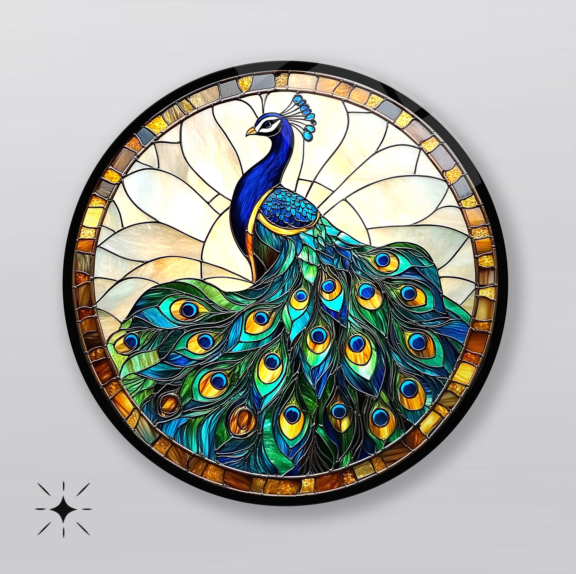 Vitray Desen Yeşil Tavus Kuşu Yuvarlak Cam Tablo