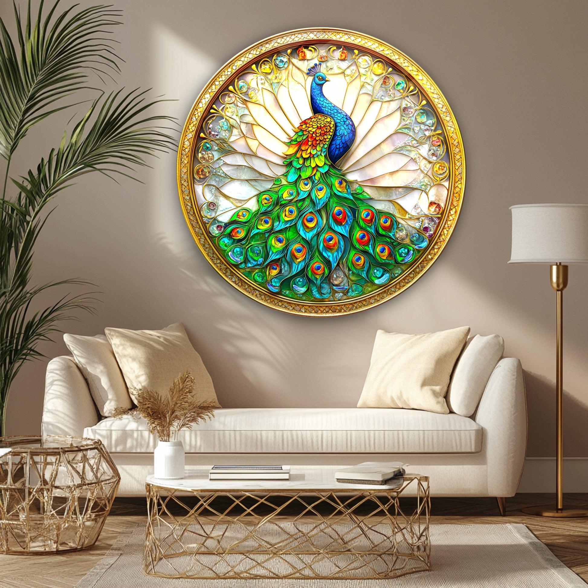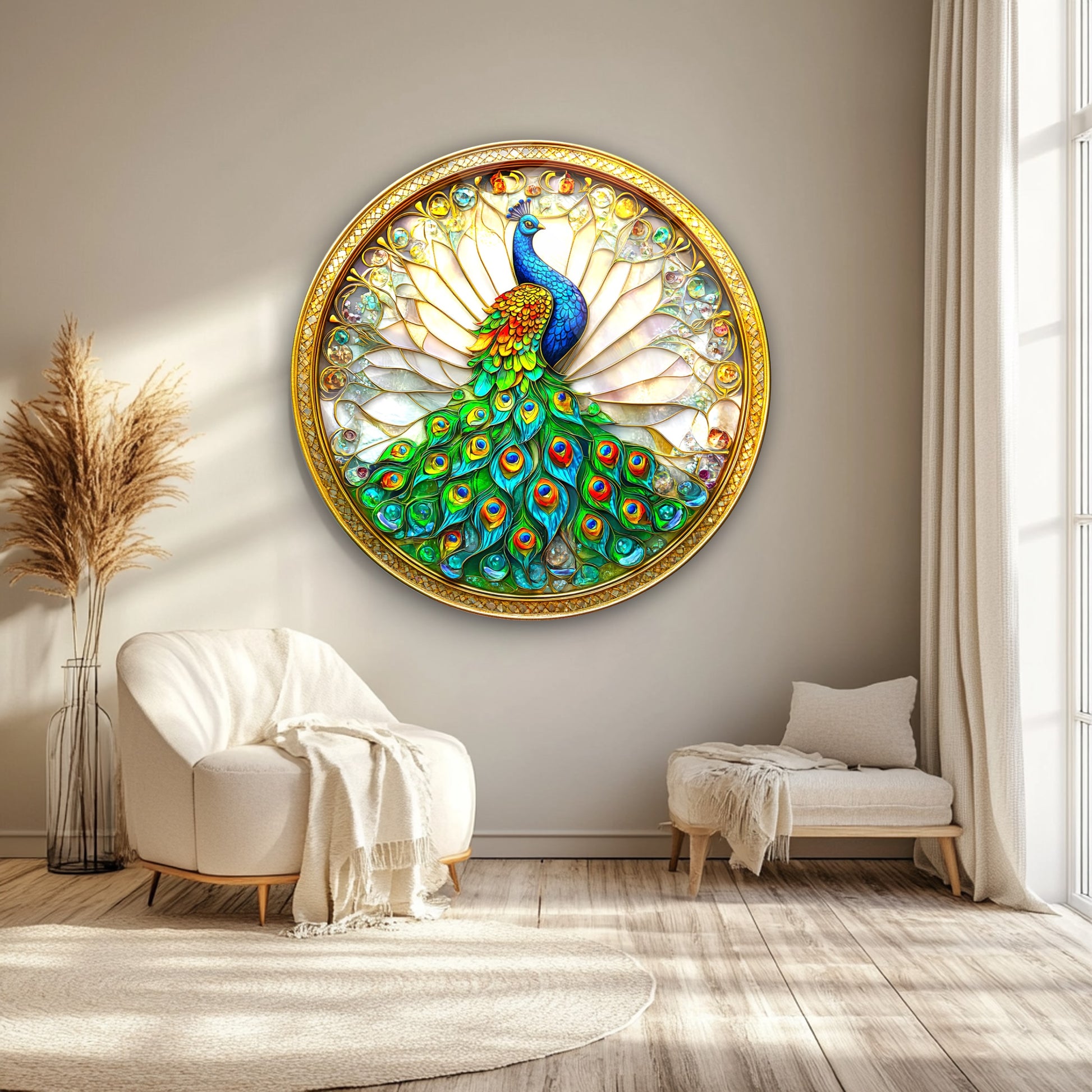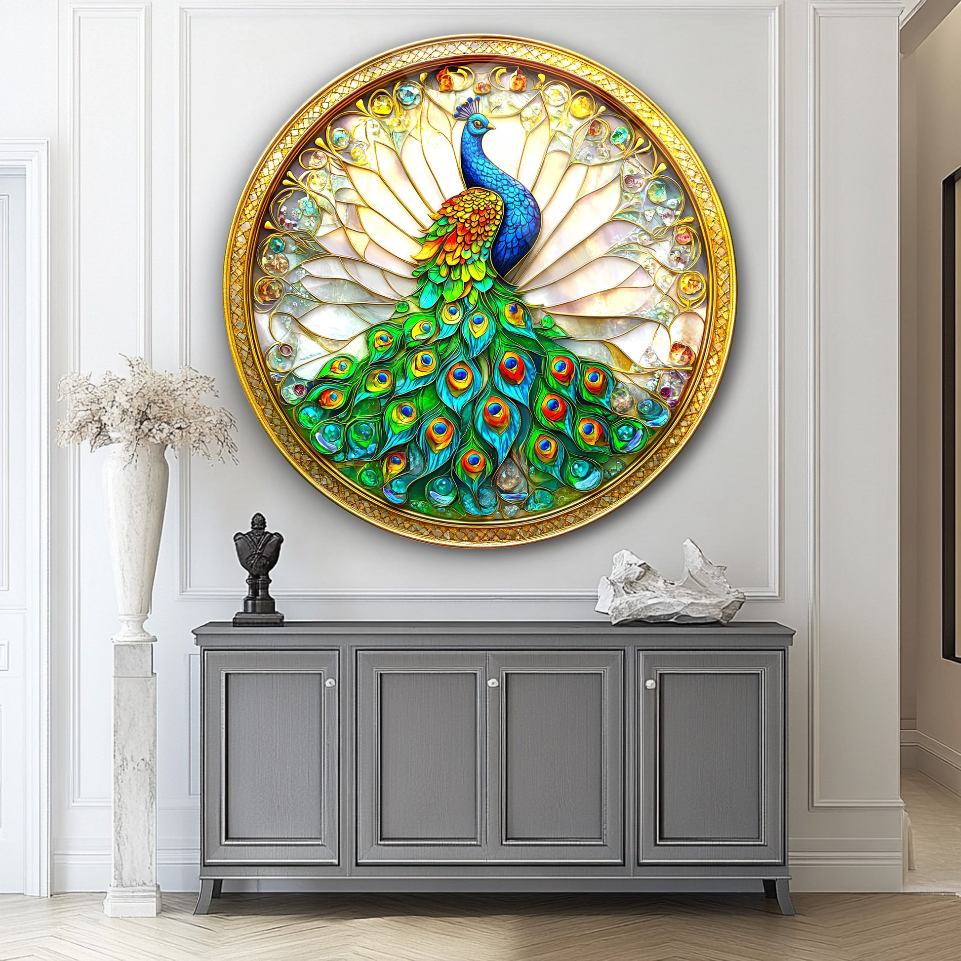 Vitray Desen Tavus Kuşu Yuvarlak Cam Tablo