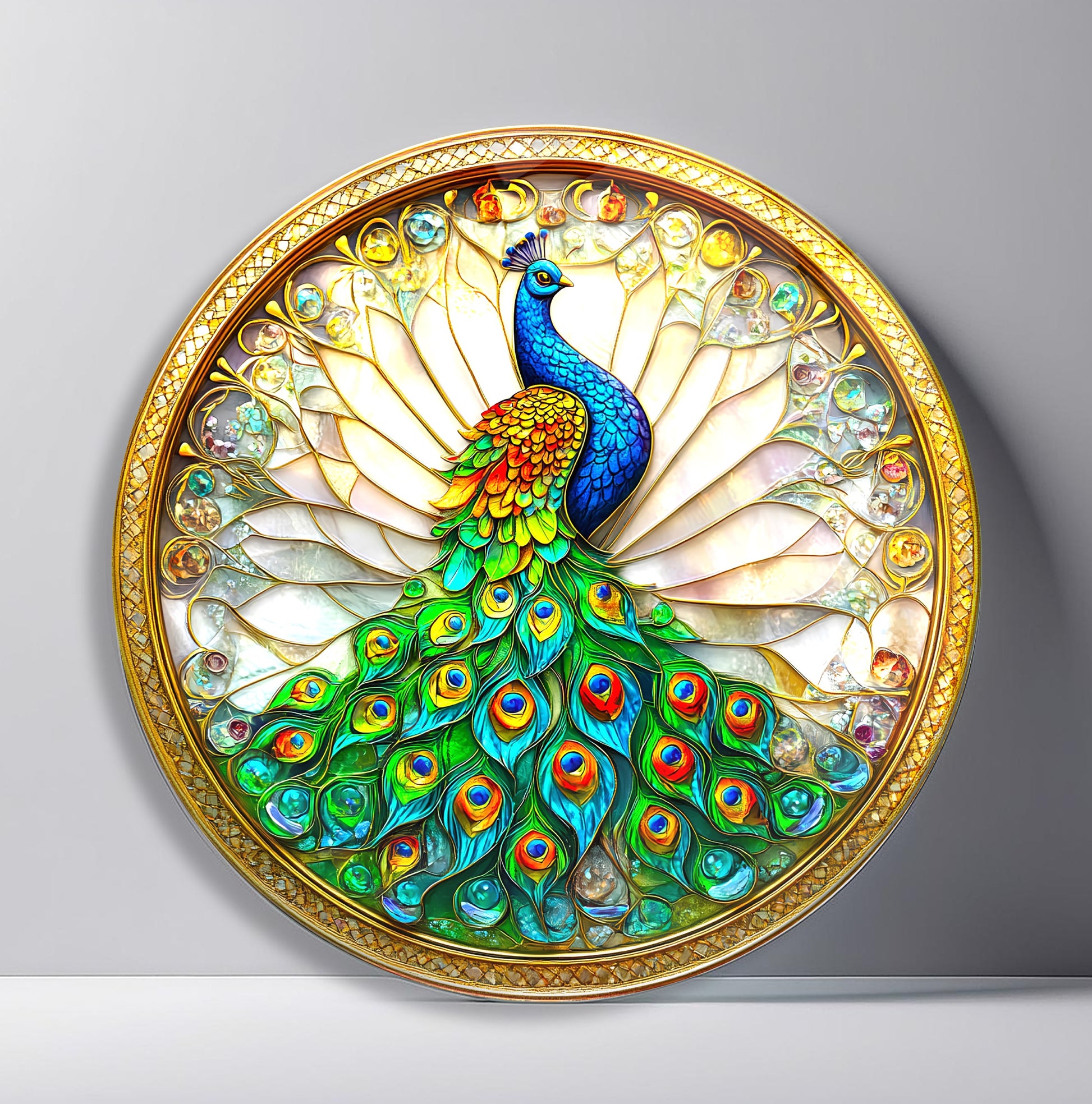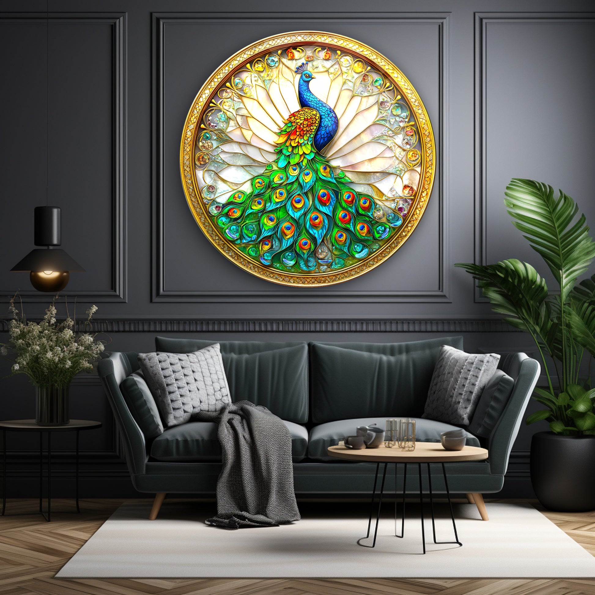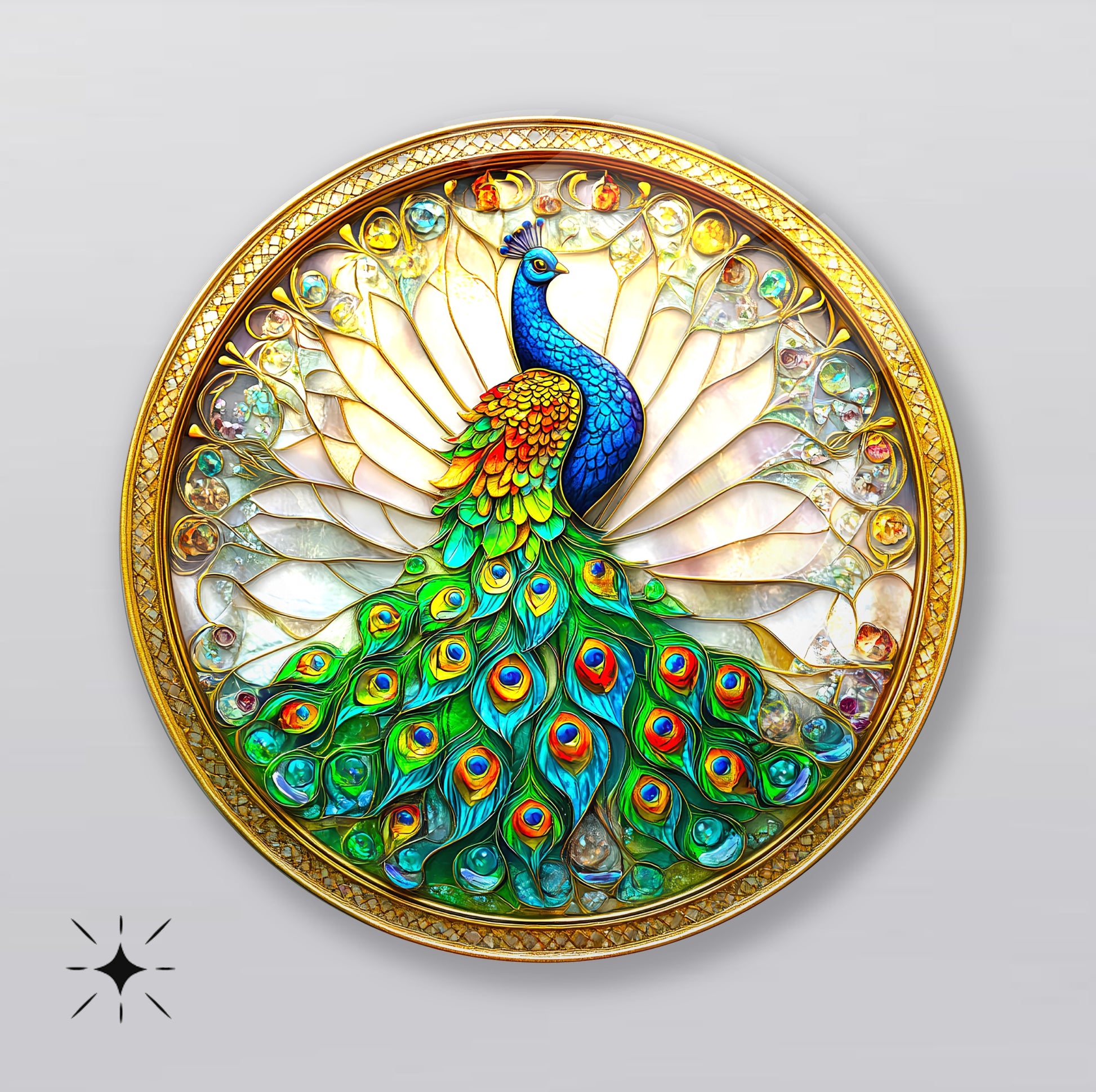Vitray Desen Tavus Kuşu Yuvarlak Cam Tablo