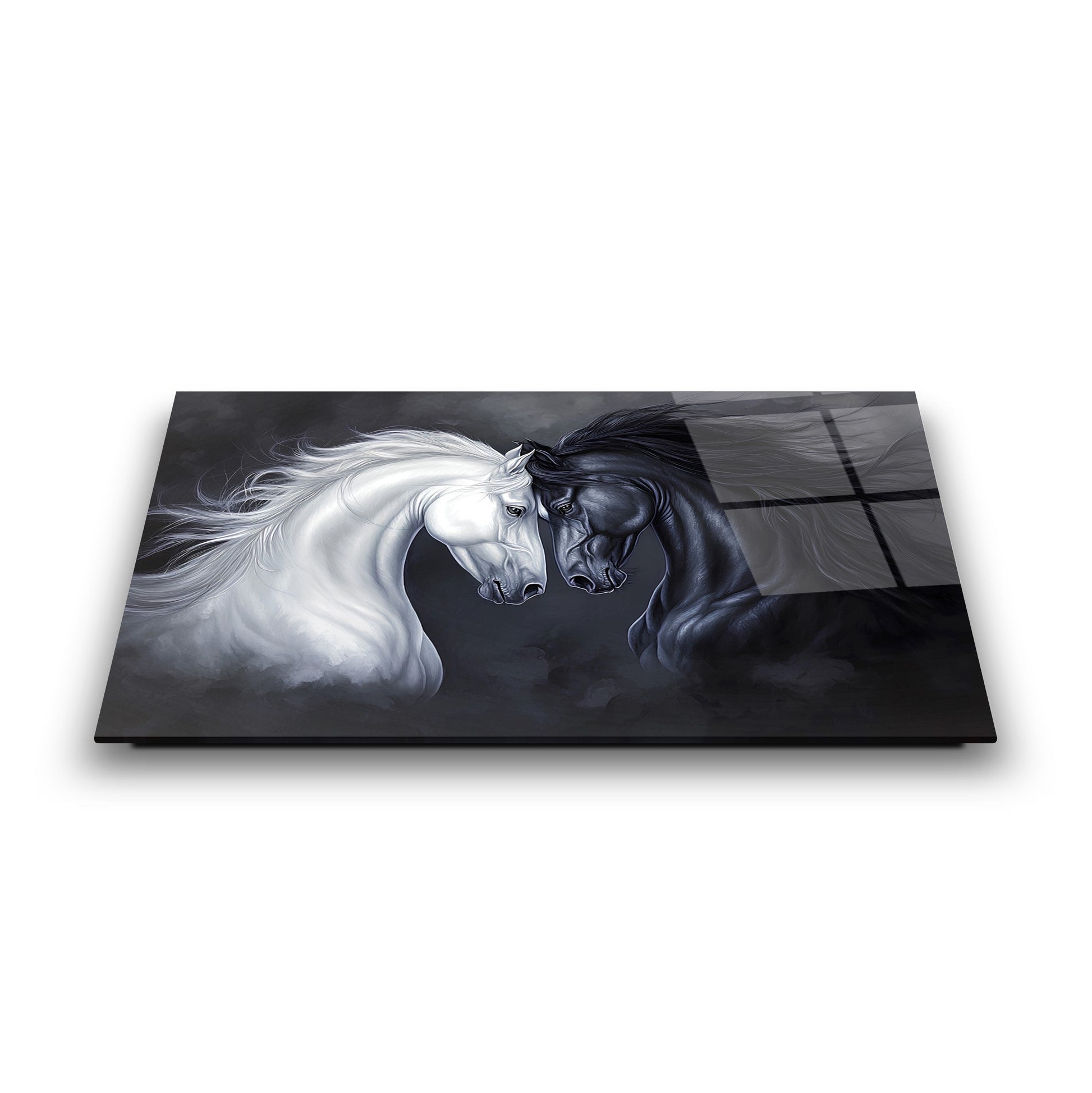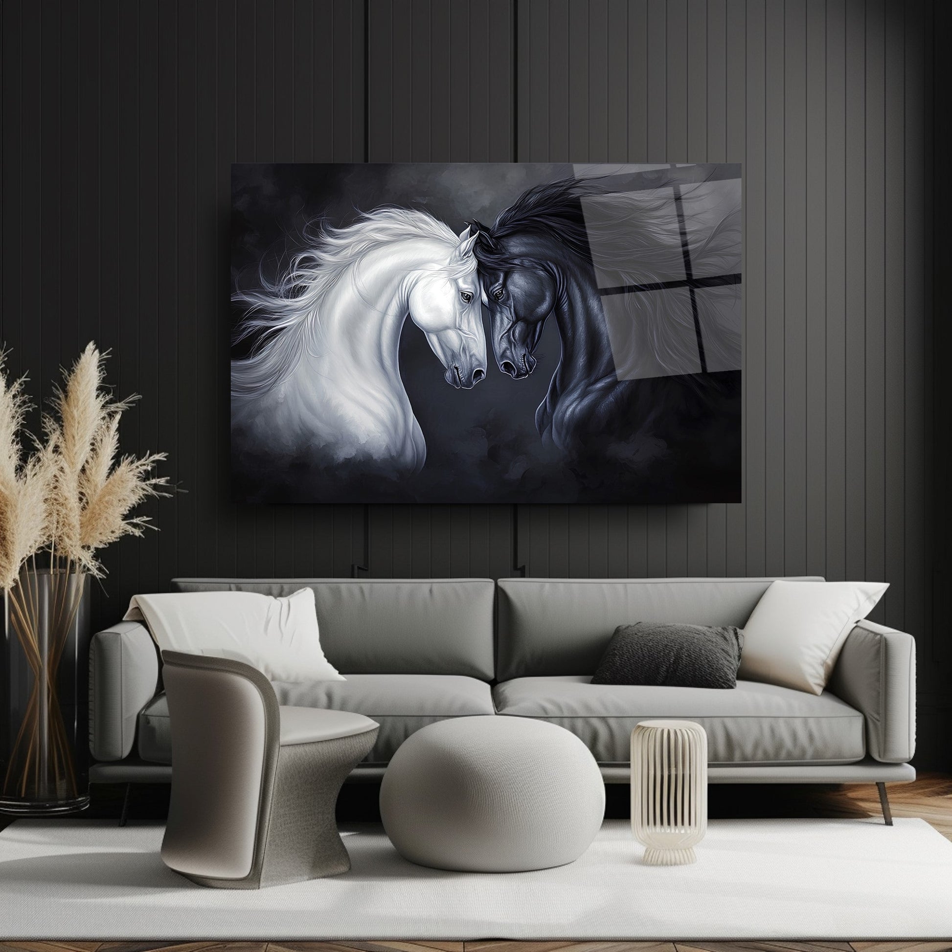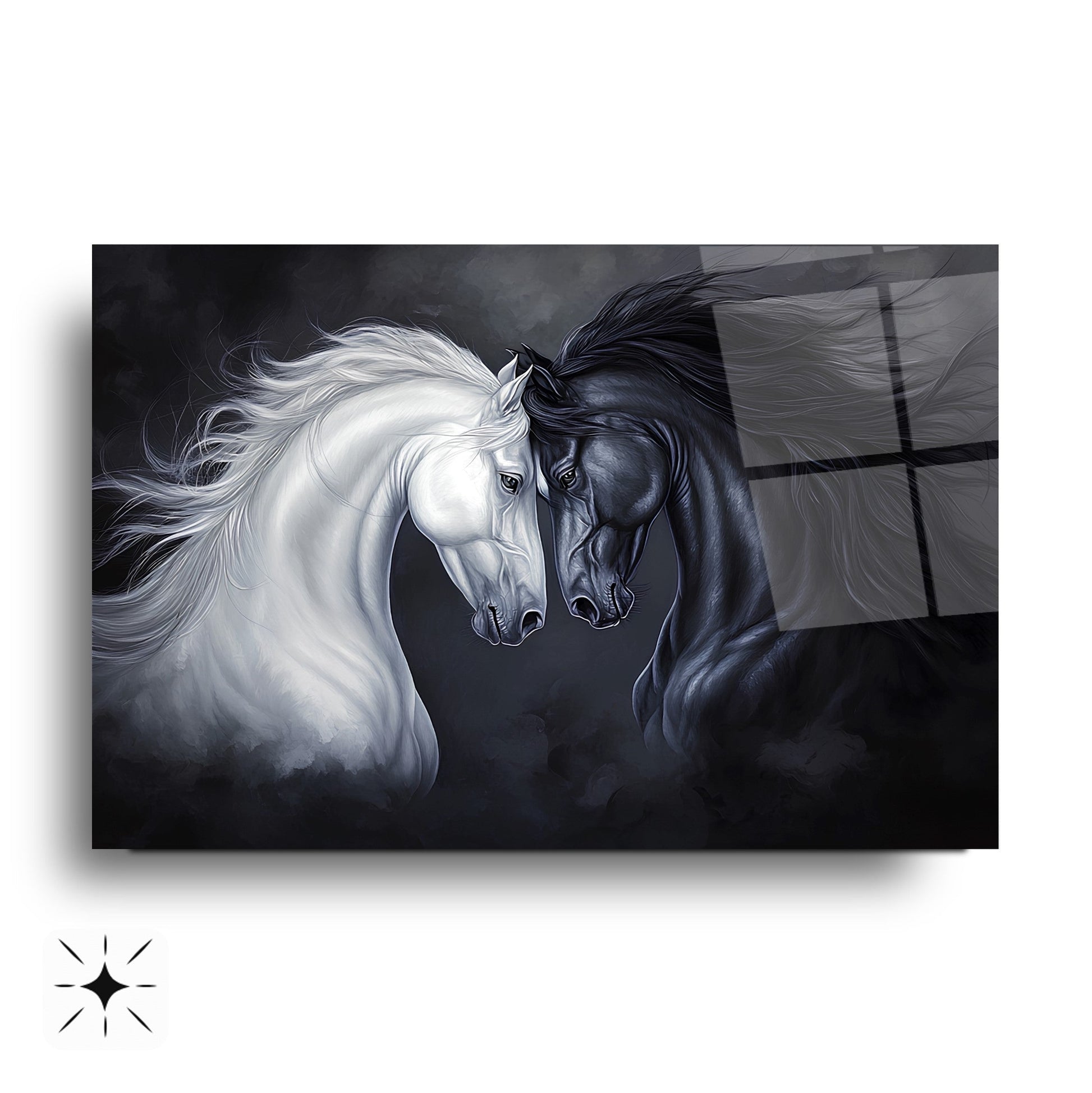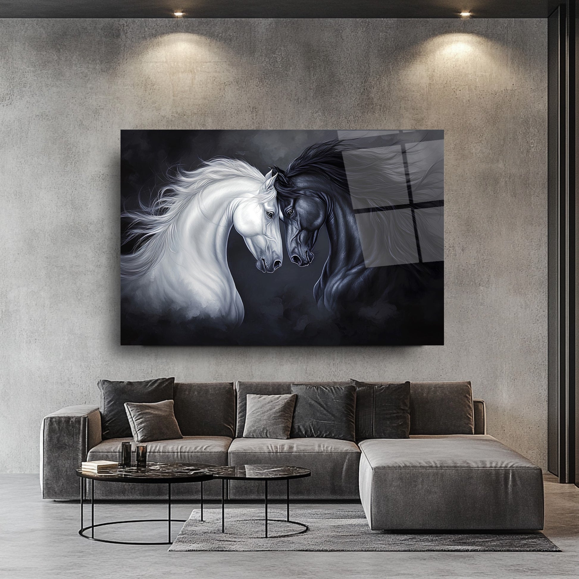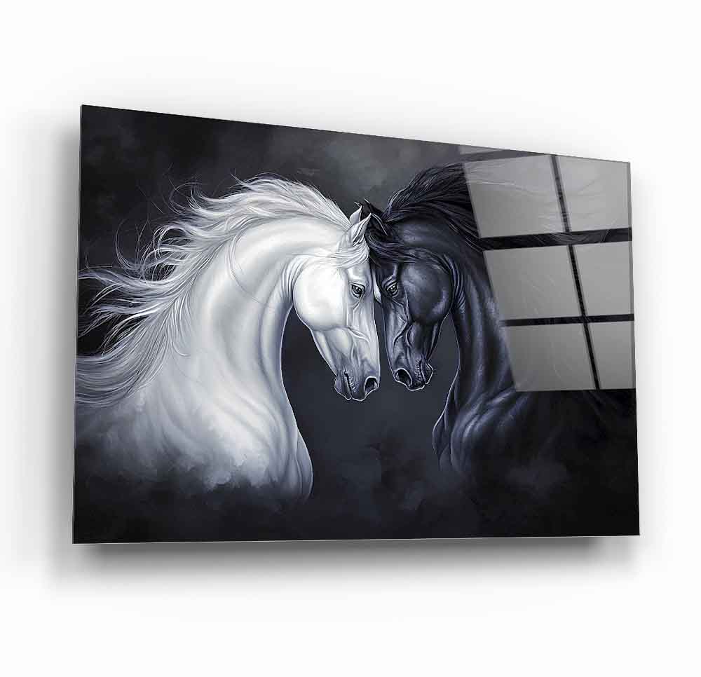 Çarpıcı siyah zemin üzerine bağlanmış siyah-beyaz at çiftinin uyumlu silueti, bu tabloyu güçlü ve zarif bir vurgu haline getiriyor. Yüz ifadelerindeki detaylar ve simetrik yerleşim mekâna dinginlik ve denge katarken, modern ve estetik bir atmosfer oluşturur. Ultra-clear temperli cam üzerindeki UV baskı sayesinde kontrastlı tonlar solmadan uzun süre canlı kalır. Çerçevesiz minimal tasarımı ile ofis, salon veya yatak odasına şıklık ve karakter arayanlar için ideal bir seçimdir.