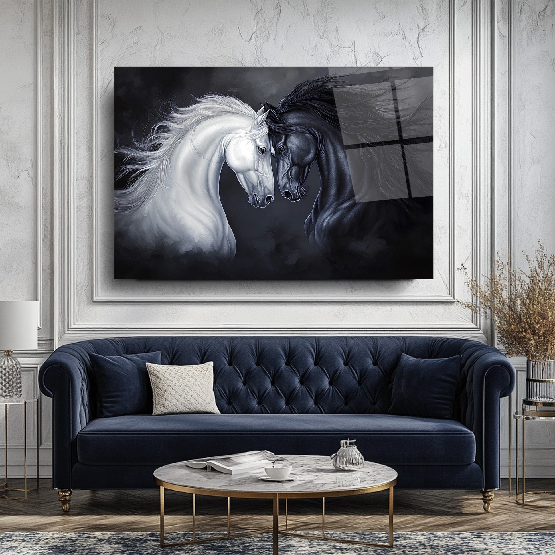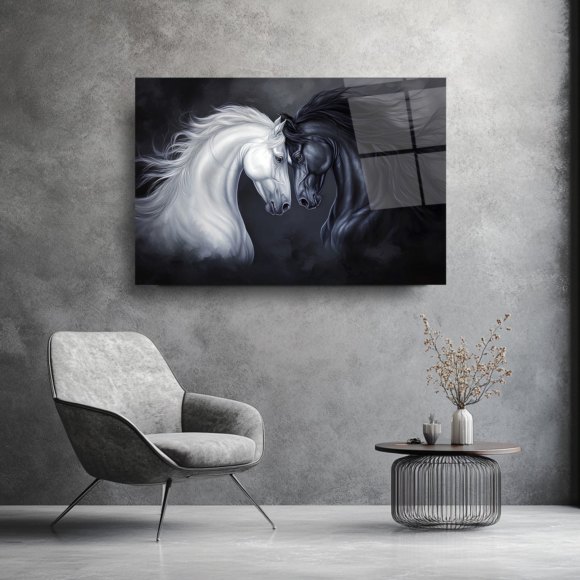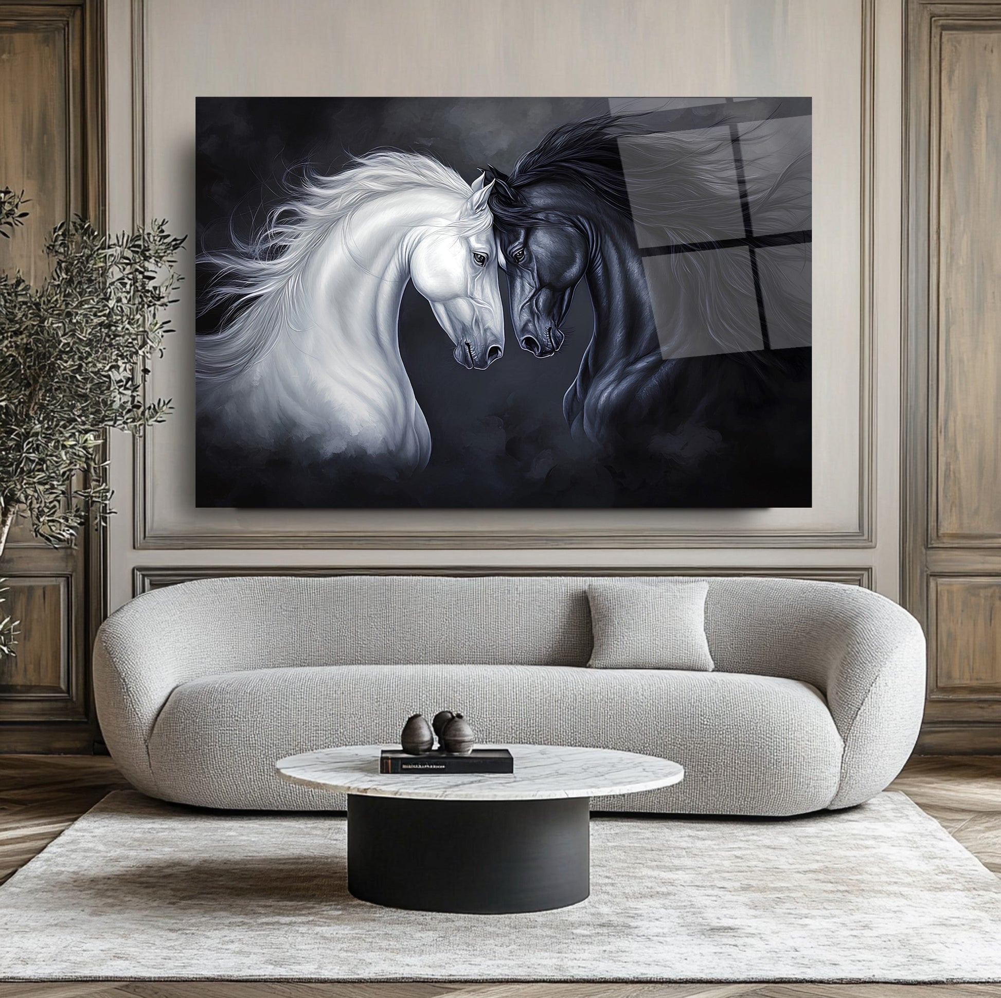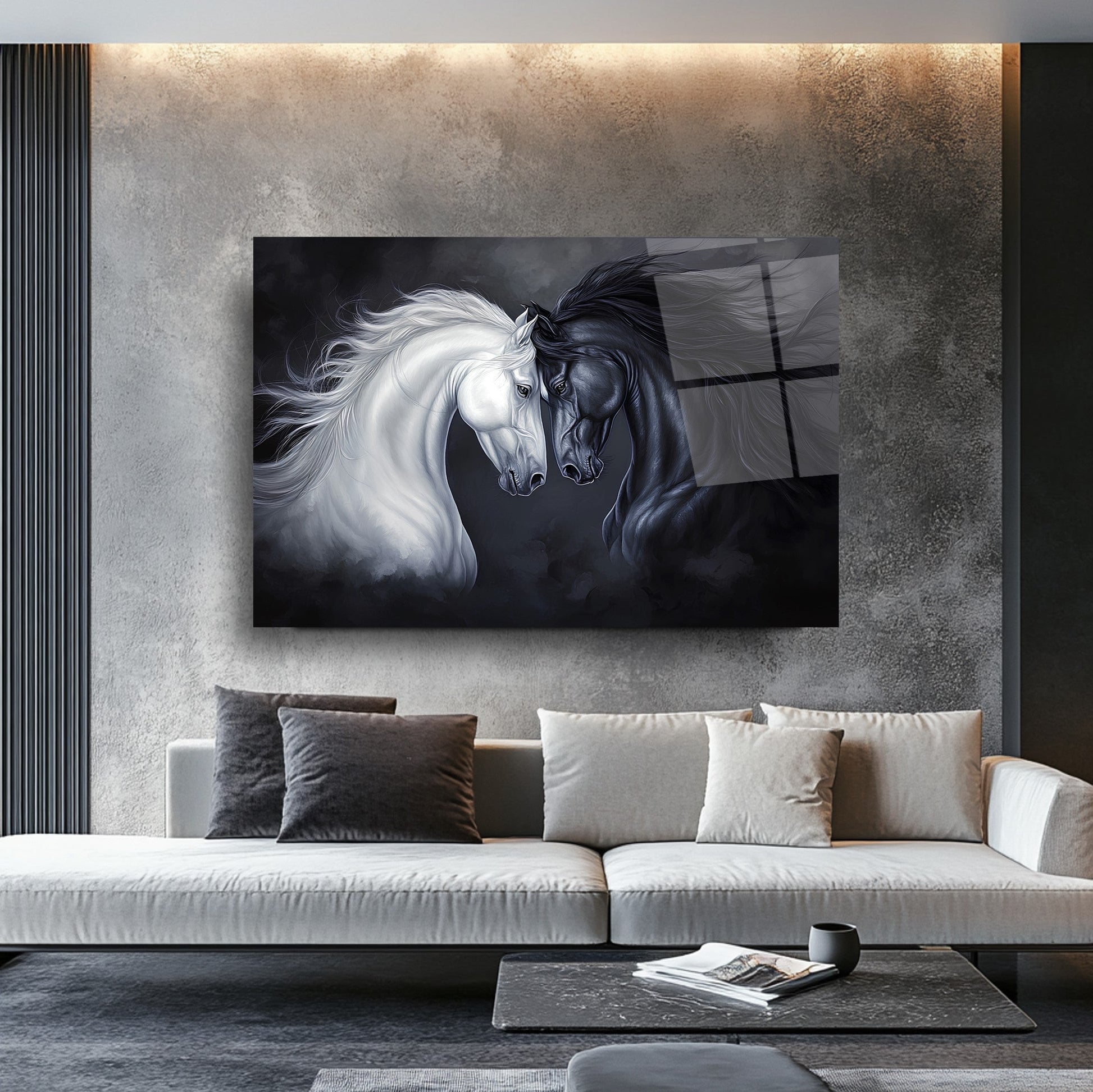 Çarpıcı siyah zemin üzerine bağlanmış siyah-beyaz at çiftinin uyumlu silueti, bu tabloyu güçlü ve zarif bir vurgu haline getiriyor. Yüz ifadelerindeki detaylar ve simetrik yerleşim mekâna dinginlik ve denge katarken, modern ve estetik bir atmosfer oluşturur. Ultra-clear temperli cam üzerindeki UV baskı sayesinde kontrastlı tonlar solmadan uzun süre canlı kalır. Çerçevesiz minimal tasarımı ile ofis, salon veya yatak odasına şıklık ve karakter arayanlar için ideal bir seçimdir.