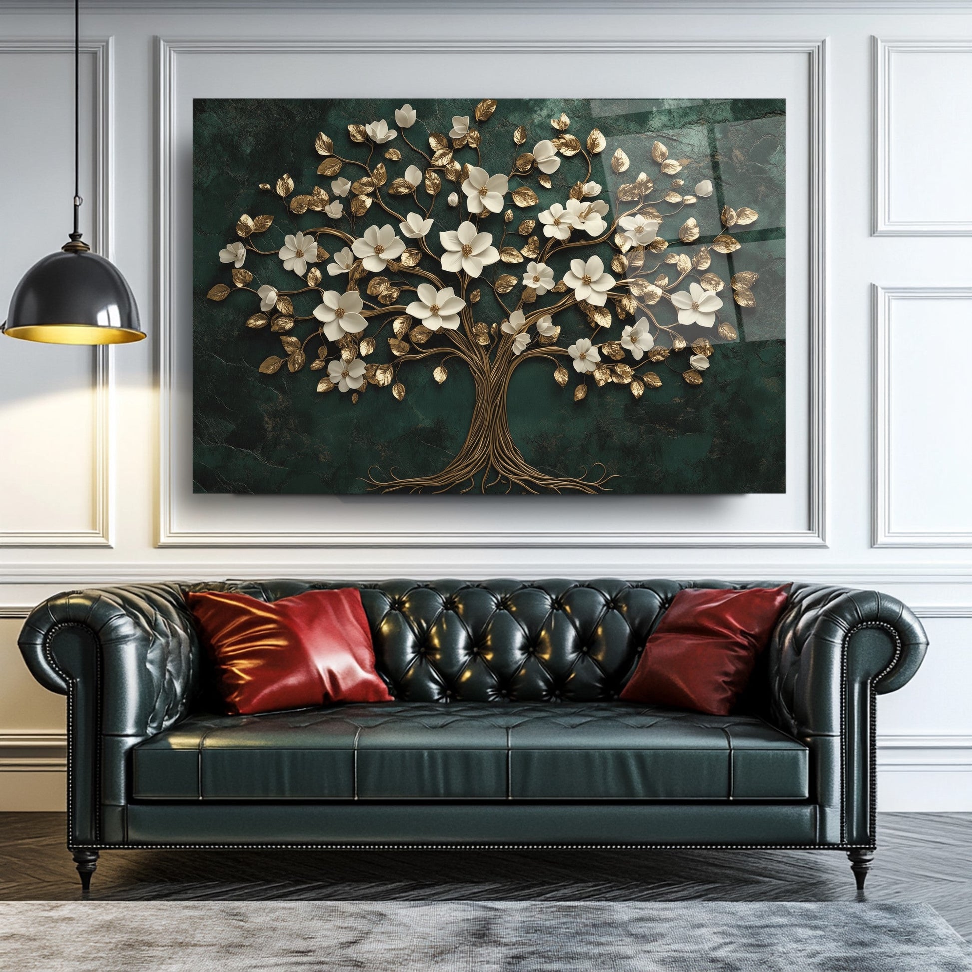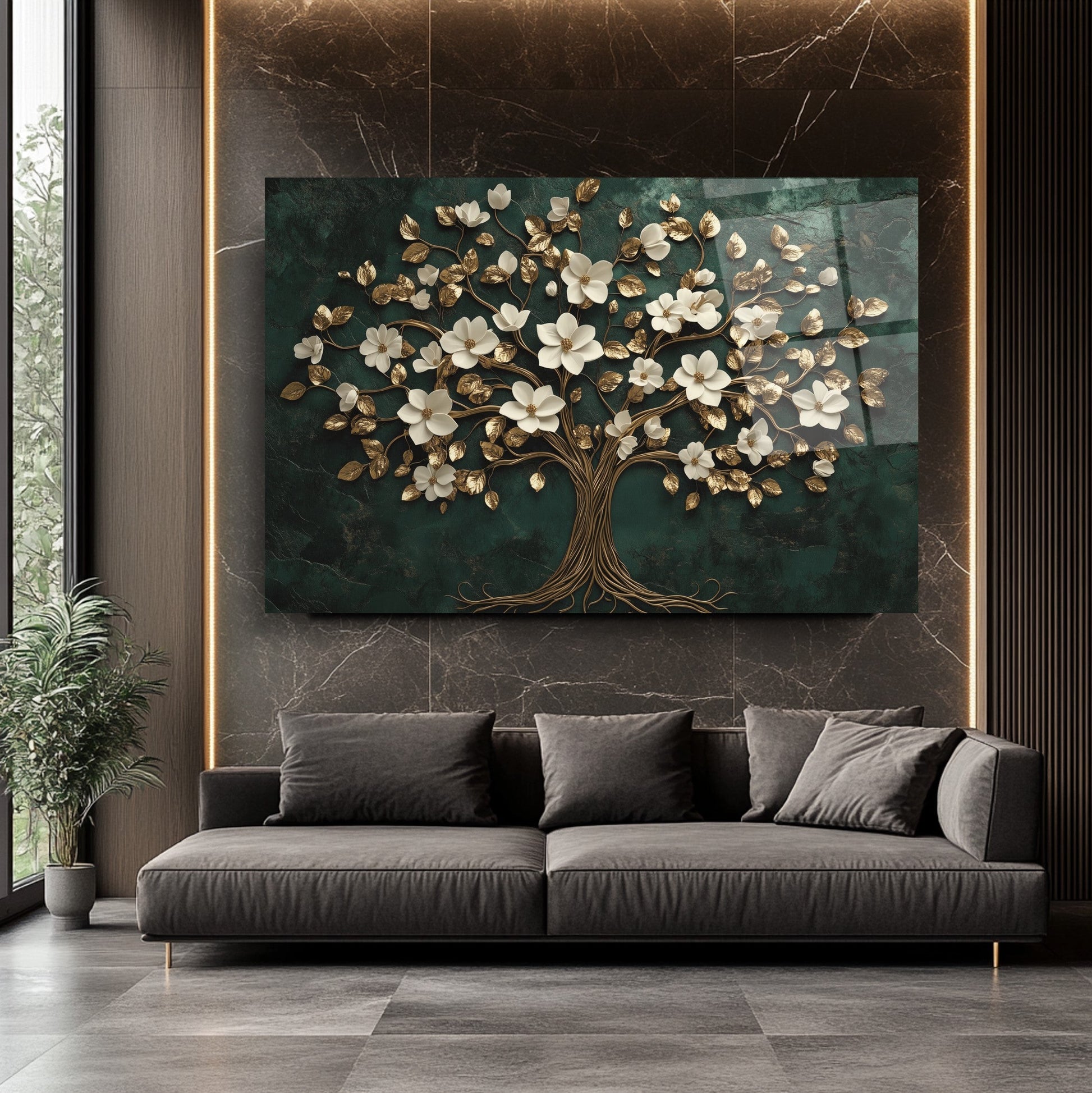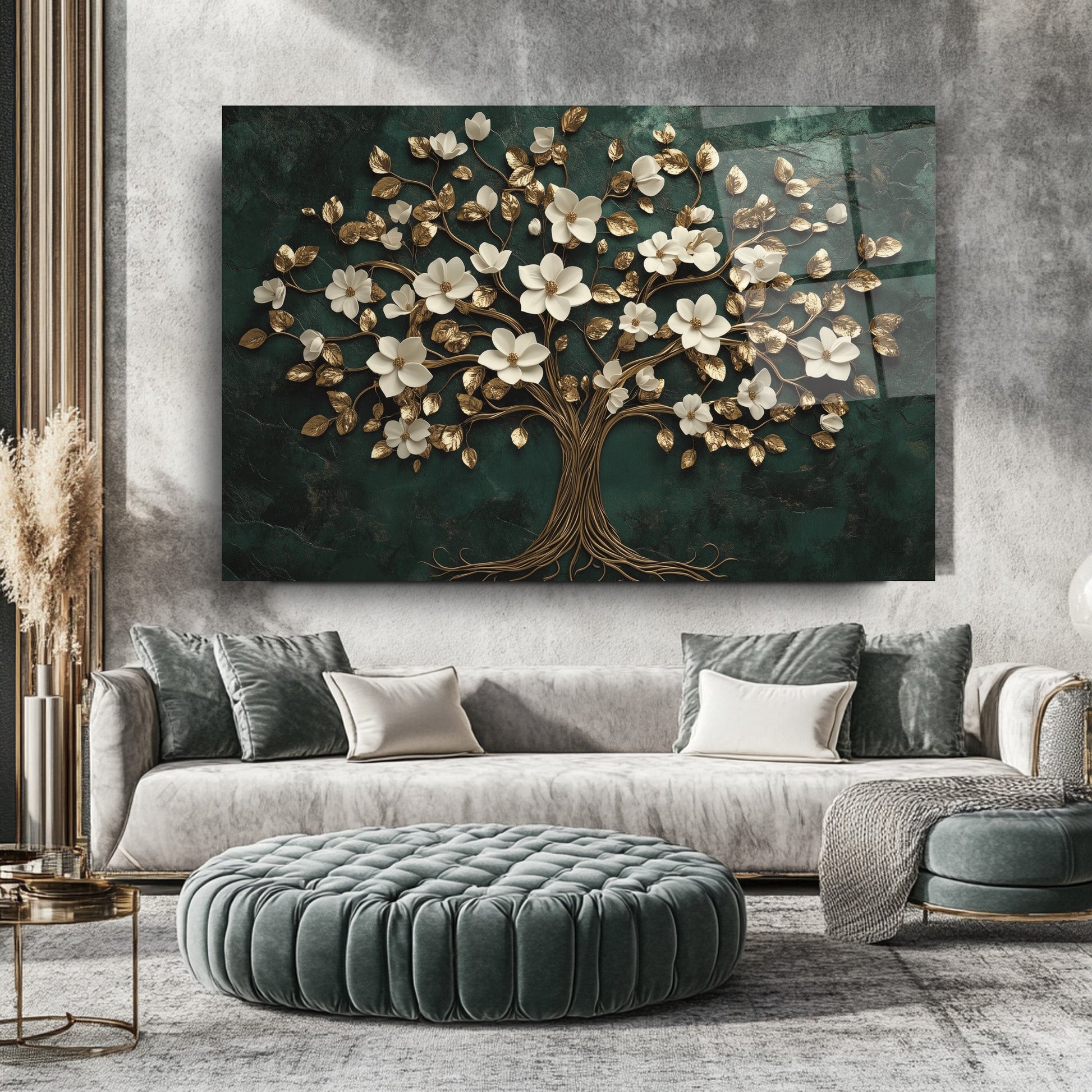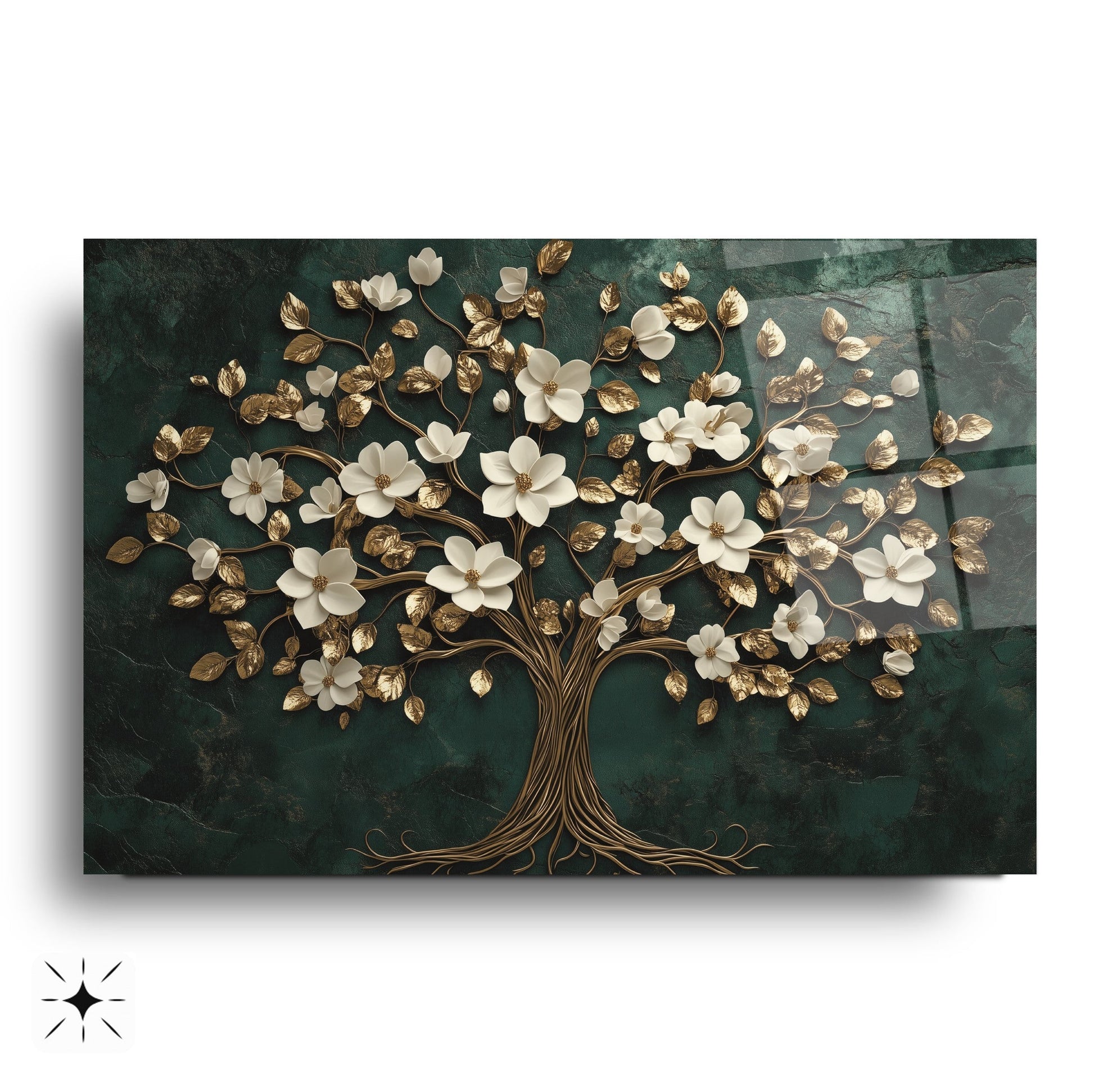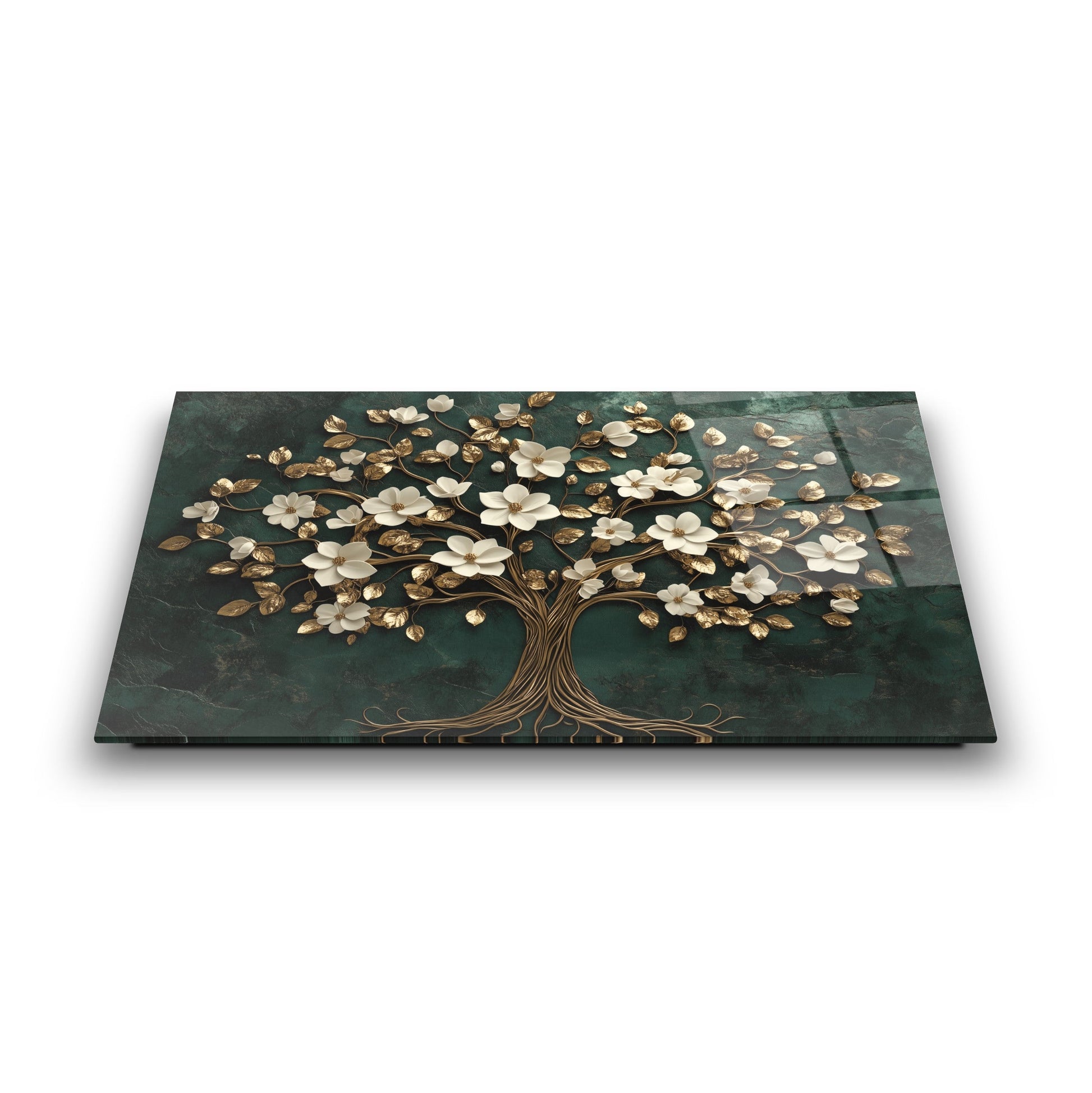 Mekanlarınıza Yeşil Bir Bahar Canlılığı: Yeşil Arkaplan Beyaz Çiçekli Hayat Ağacı Cam Tablo