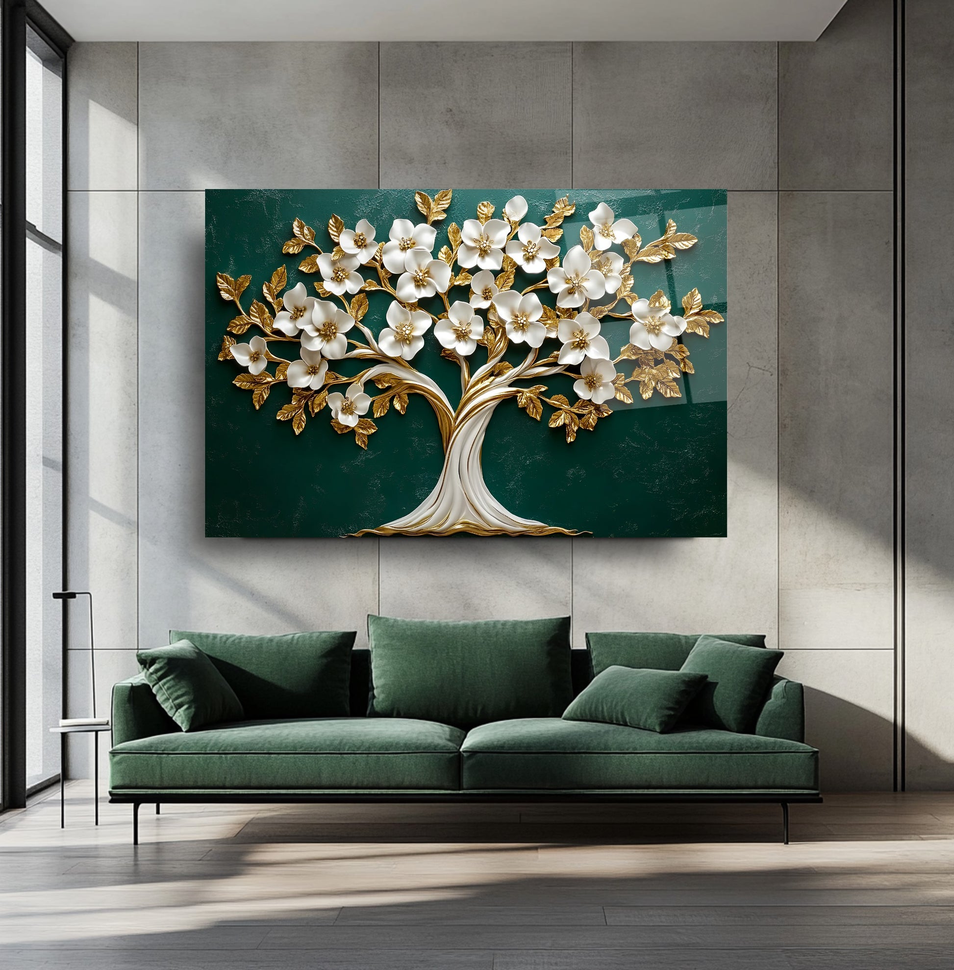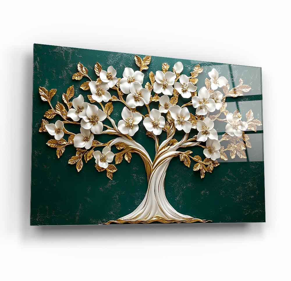Mekanlarınıza Yeşil Bir Bahar Canlılığı: Yeşil Arkaplan Çiçekli Gold Beyaz Hayat Ağacı Cam Tablo
