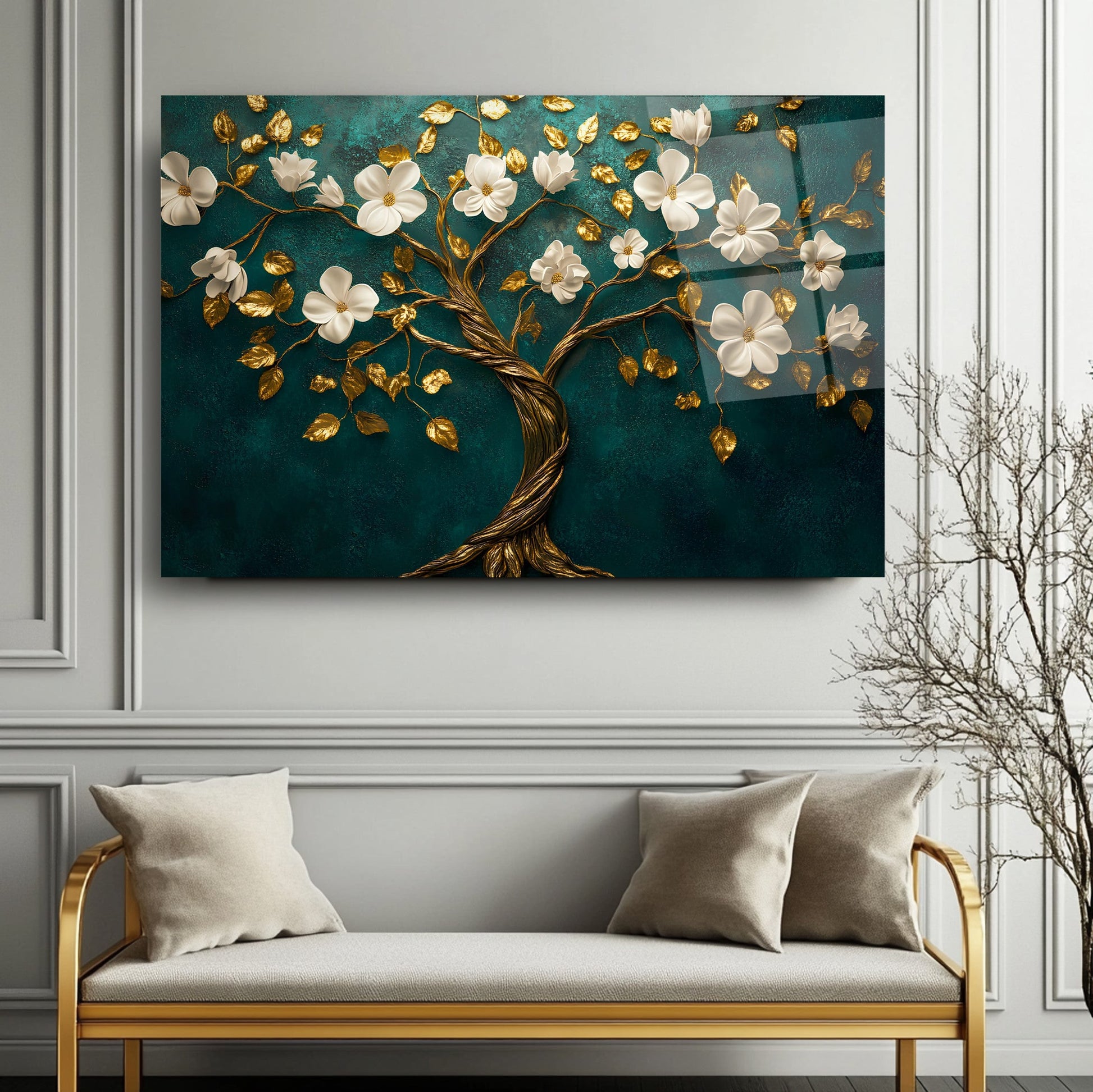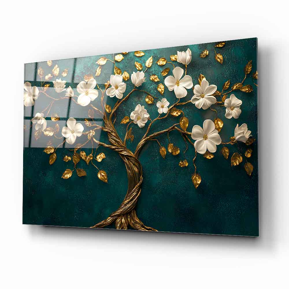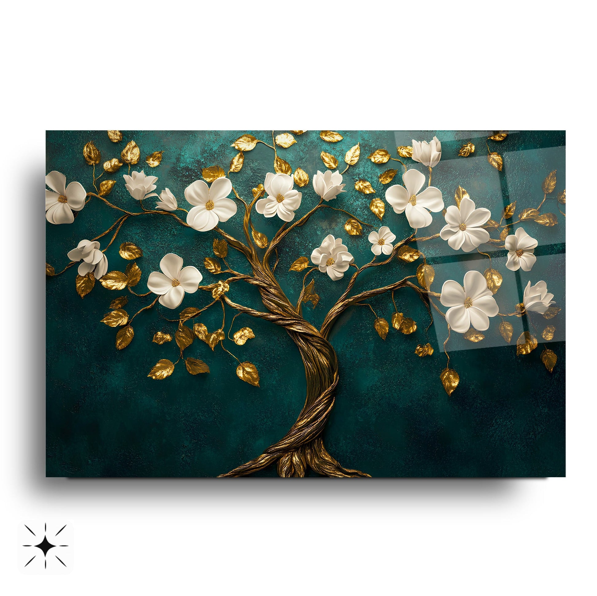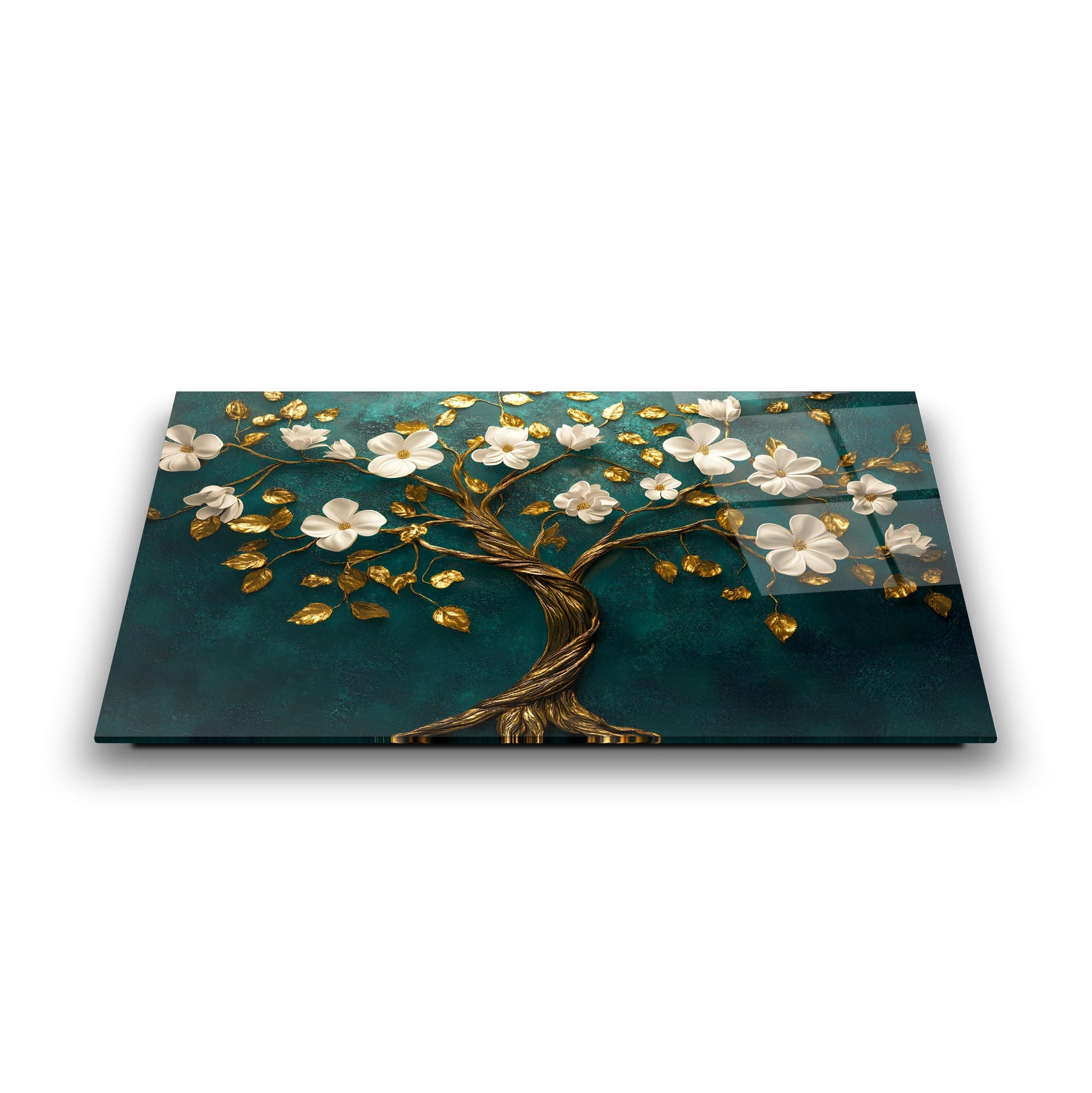 Mekanlarınıza Yeşil ve Altın Işıltılı Bir Yaşam Sunun: Yeşil Arkaplan Çiçekli Gold Beyaz Hayat Ağacı Cam Tablo