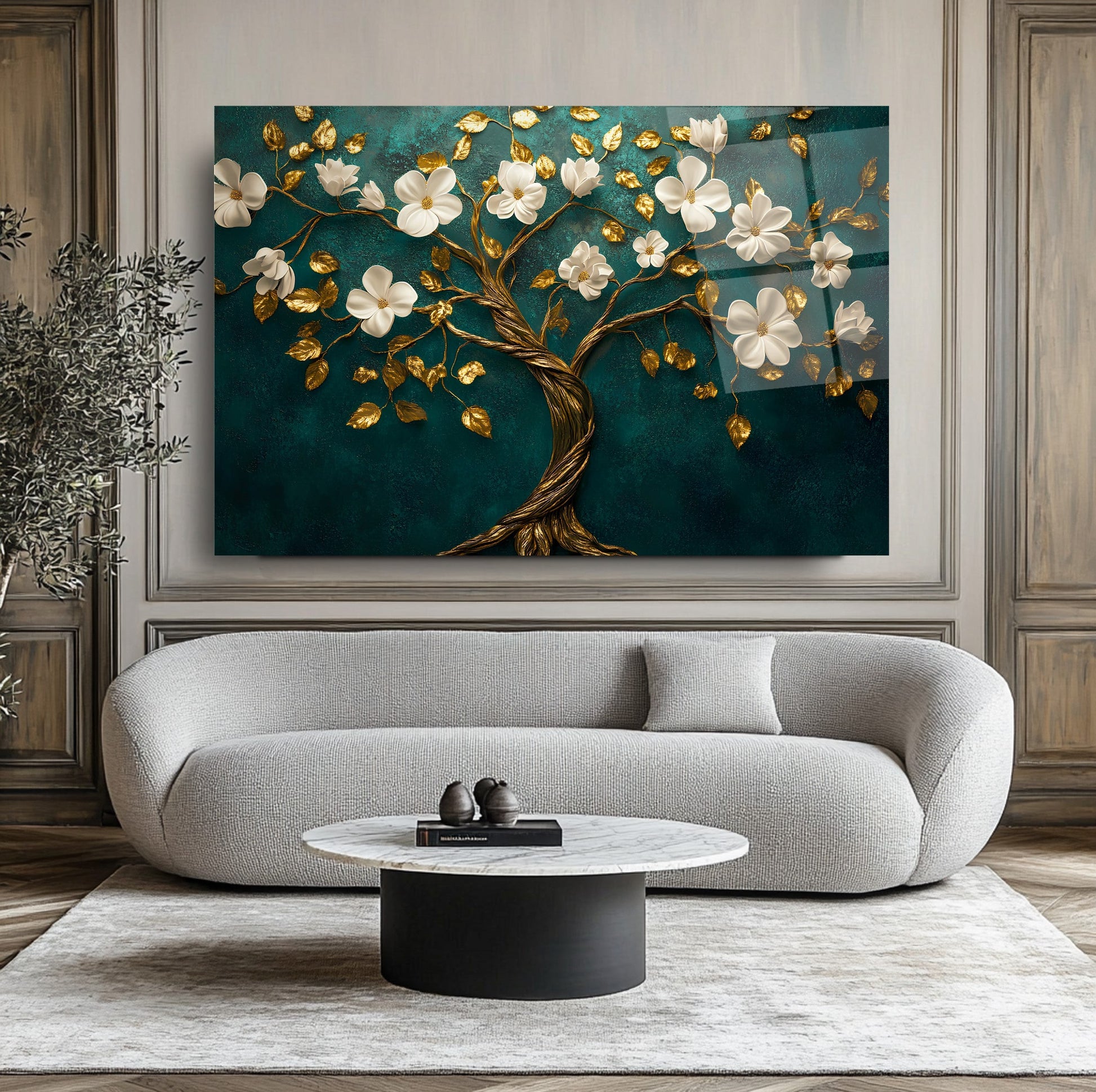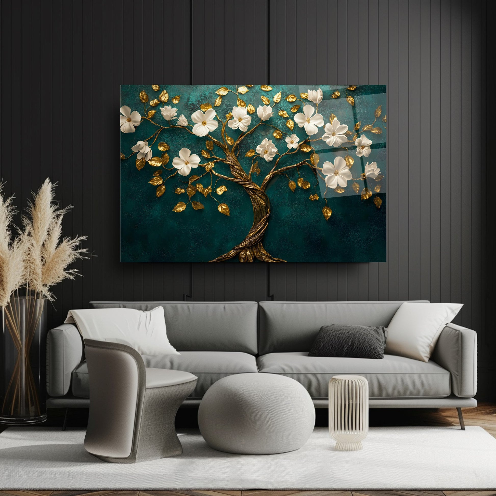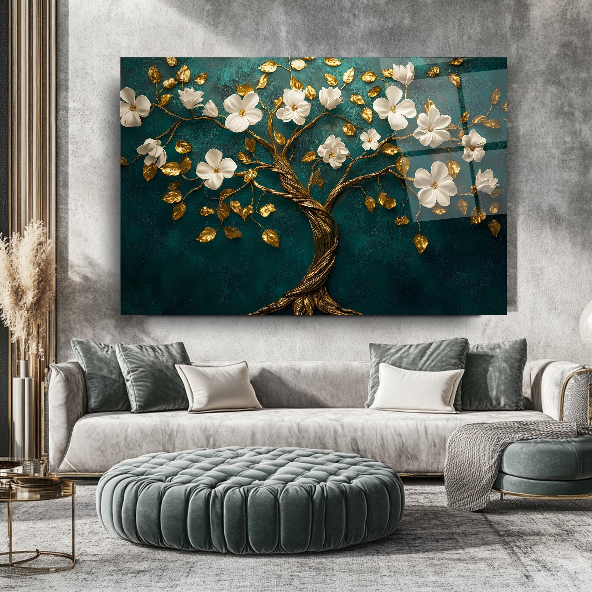 Mekanlarınıza Yeşil ve Altın Işıltılı Bir Yaşam Sunun: Yeşil Arkaplan Çiçekli Gold Beyaz Hayat Ağacı Cam Tablo