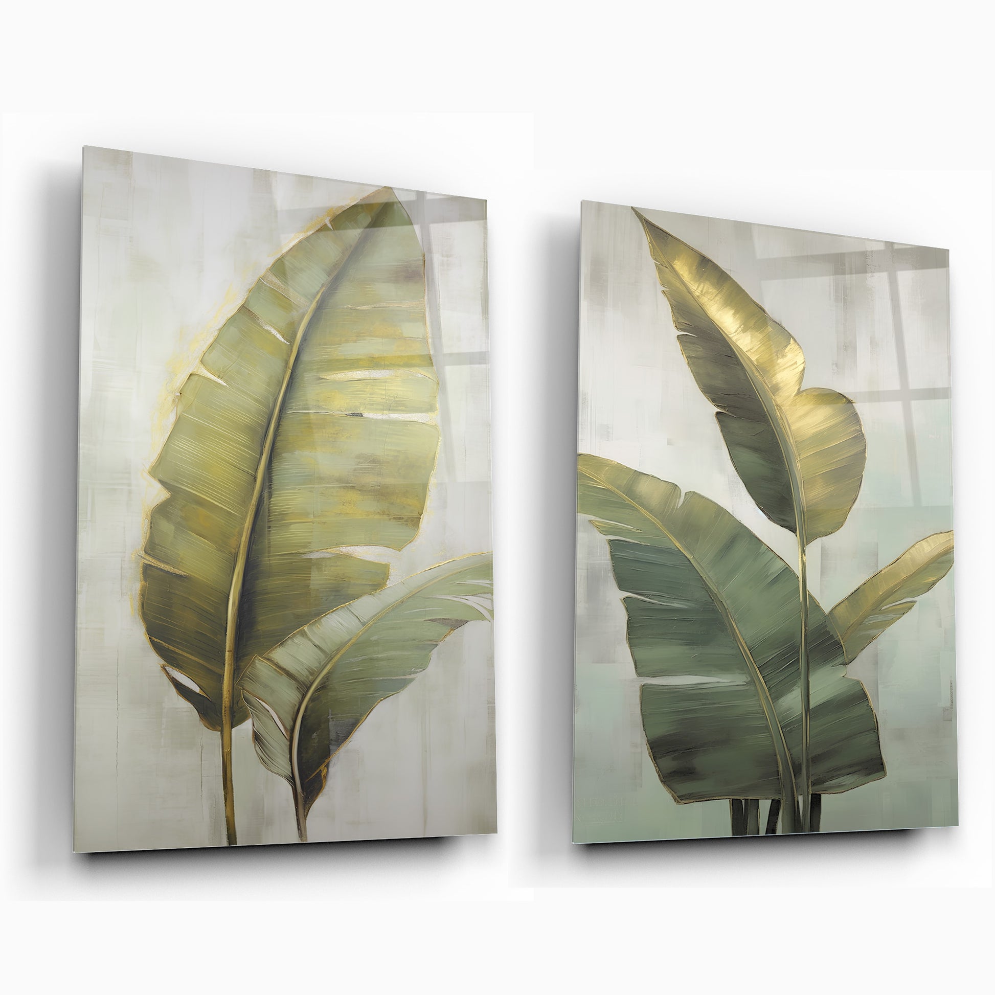 Yeşil Gold Yapraklar İkili Set Cam Tablo