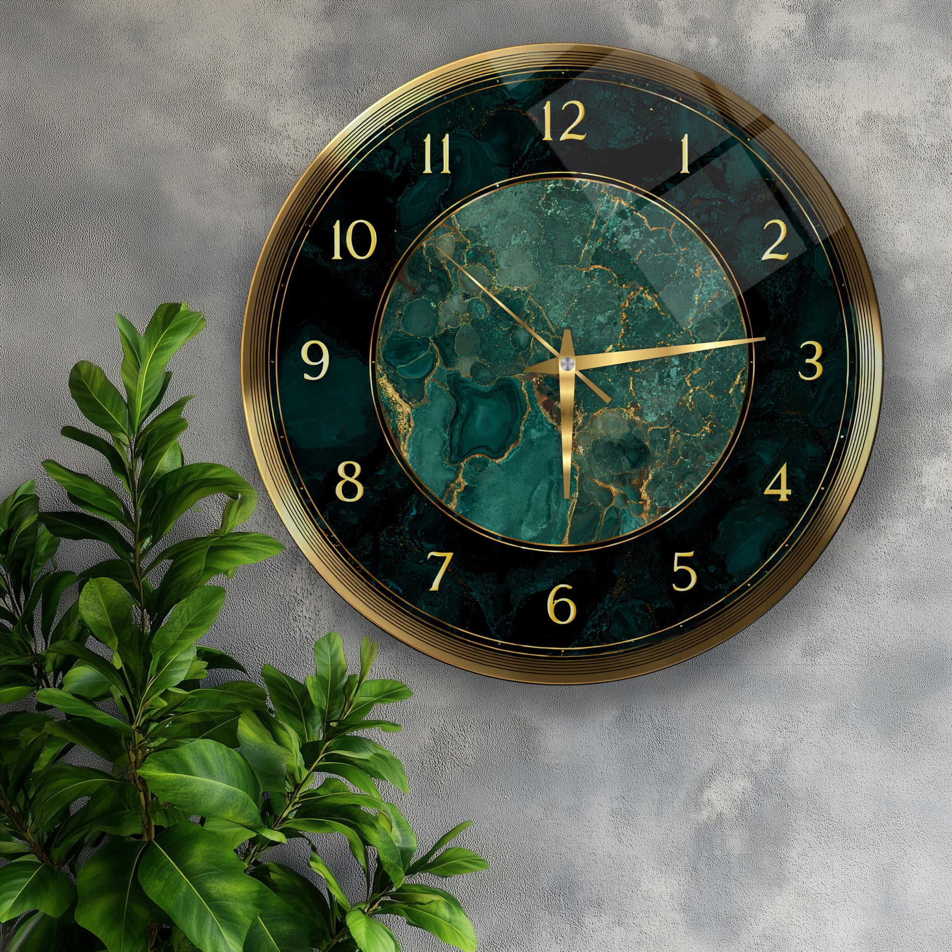 Yeşil Gold Mermer Desen Cam Duvar Saati