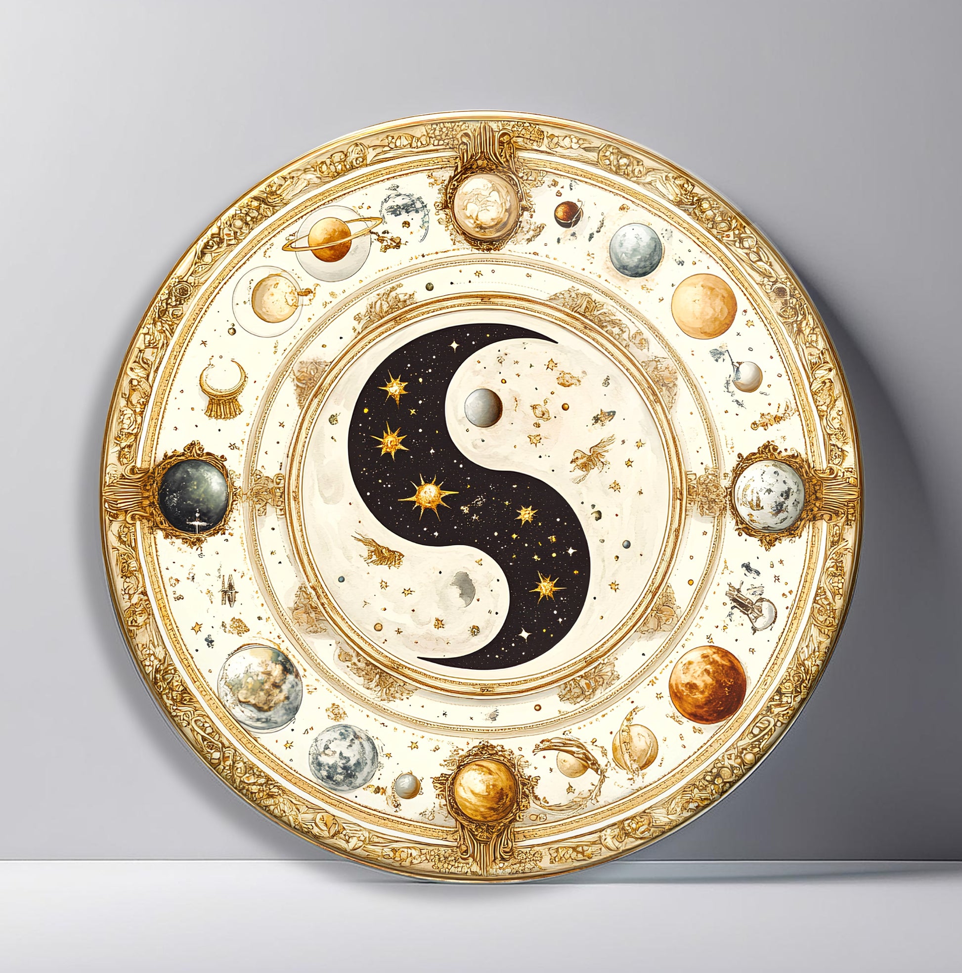 Ying Yang ve Gezegenler Yuvarlak Cam Tablo